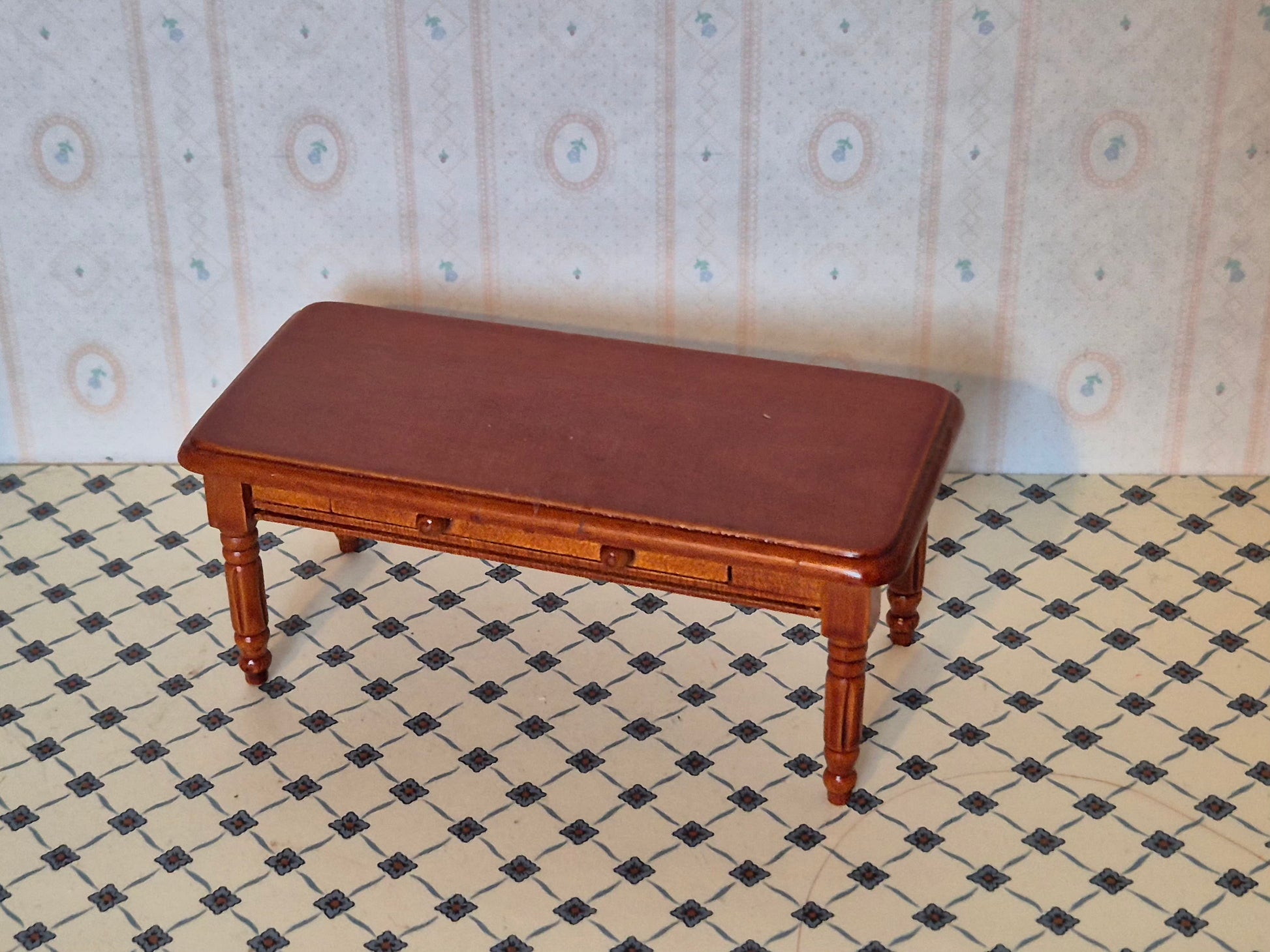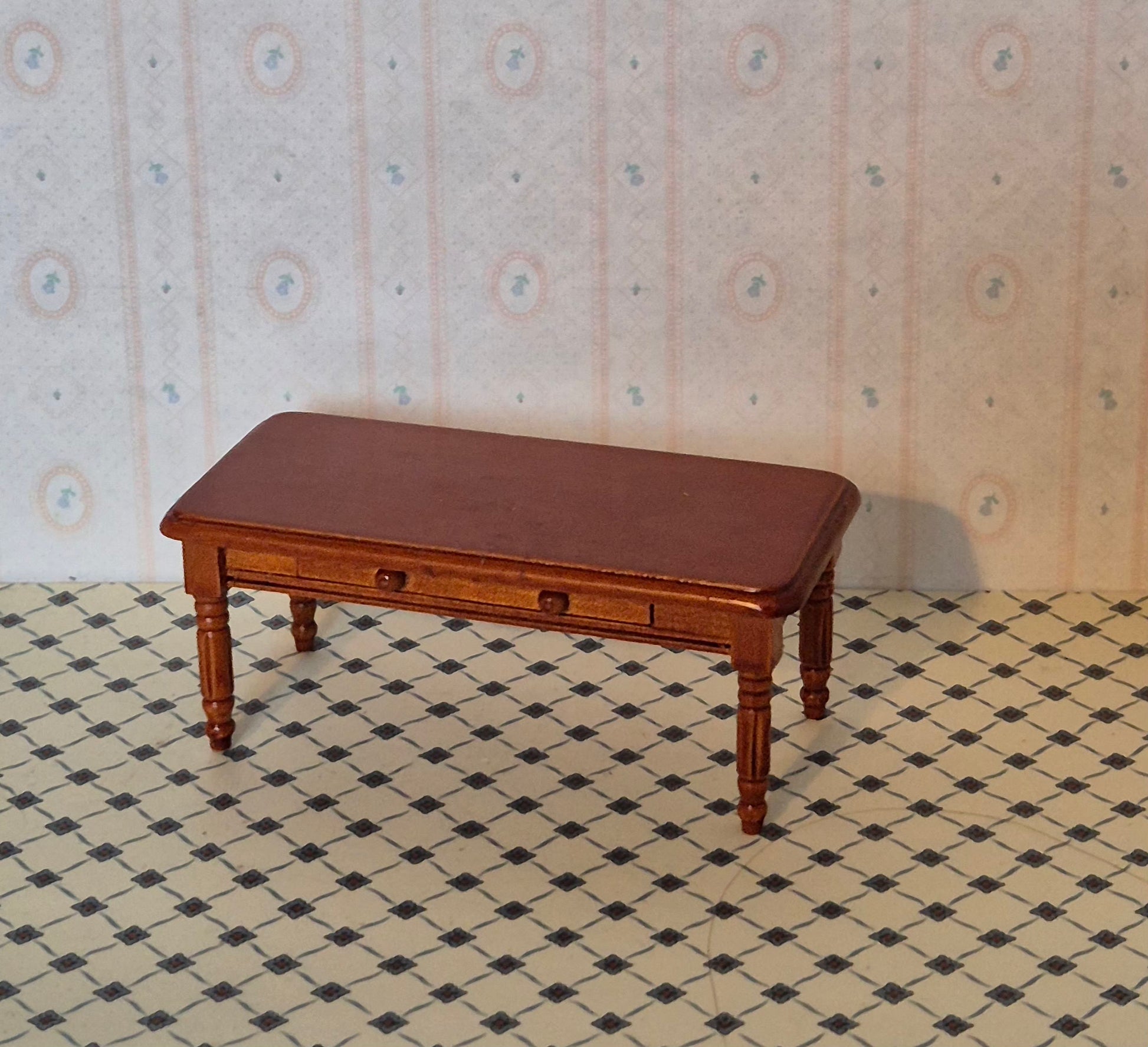 Sofabord 1:12 i lysebrun nuance. Den har en pæn skuffe, der åbnes. Udmærket stand.
