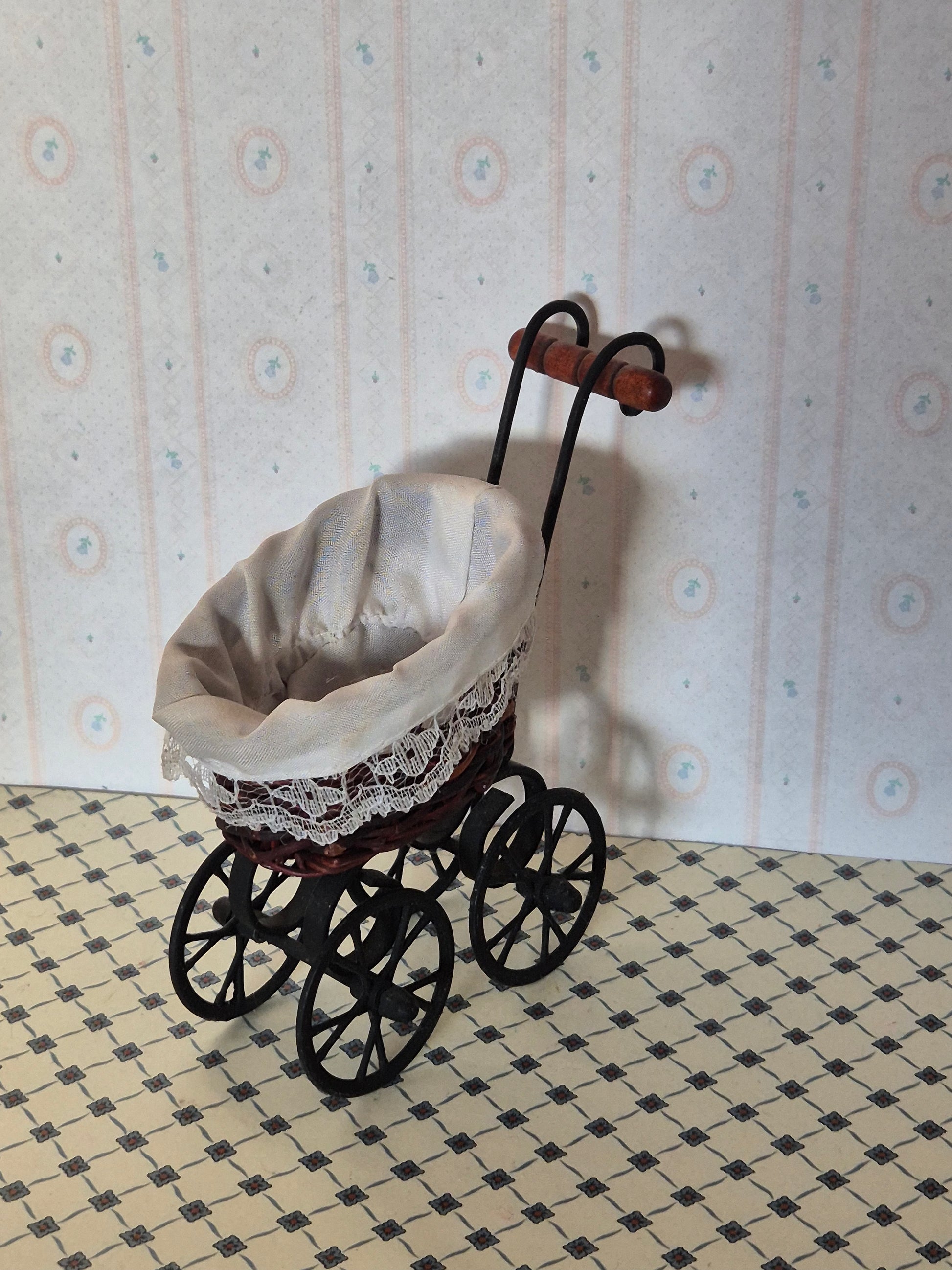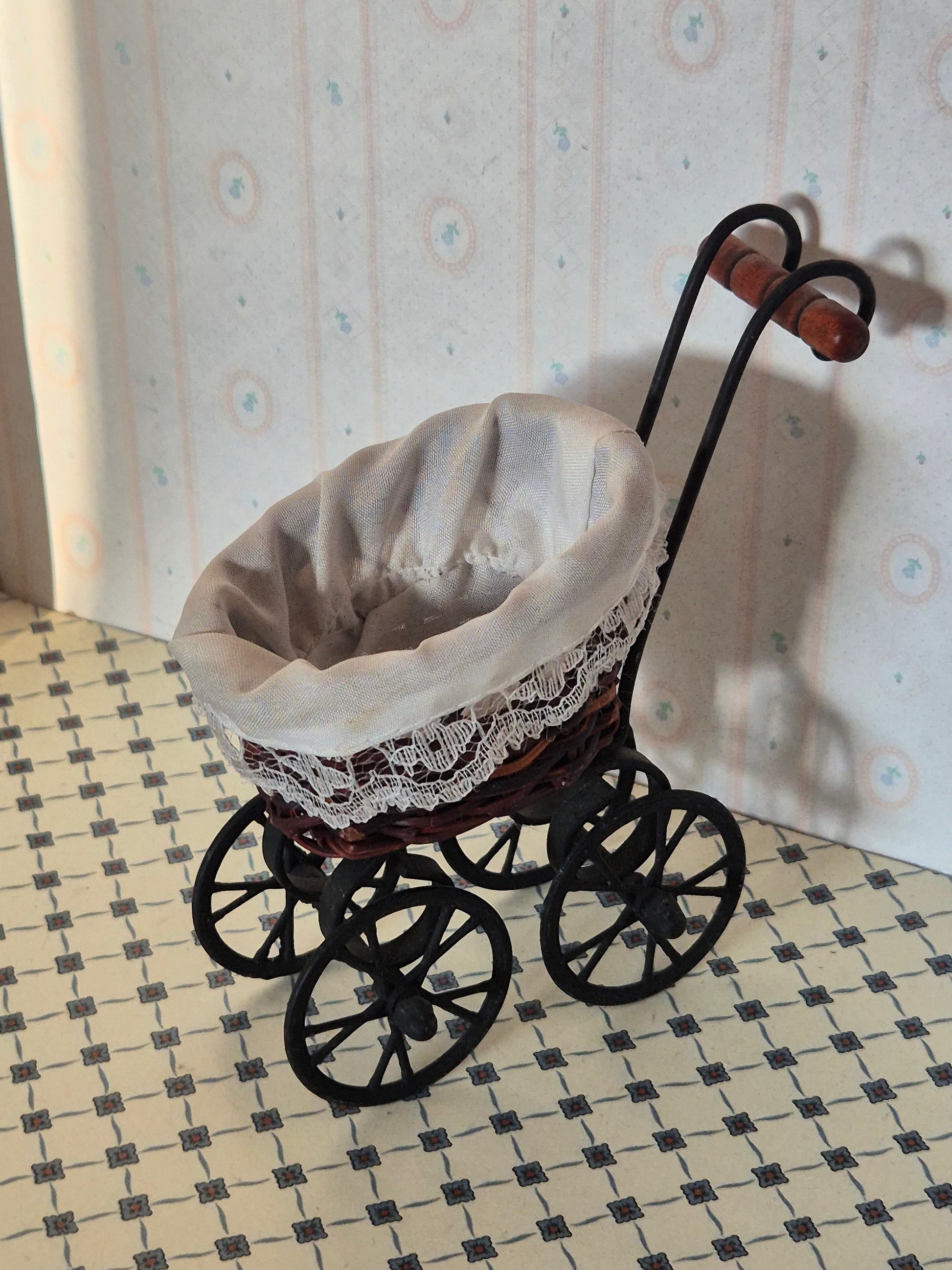 Vintage 1:10 barnevogn af metal og flet med stof og blondekant.