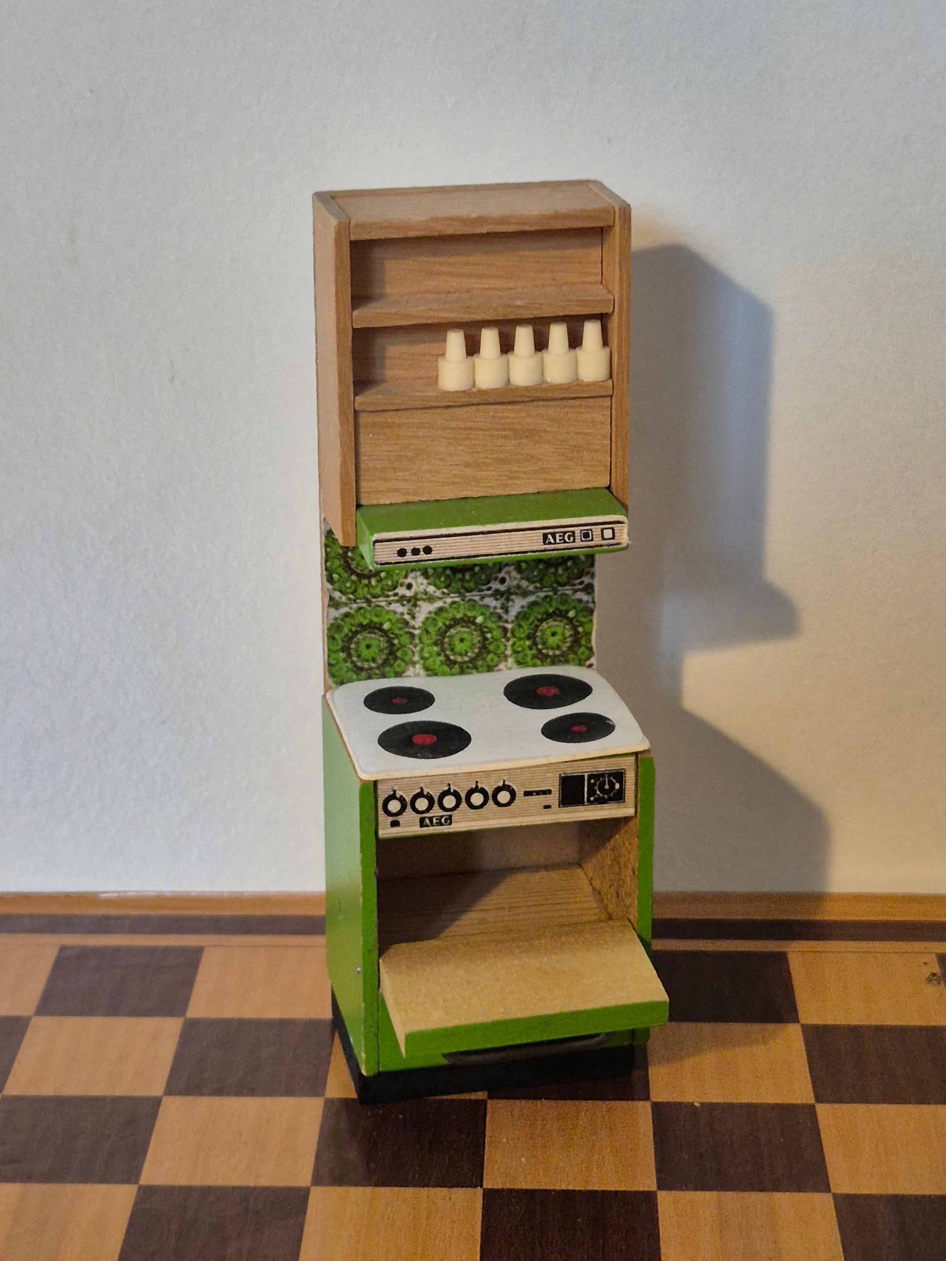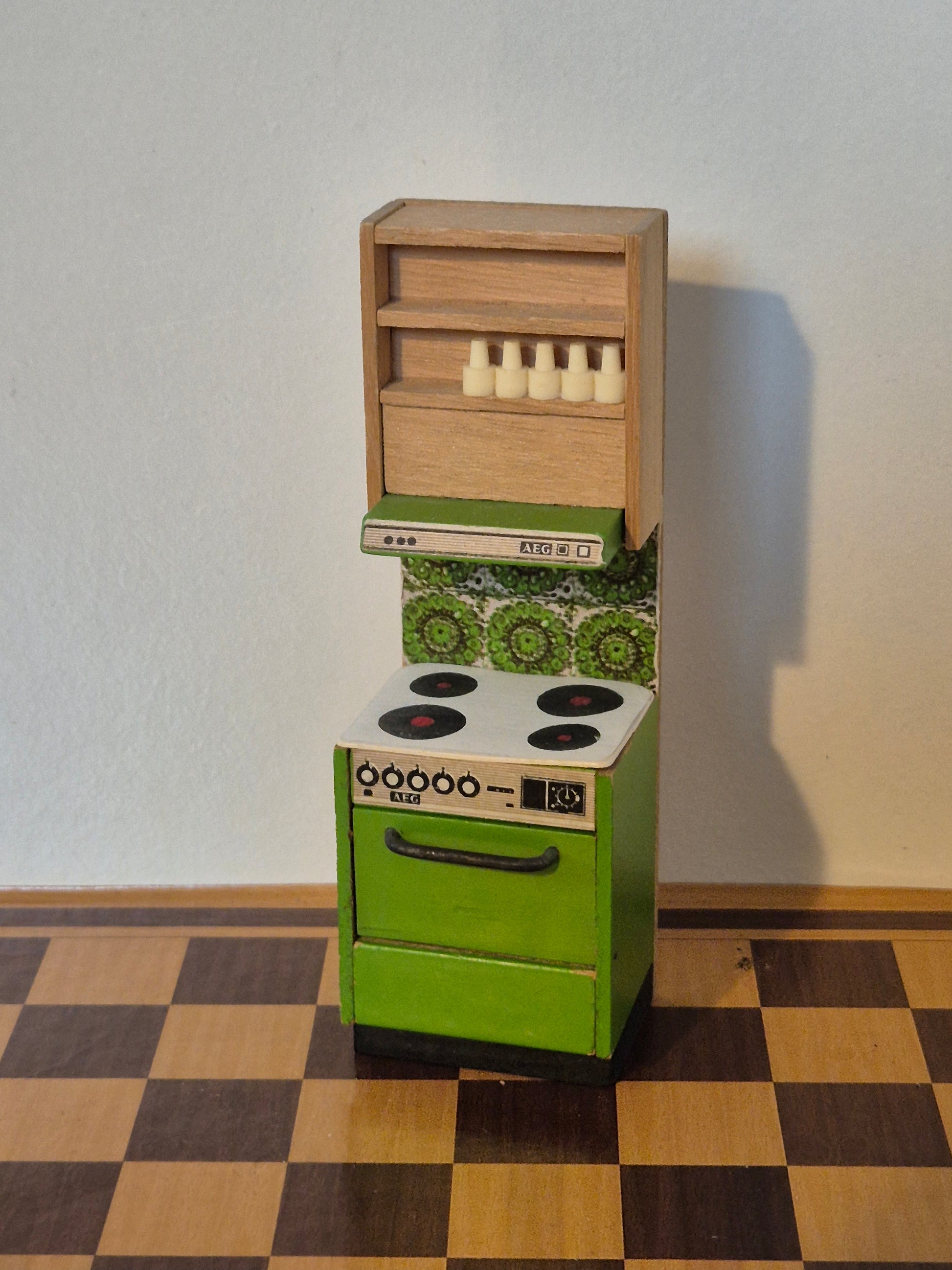 Lisa af Danmark komfur i grøn fra 1970erne i 1:16. Pæn stand, intakt. Der mål forventes patina.