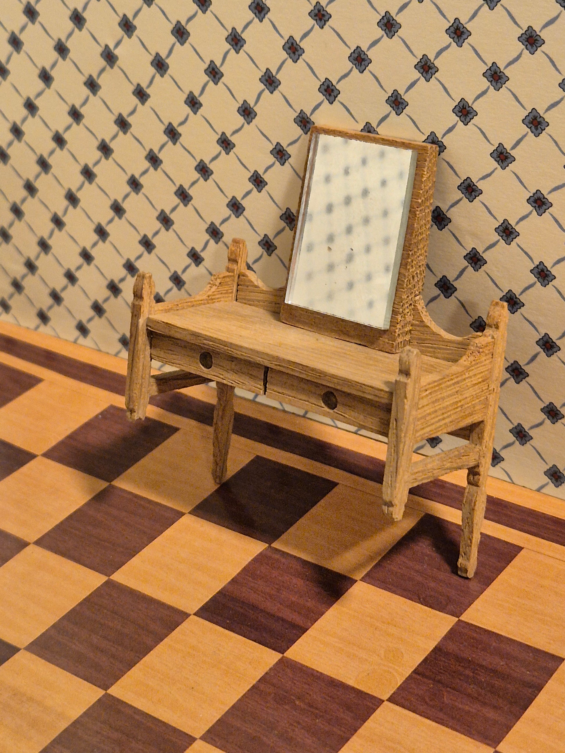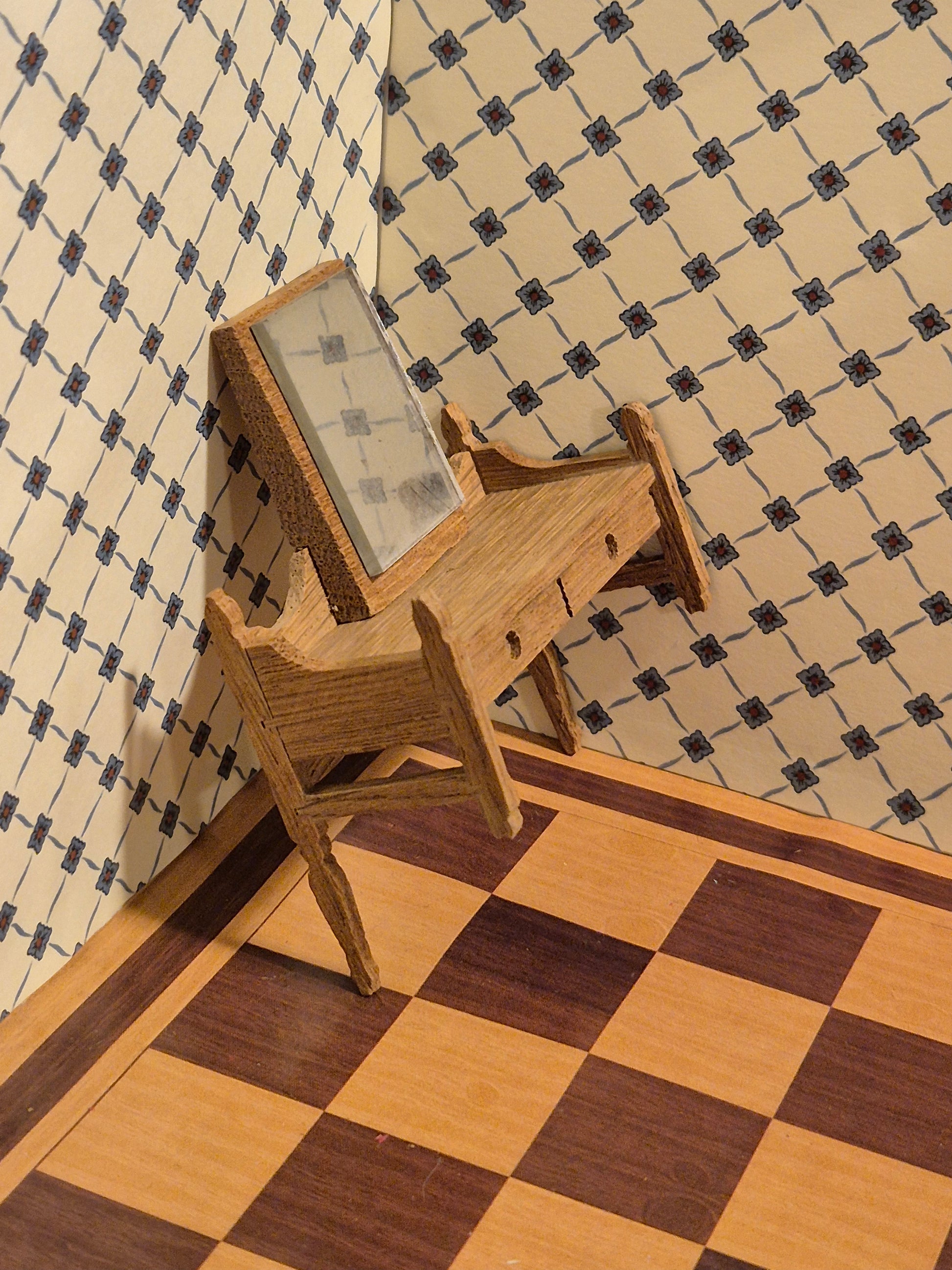 Vintage sminkebord af egetræ, der mangler to ben. Det er af mærket Lisa af Danmark.