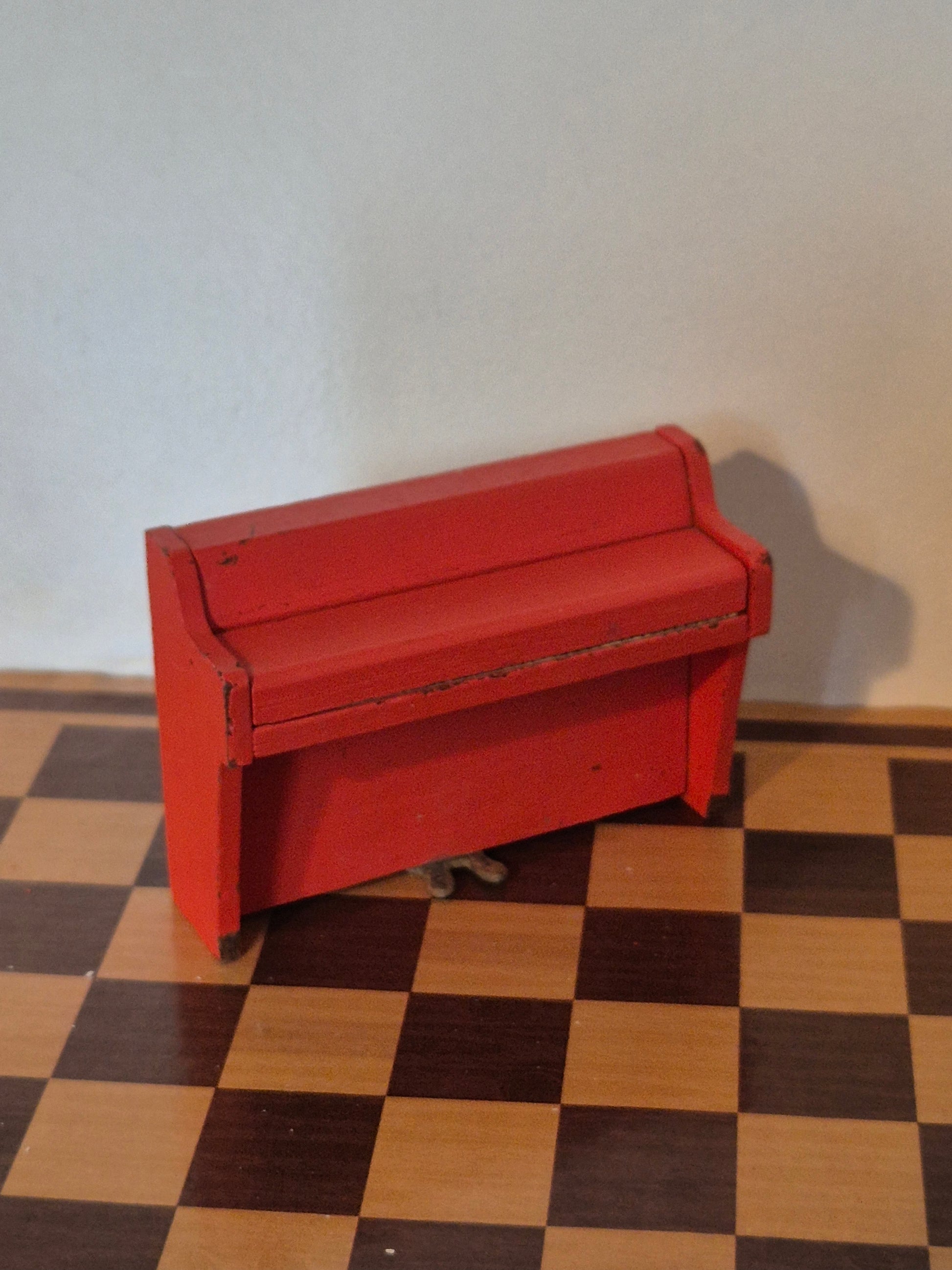 Vintage dukkehus klaver i orangerød nuance af mærket Lundby. Det er fra 1970erne.