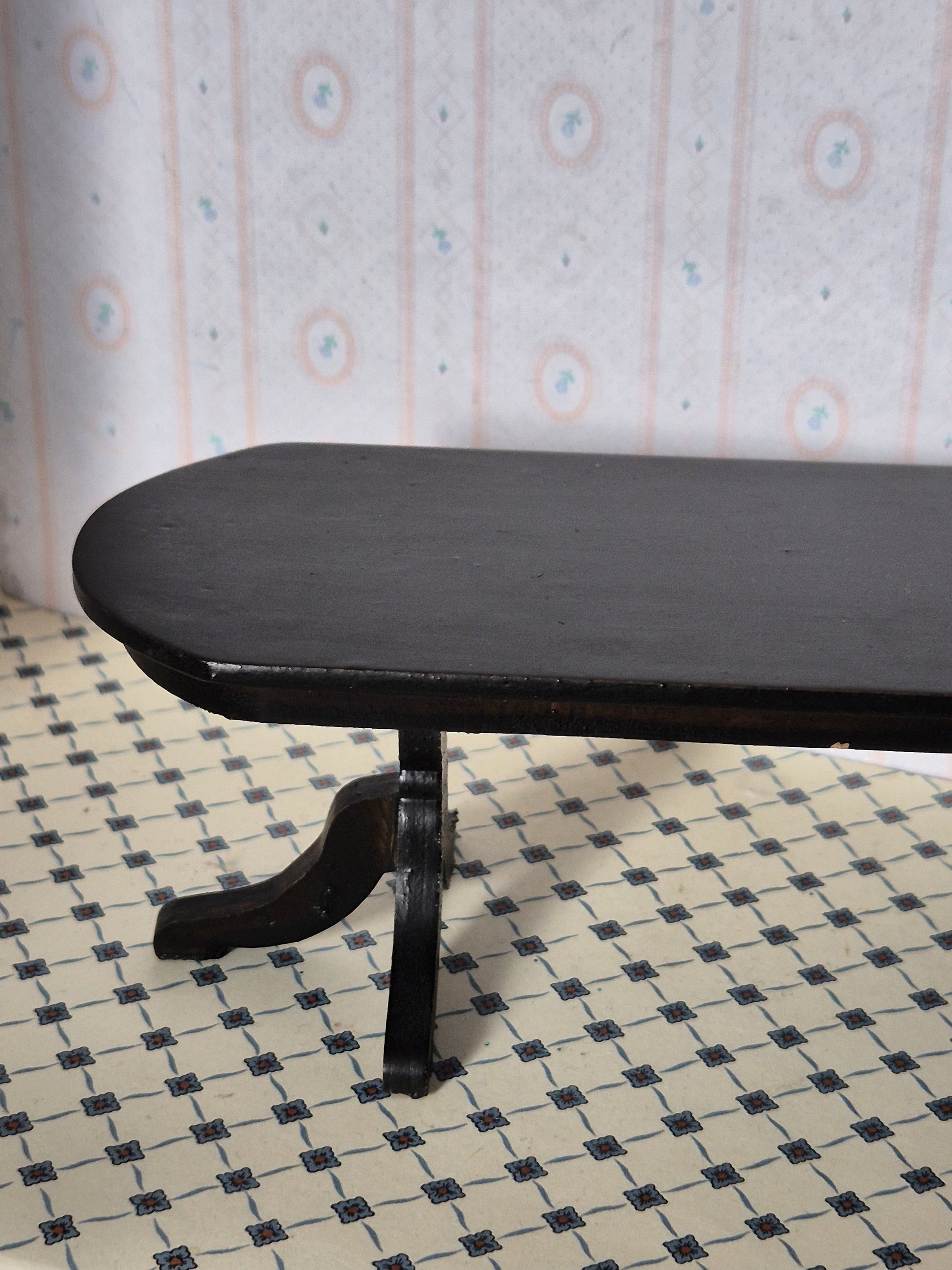 Pænt mørkt 1:14-1:12 spisebord til dukkehuset. Det er i god pæn stand. Der er lidt patina.