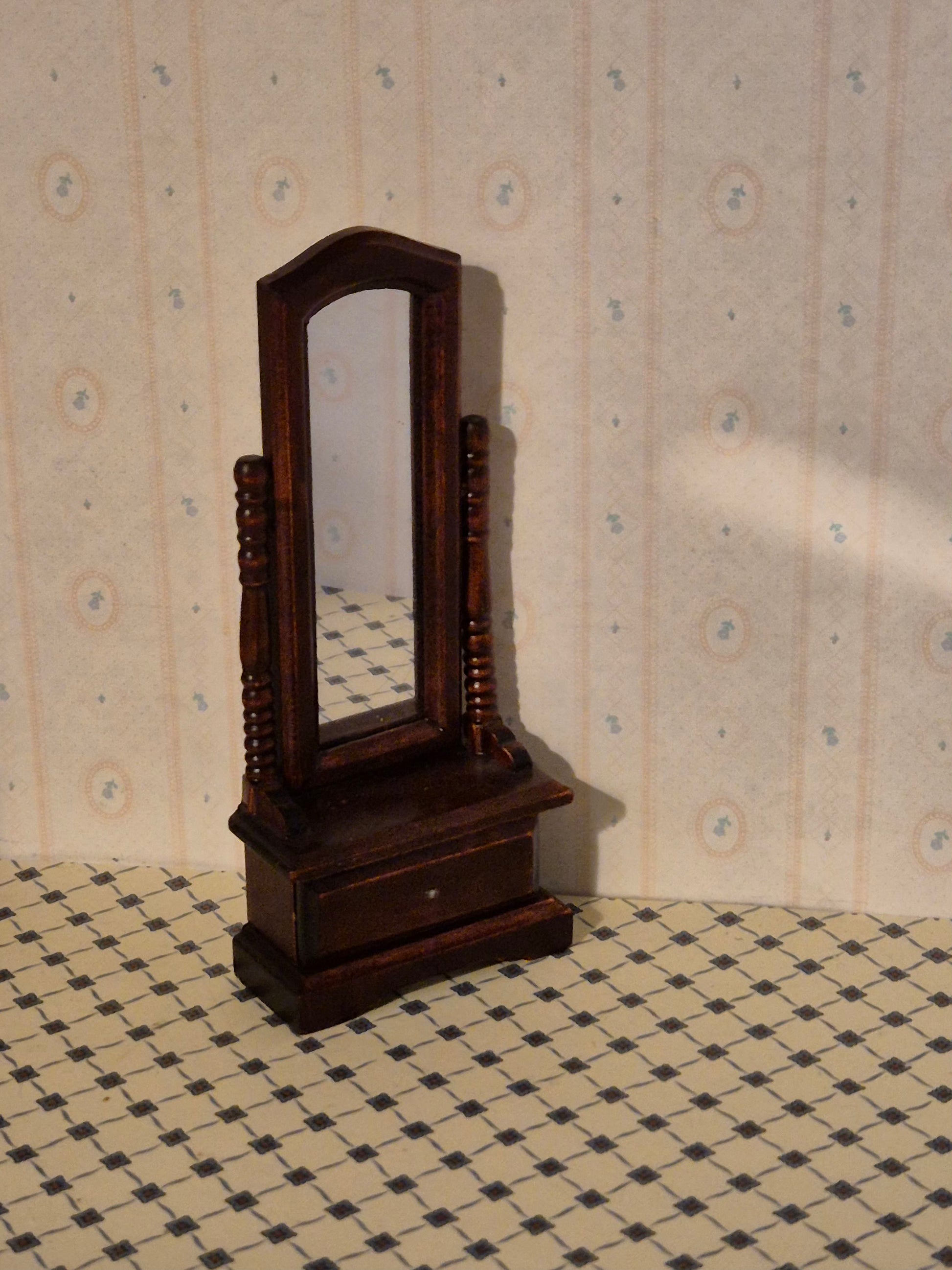Slank model. Sminkebord / spejlmøbel med lille skuffe, der mangler greb. Udmærket stand. Pænt dukkehusmøbel.
