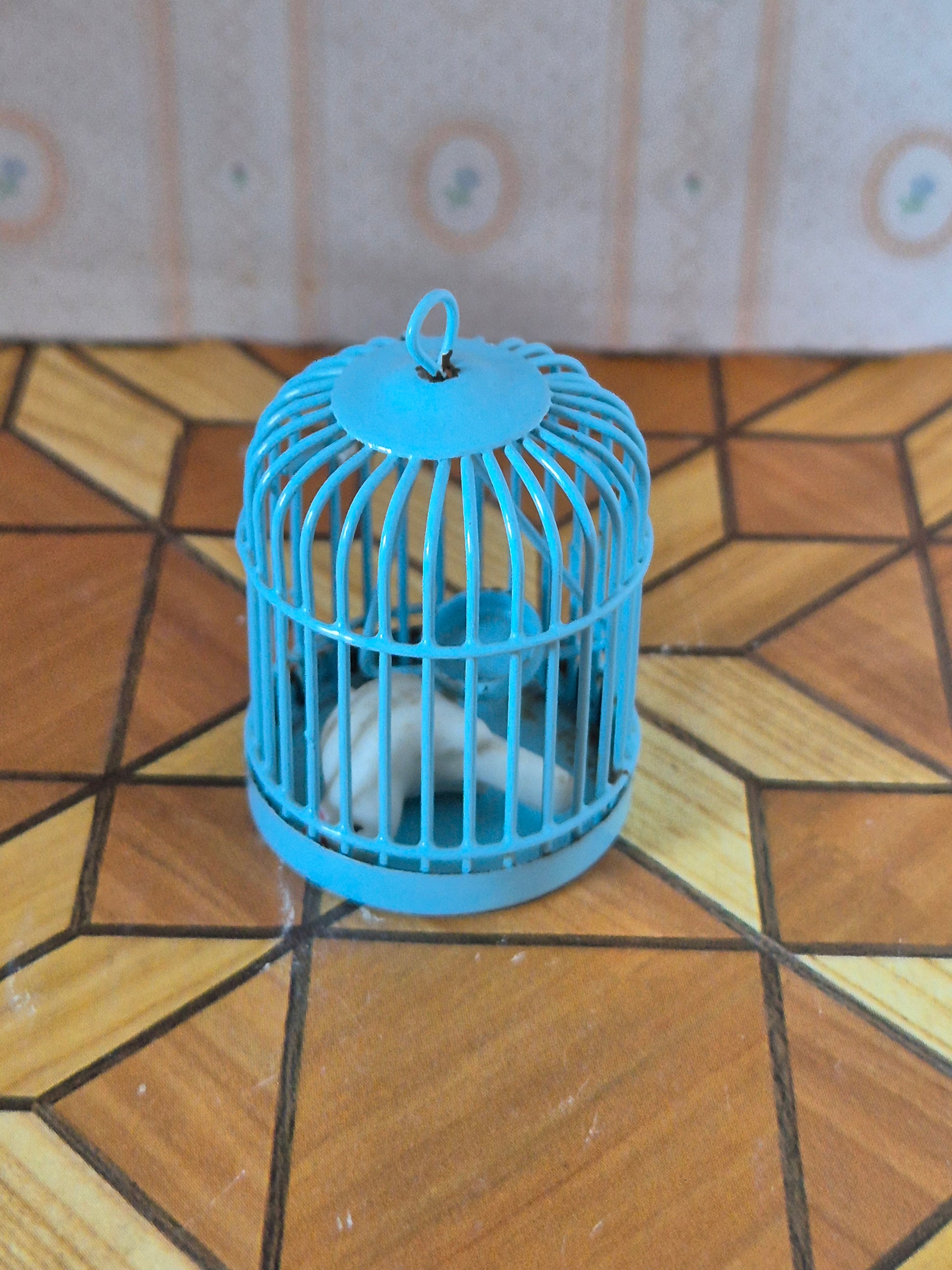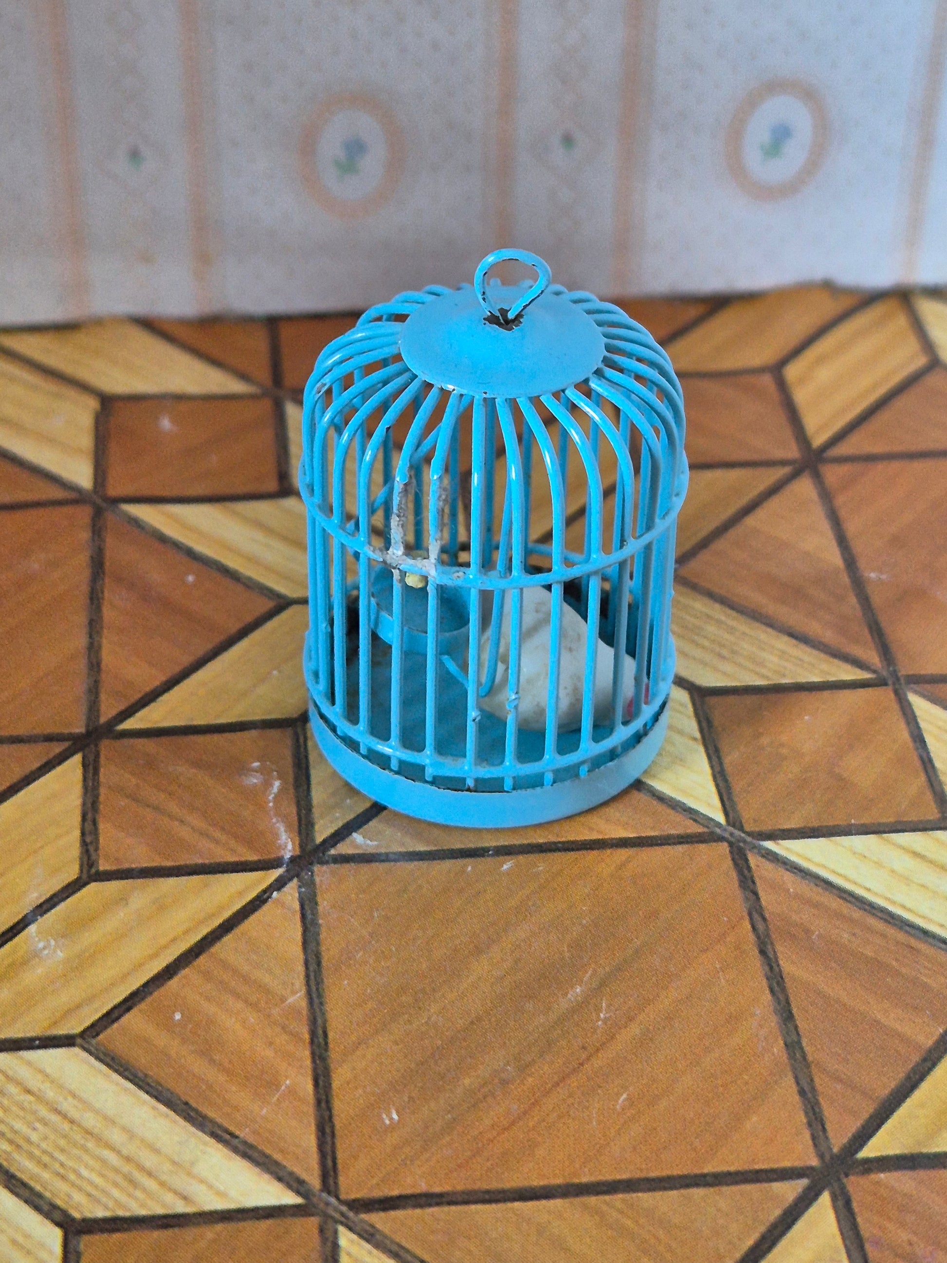 Lyseblåt fuglebur af metal, hvor fuglen er faldet ned. Der er patina og brugsspor. Passer fint til str 1:12 og 1:16.
