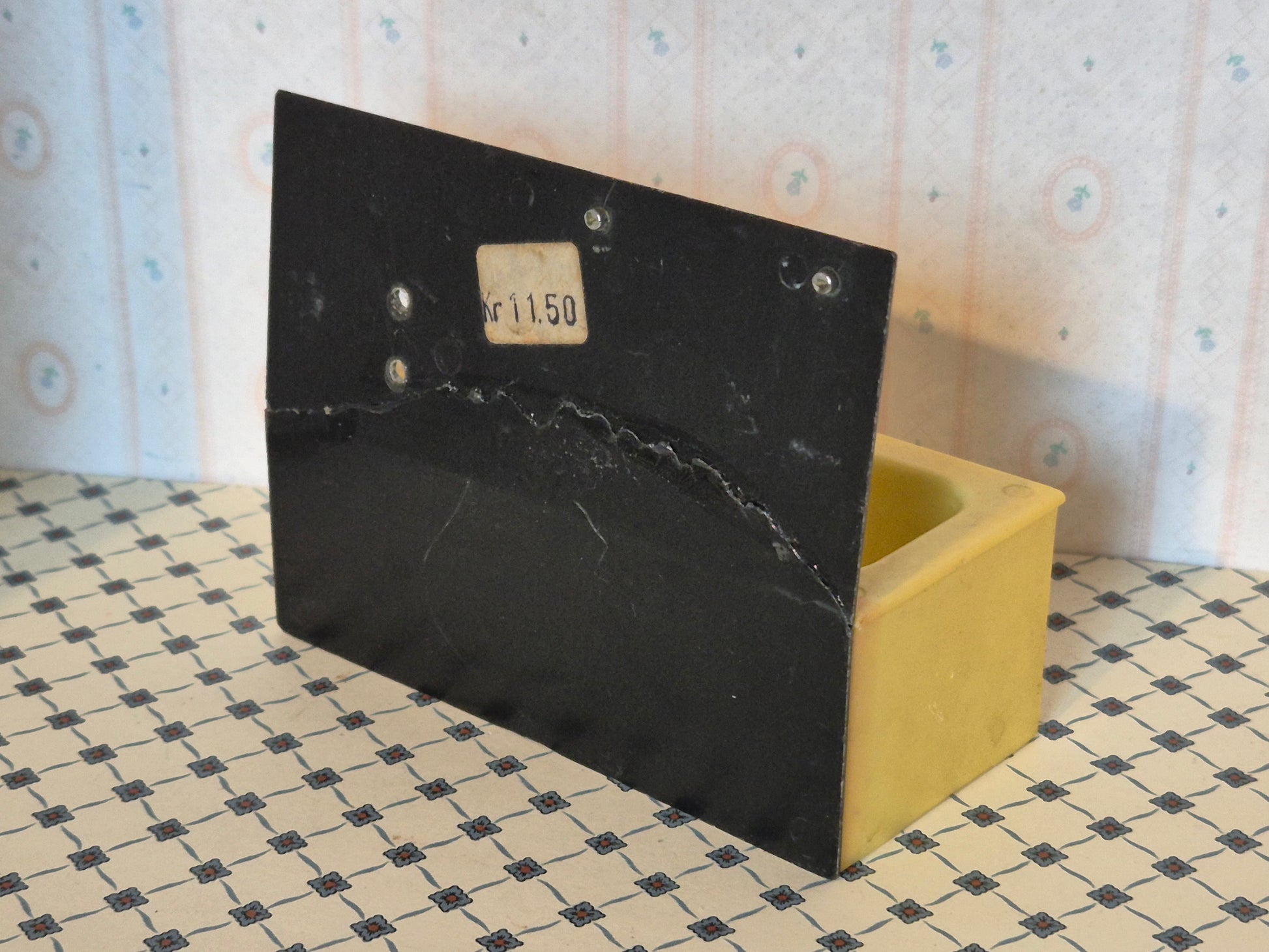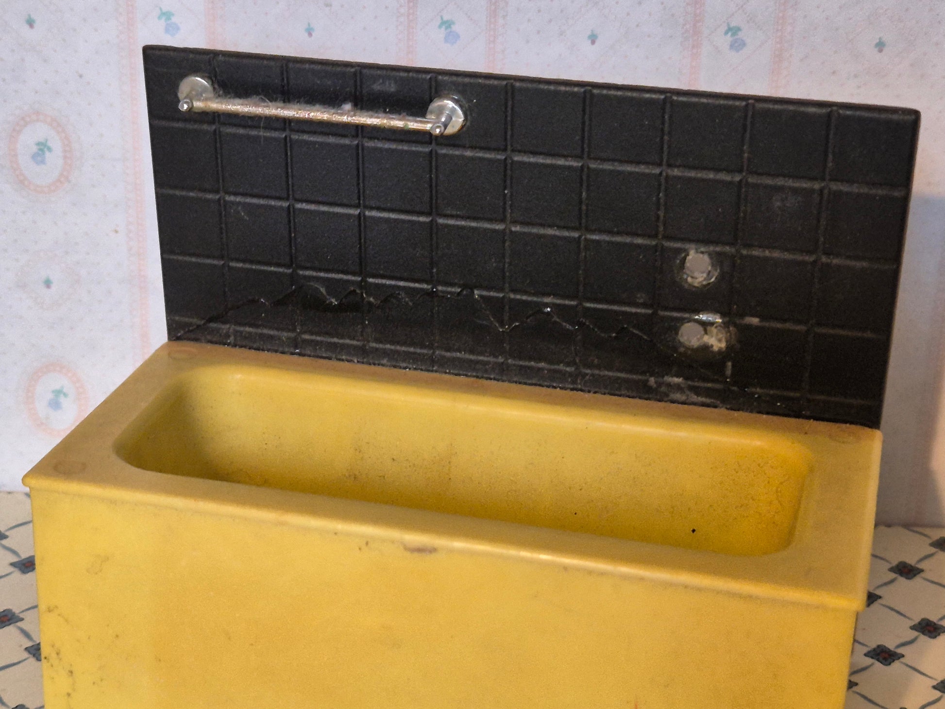 Vintage Hanse af Skandinavien badekar, gult og sort. Bagvæggen har været knækket, men er blevet limet sammen igen. Der er spor af skrammer og patina.