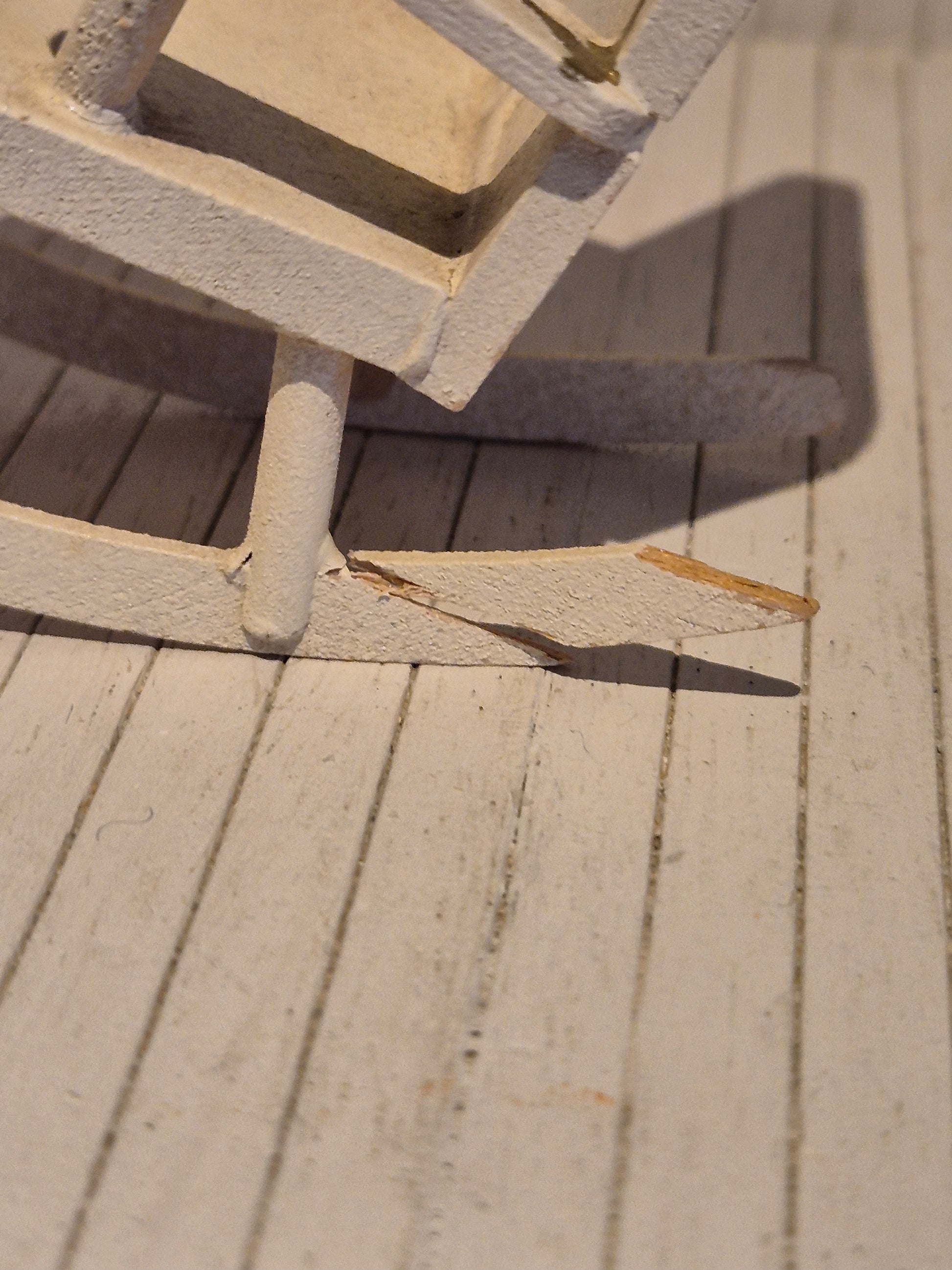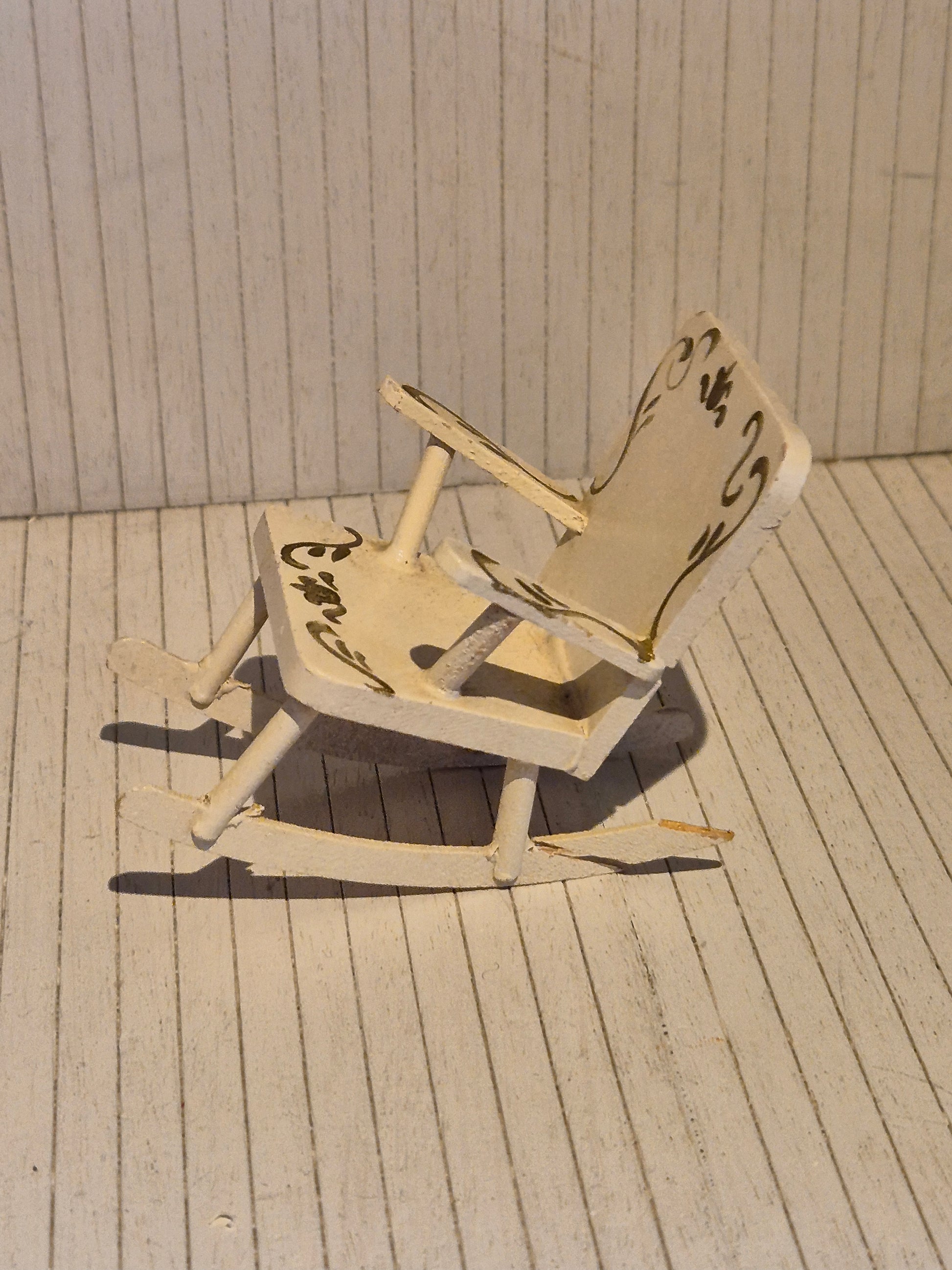 Ældre Lundby gyngestol fra 1950erne, den ses i 1959 i et katalog. Det er i hvid rokoko stil med guld mønster og fine udskæringer. Den har en knækket mede, bagerst.