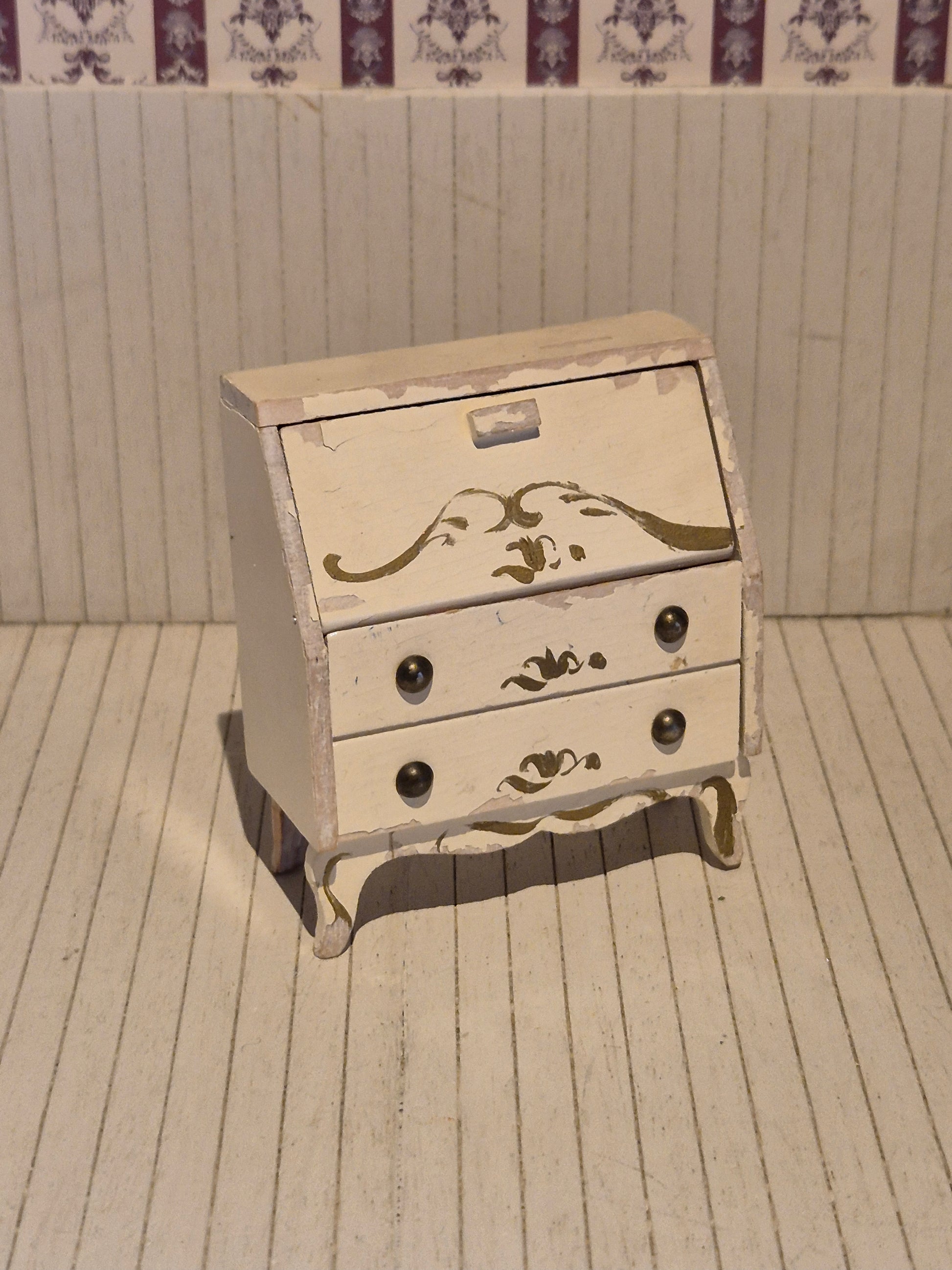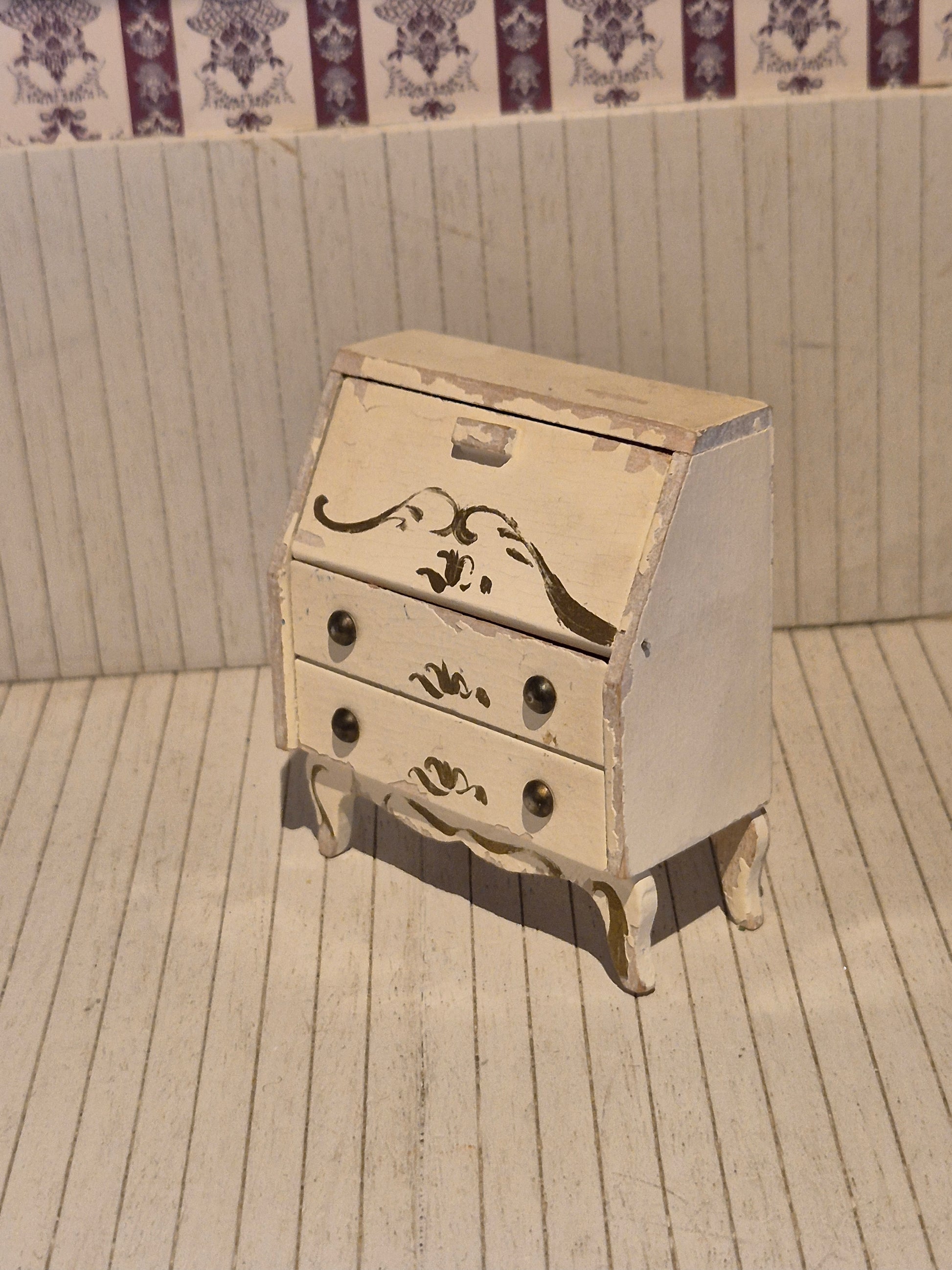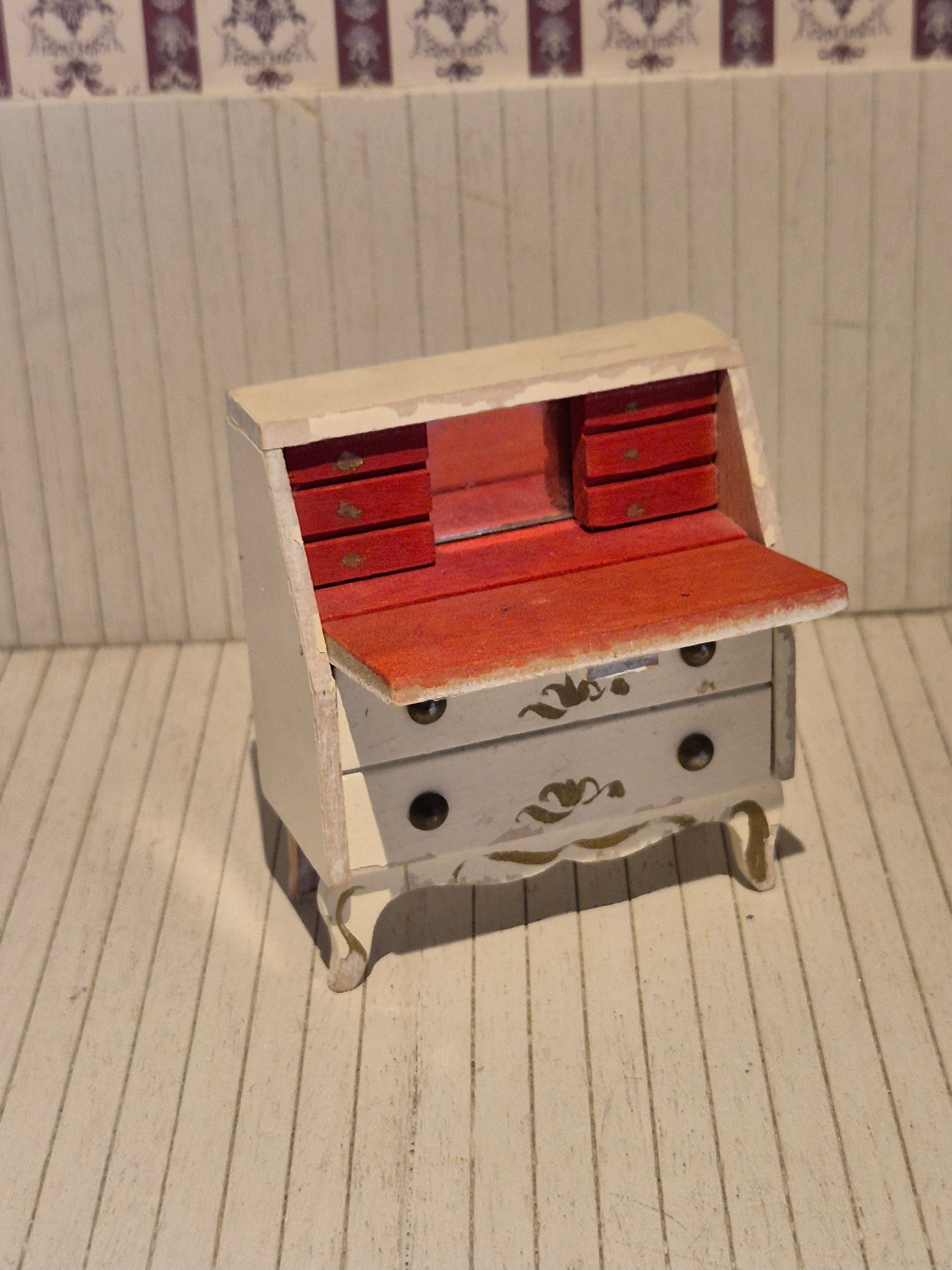 Hvidt sekretærmøbel af Lerro til dukkehus. Den har patina og brugsspor flere steder.
