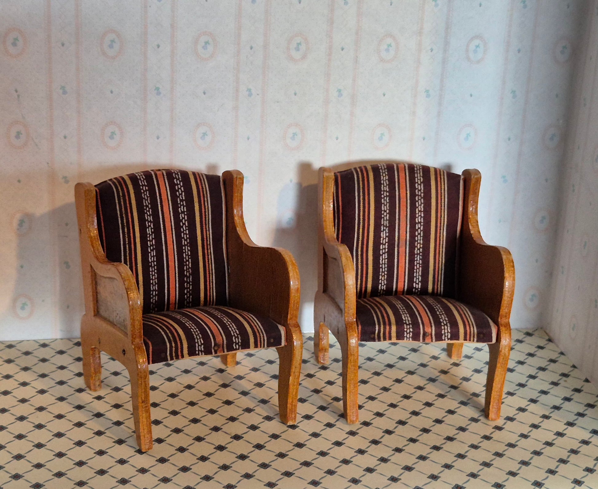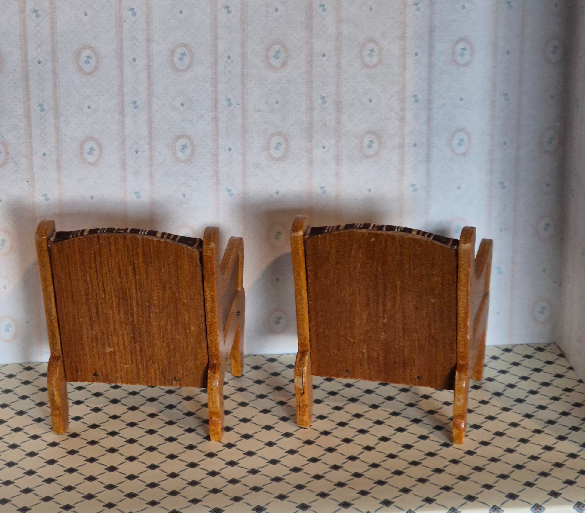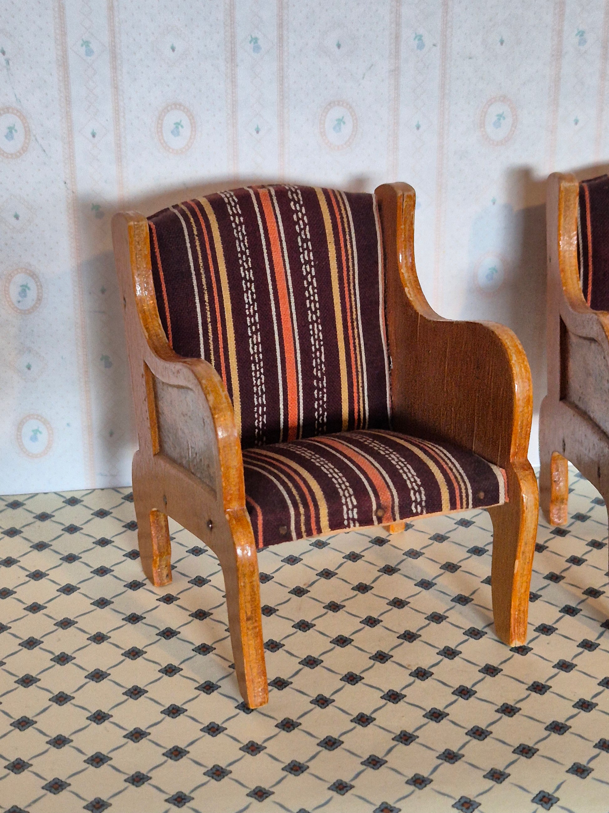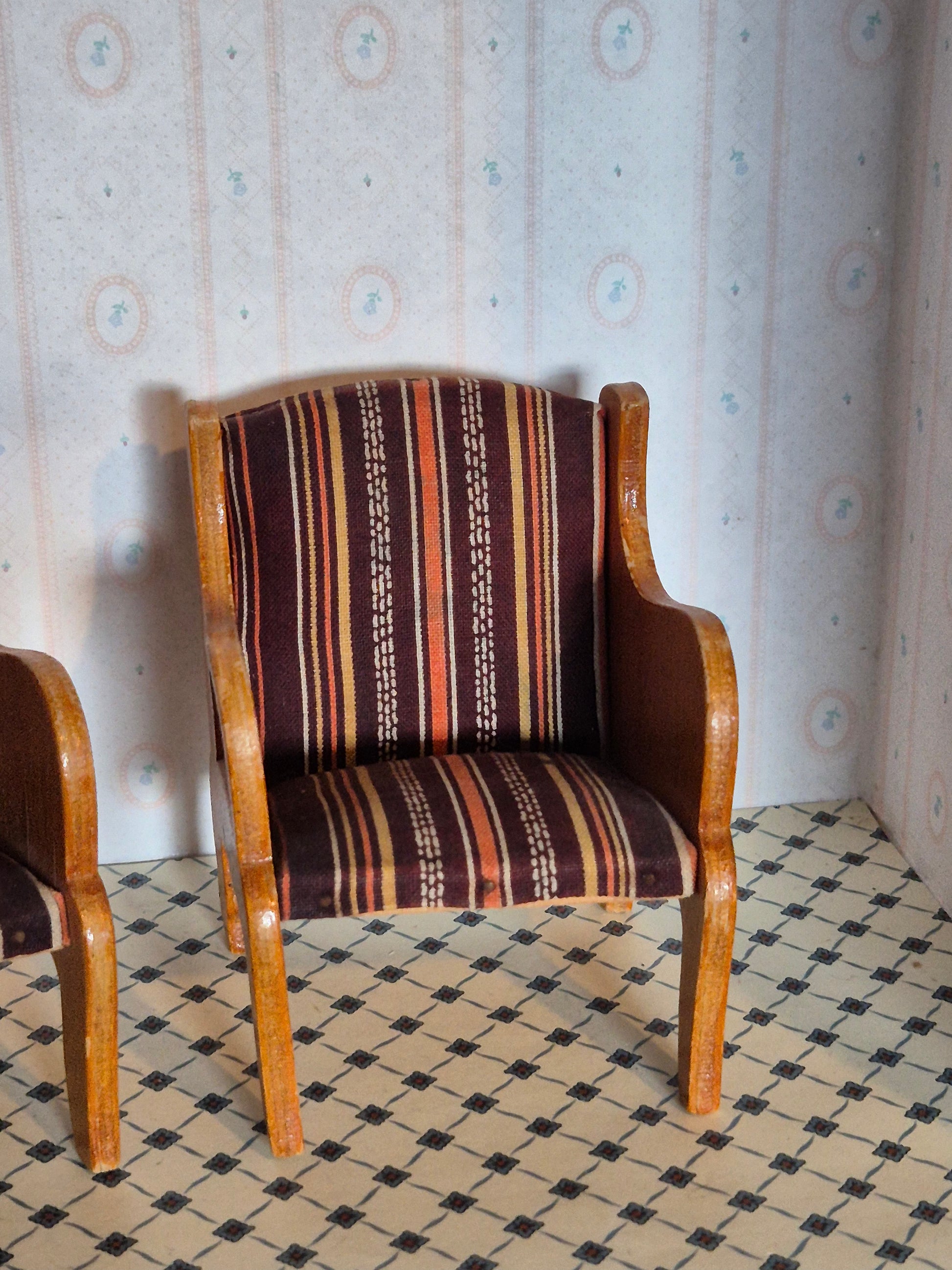 Sæt med 2 vintage lænestole i 1:10, større end 1:12. De er i udmærket stand. Fra før 1970erne.