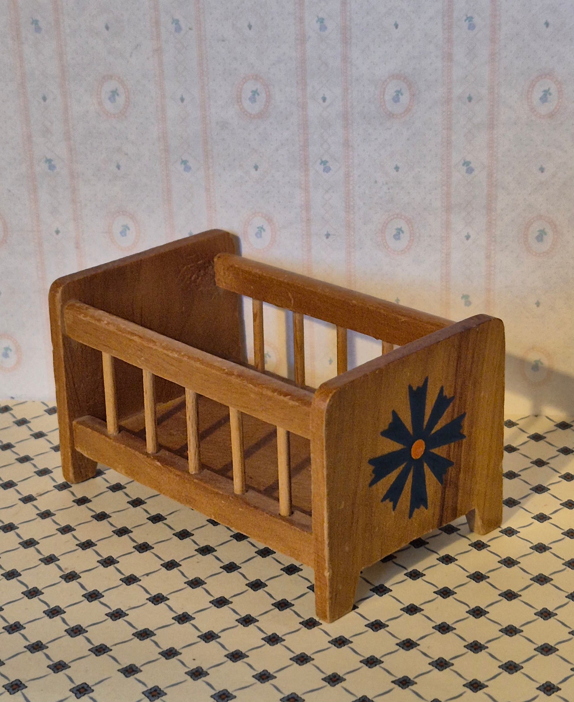 Vintage, ældre, børneseng af træ i 1:12 med blåt blomstermotiv på endegavlen. Fin tremmeseng. Udmærket stand med en del patina og brugsspor i