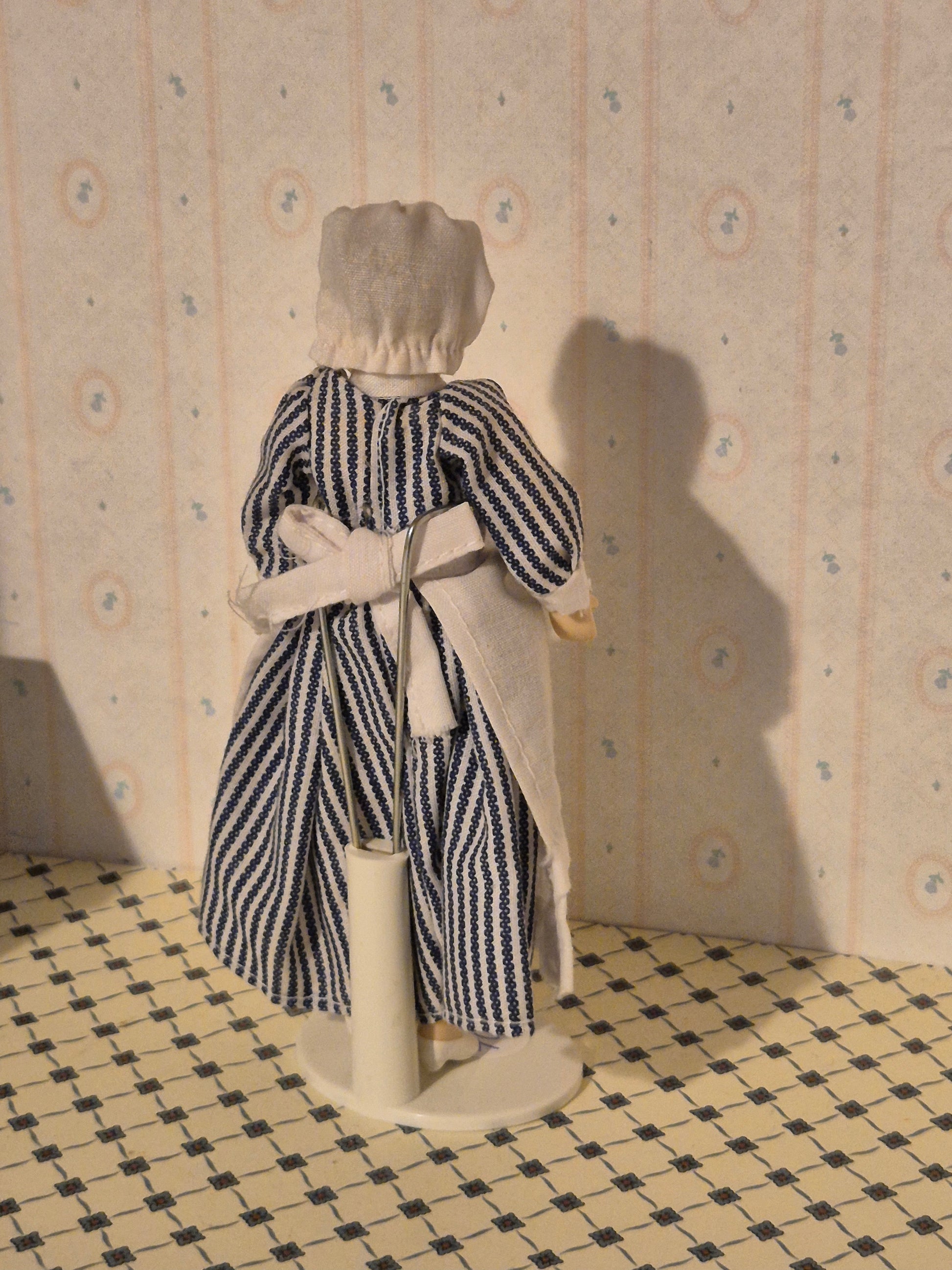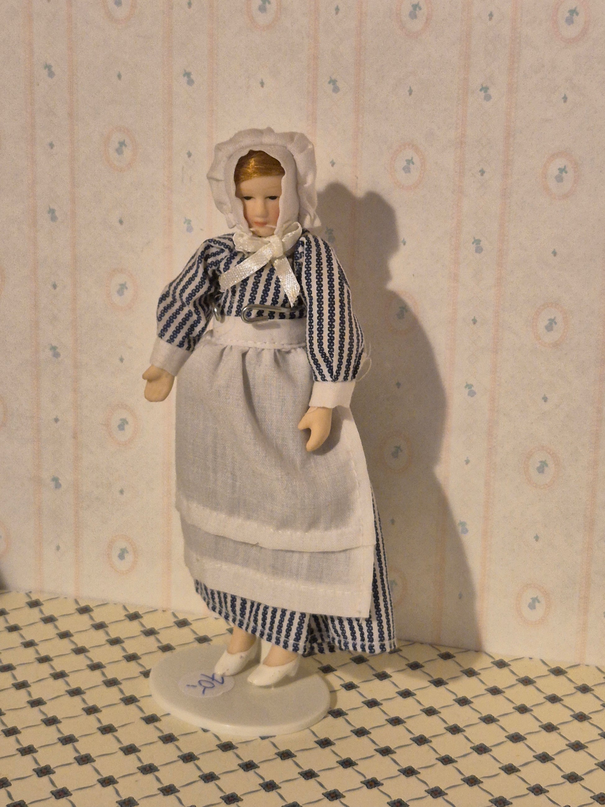 Pæn og fin 1:12 dukkedame, tjenestepige eller lignende. Pæn stand med patina. Det er porcelæn og stof.