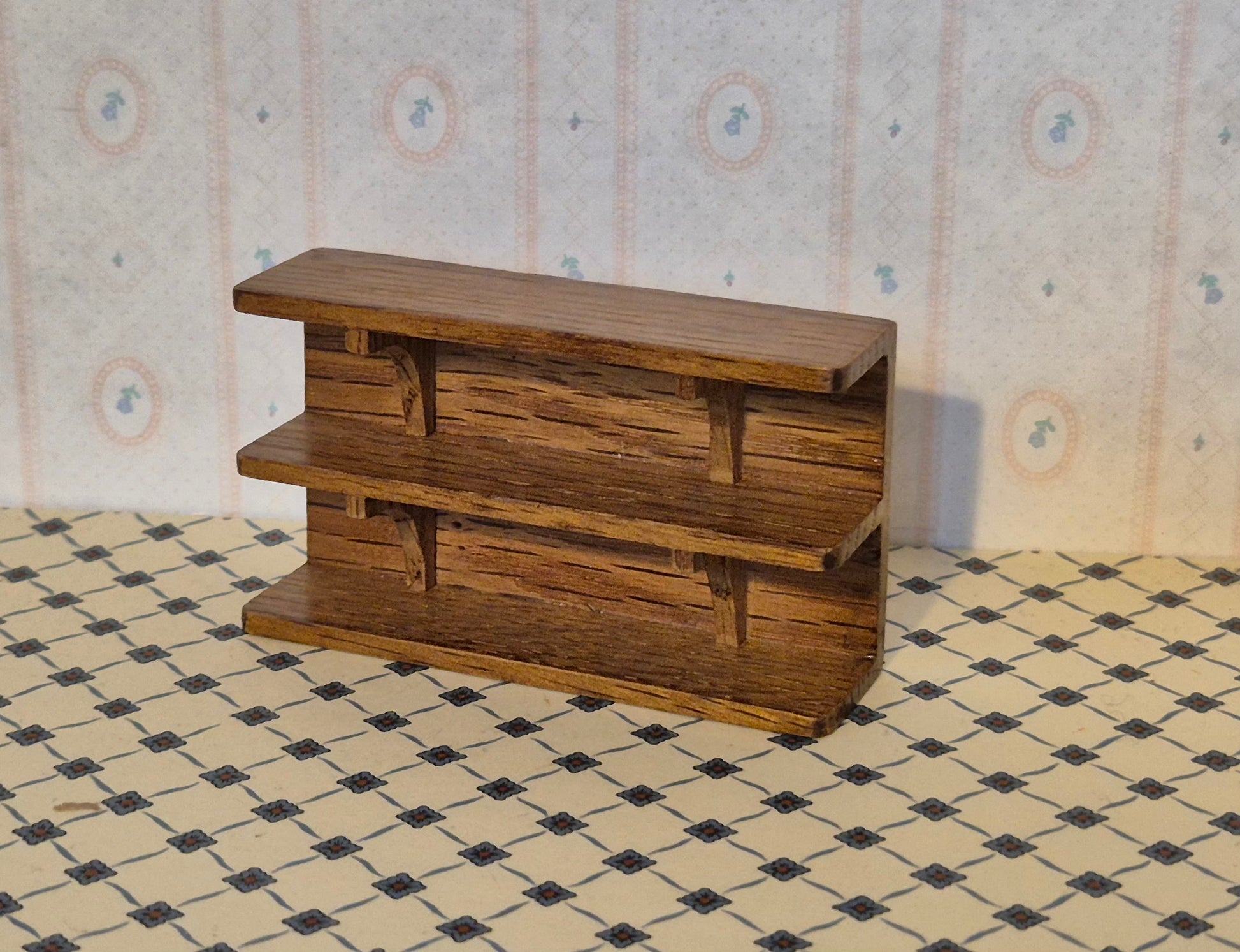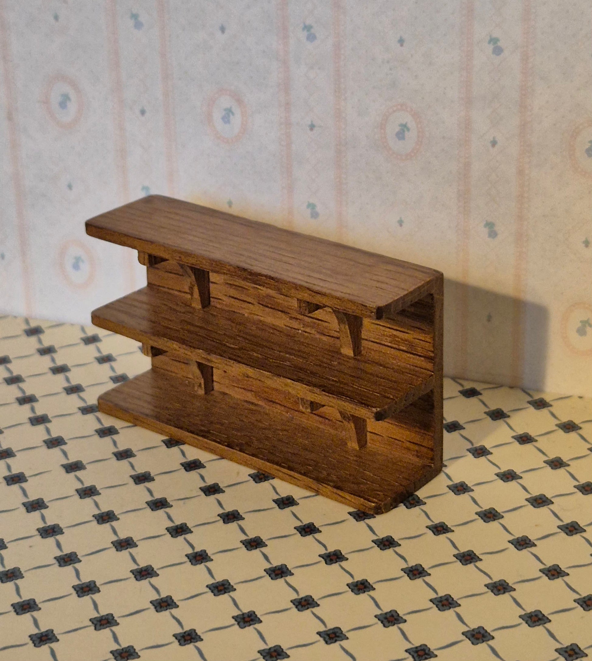 Pæn hylde af træ i hasselbrun. God stand. Det er 1:12.