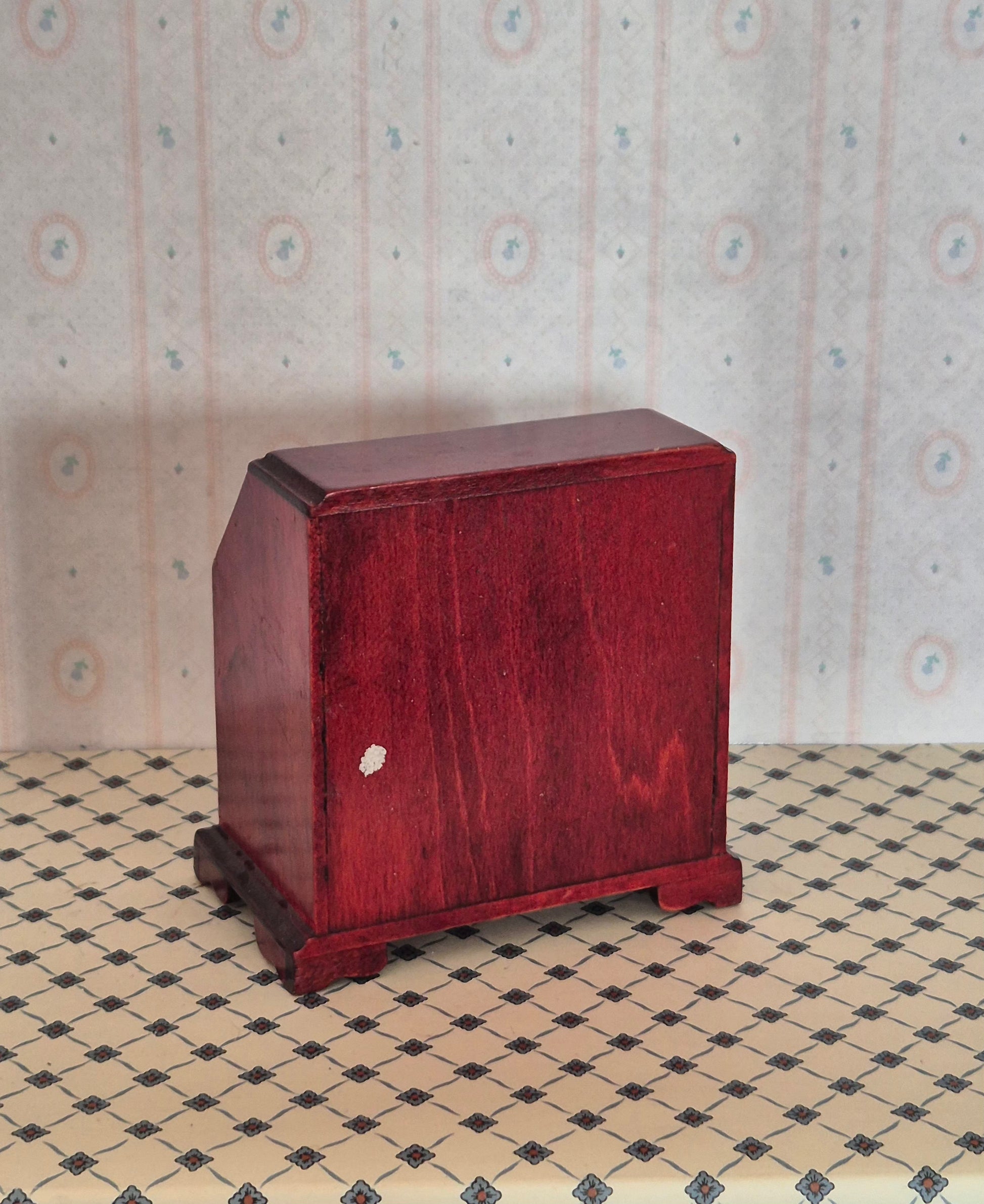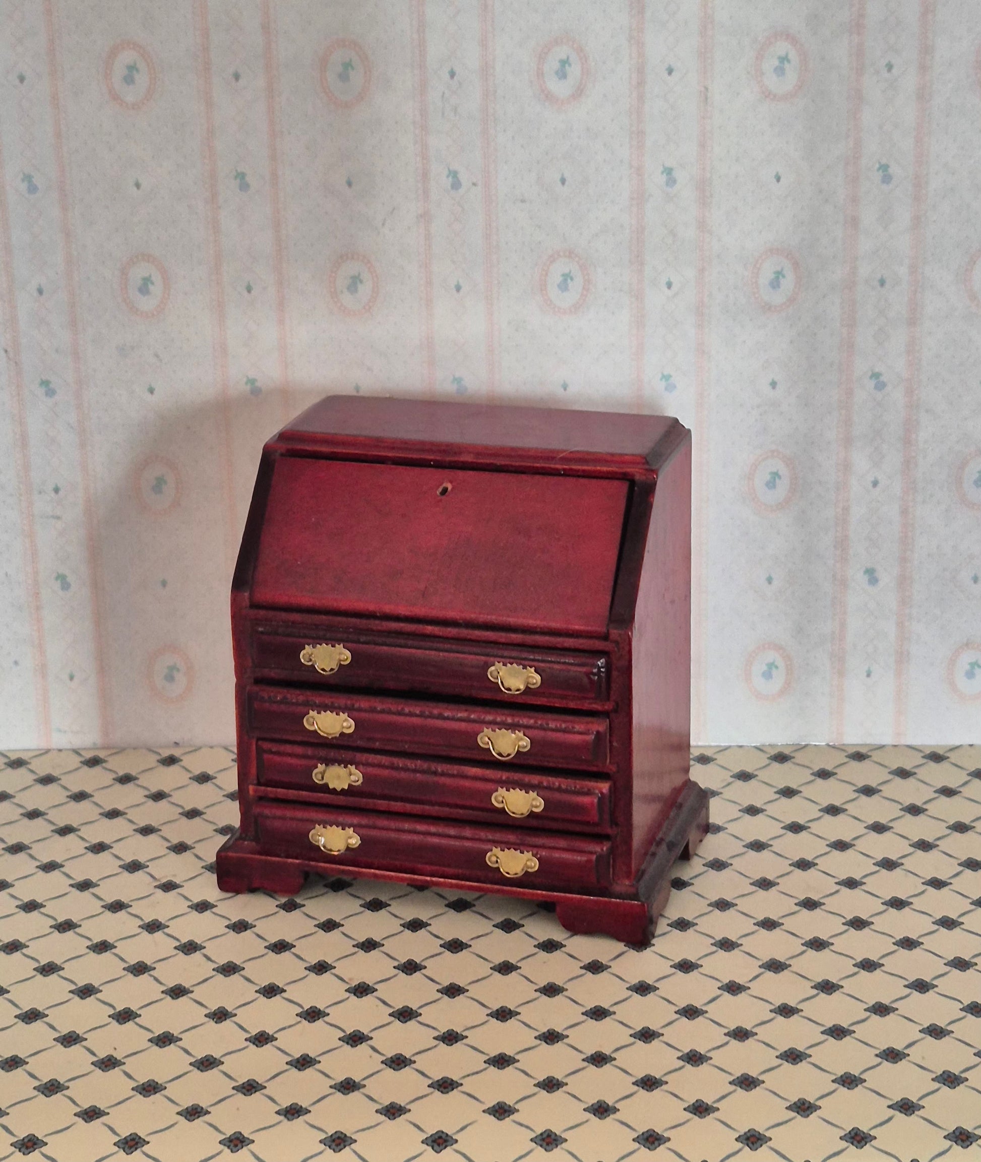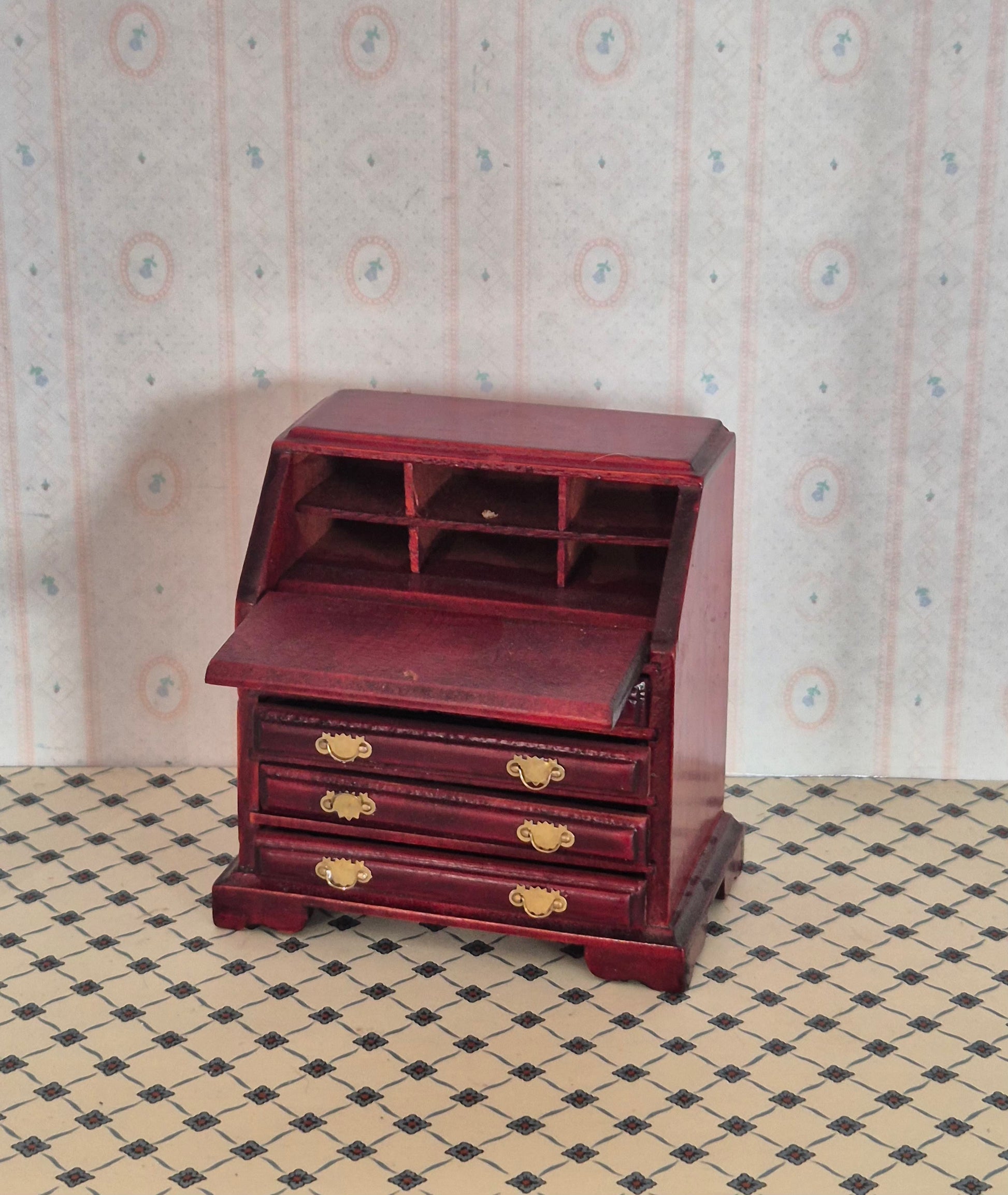Pænt 1:12 sekretærmøbel, skrivebord, af træ i rødbrun maghoni-look. Udmærket stand med patina.