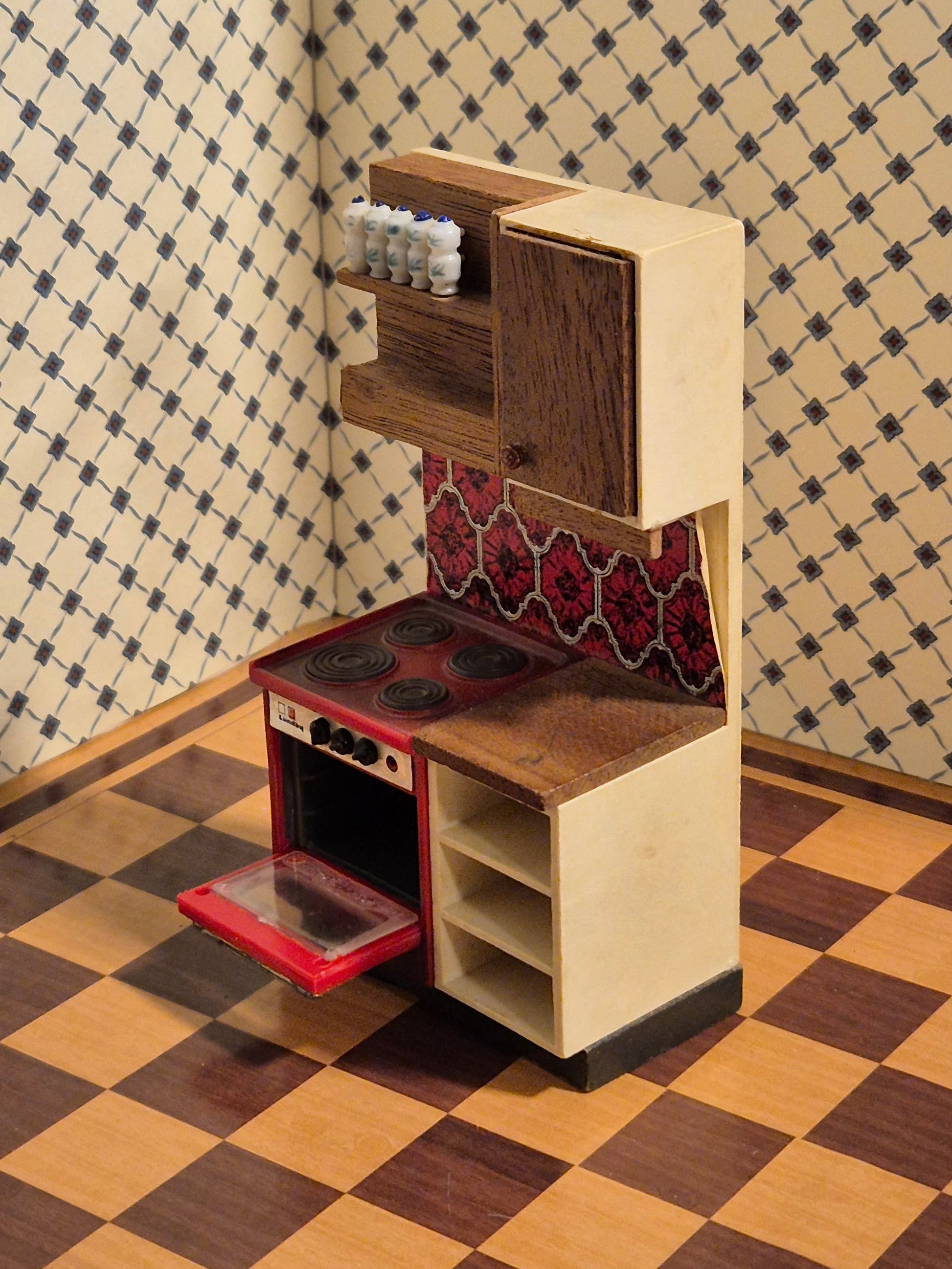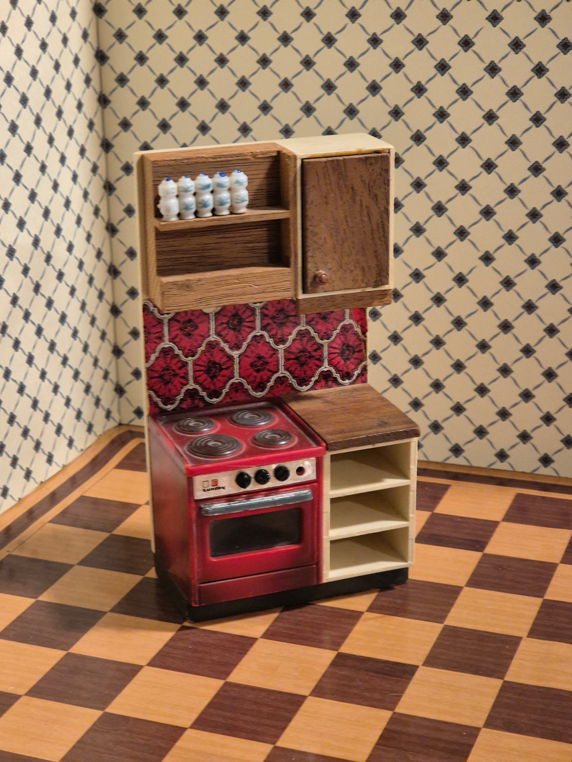 Rødt komfur af mærket Lundby fra 1970erne, hvor skufferne mangler
