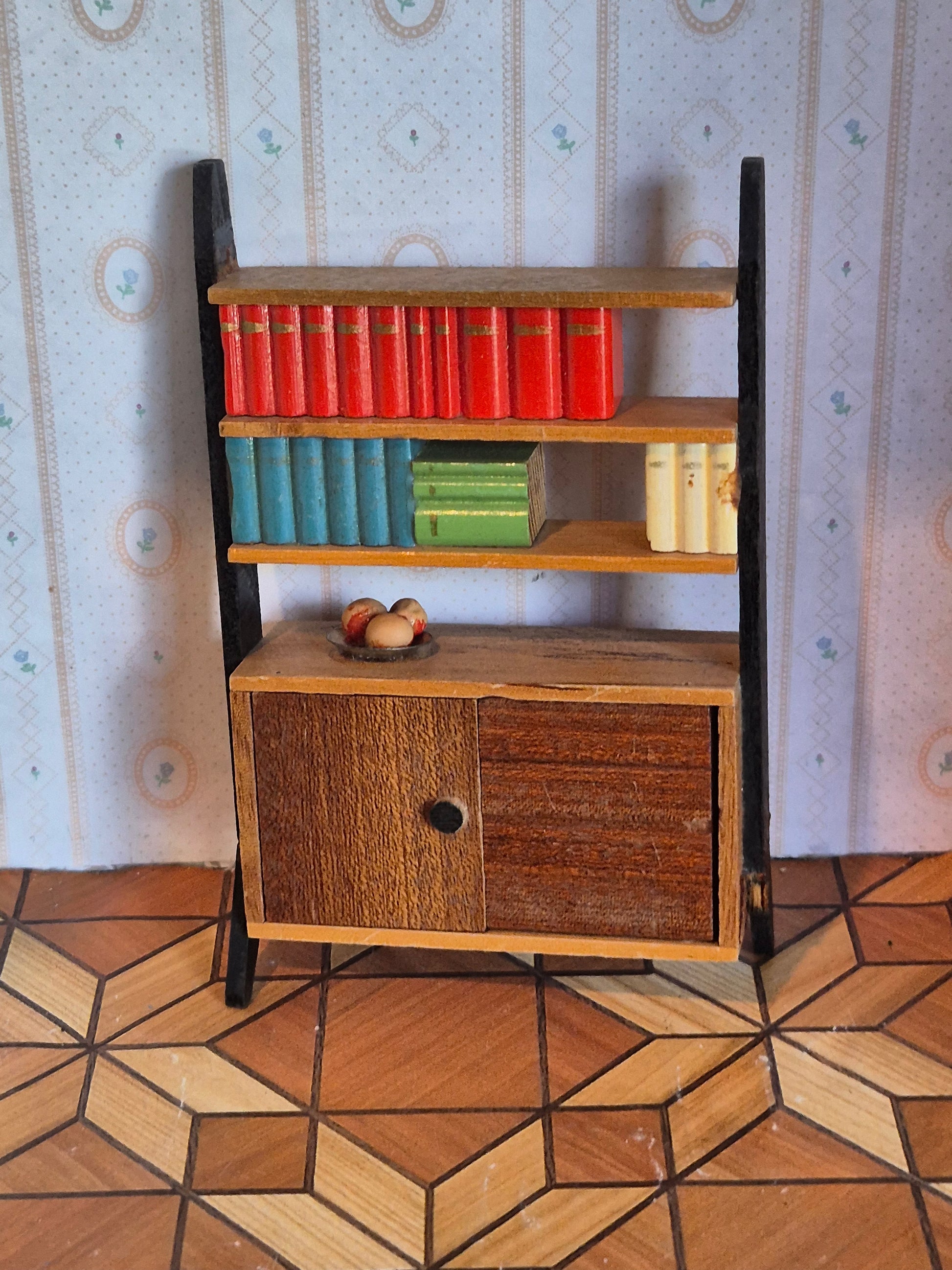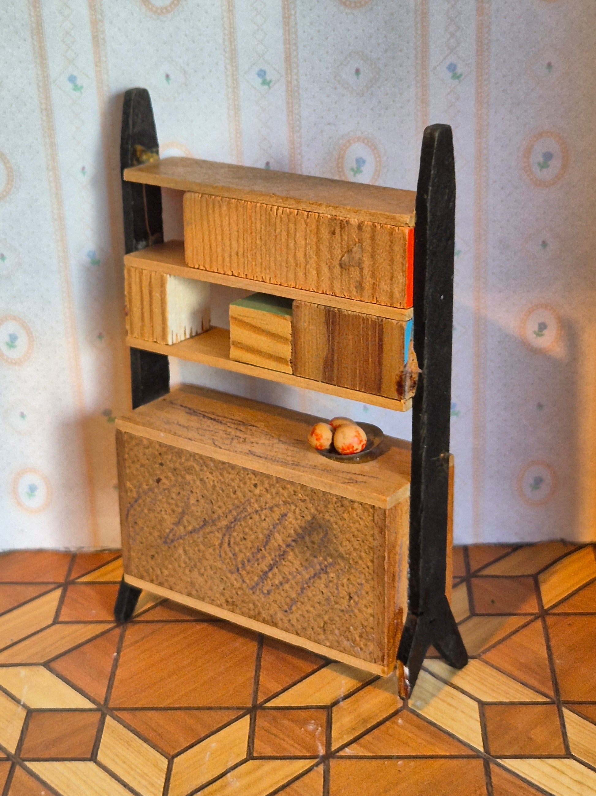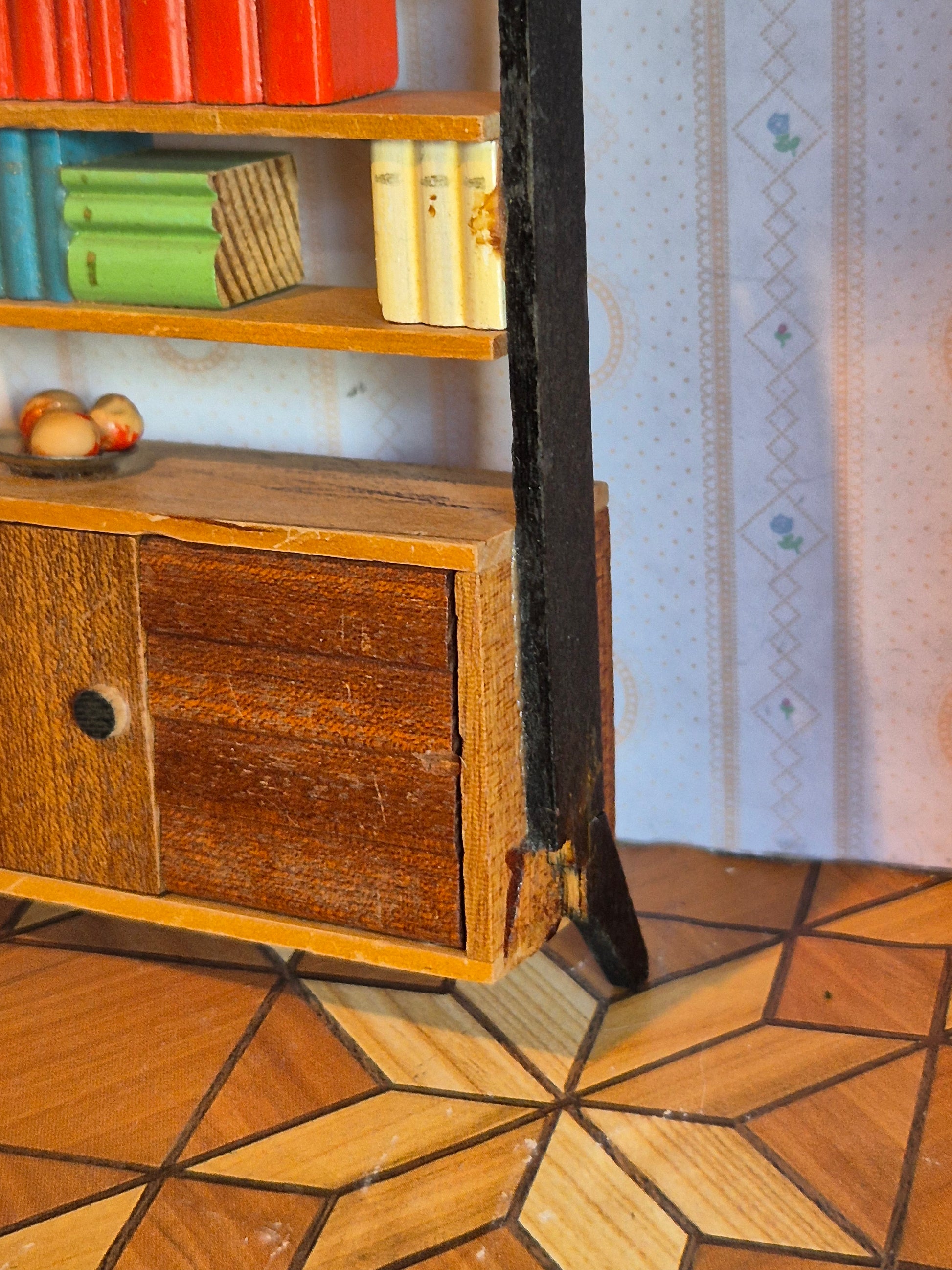 Lundby ældre reol med sorte sider. Den er af træ. Den ene fod er knækket.