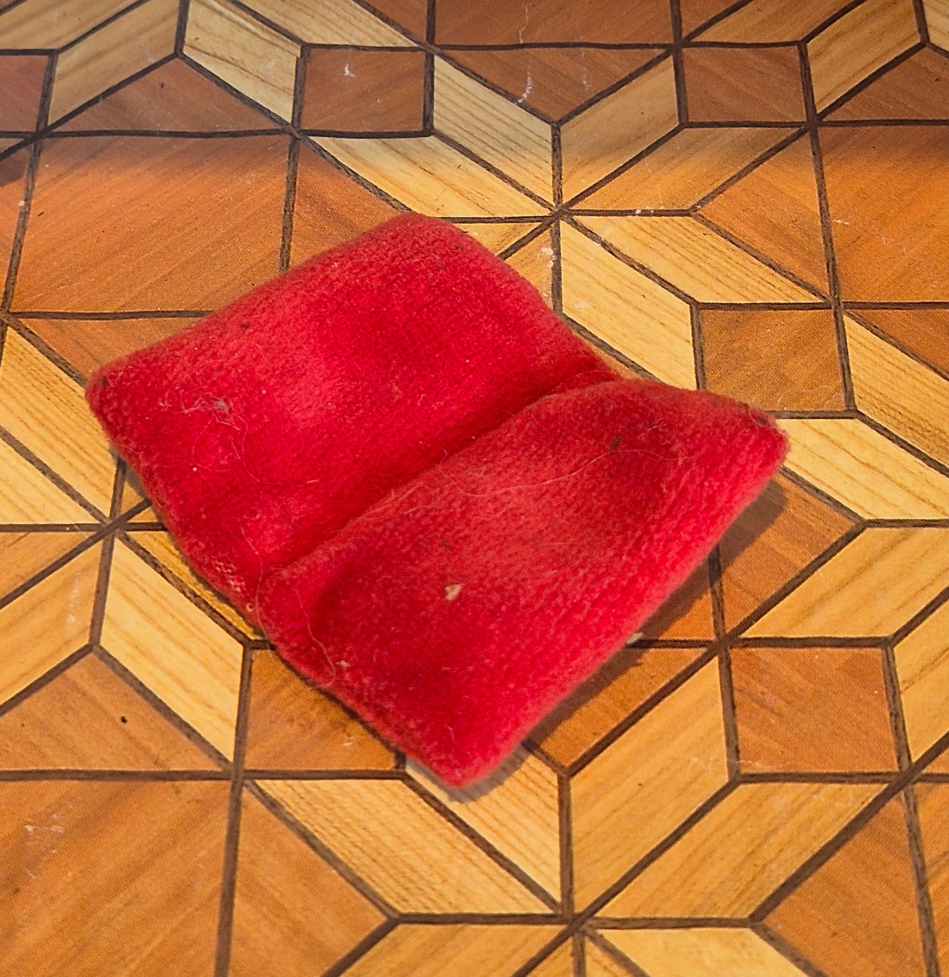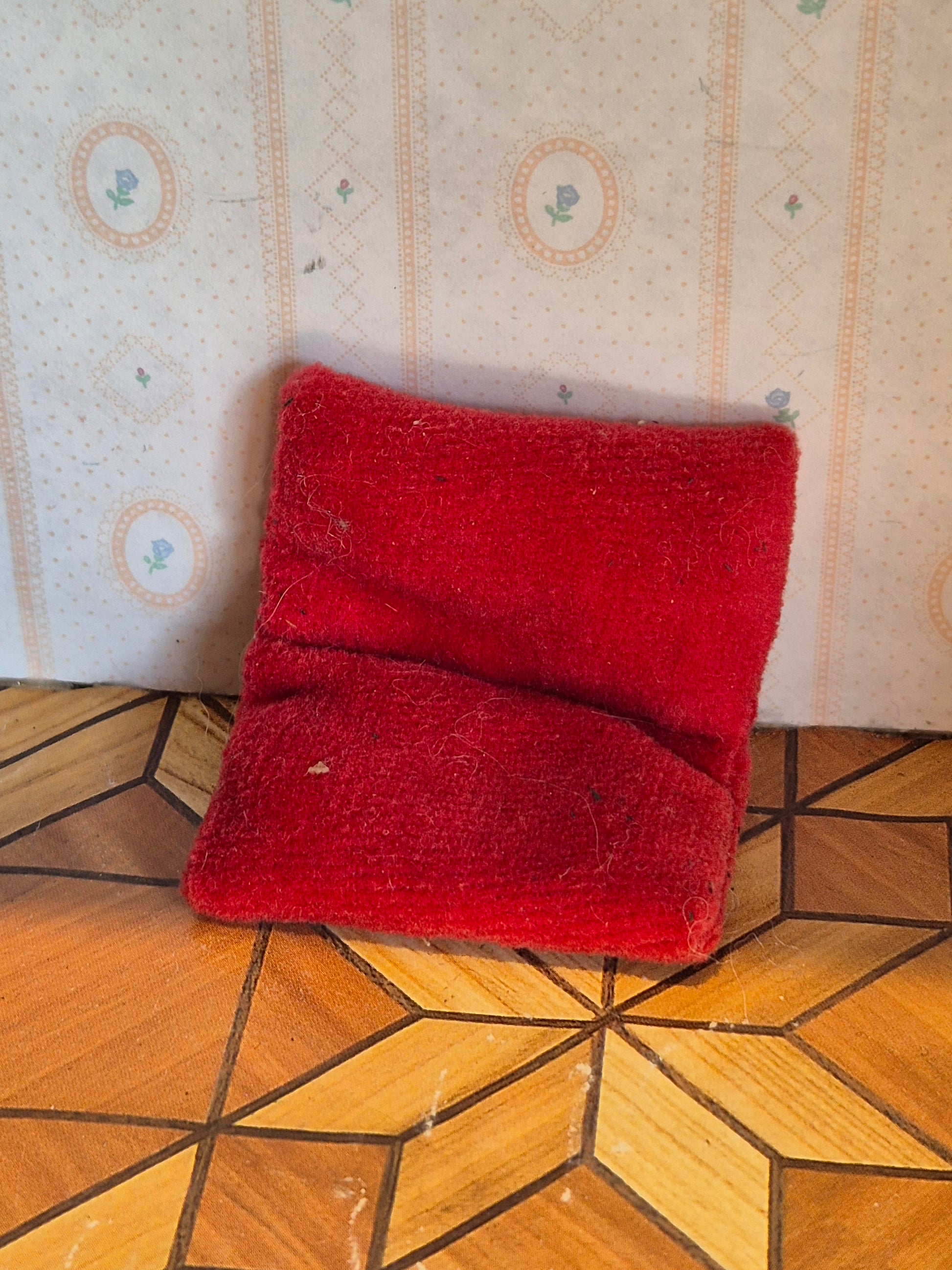 Fin rød pude der er delt på midten. Den er lidt nusset. Den er 5,4 cm x 6,2 cm.