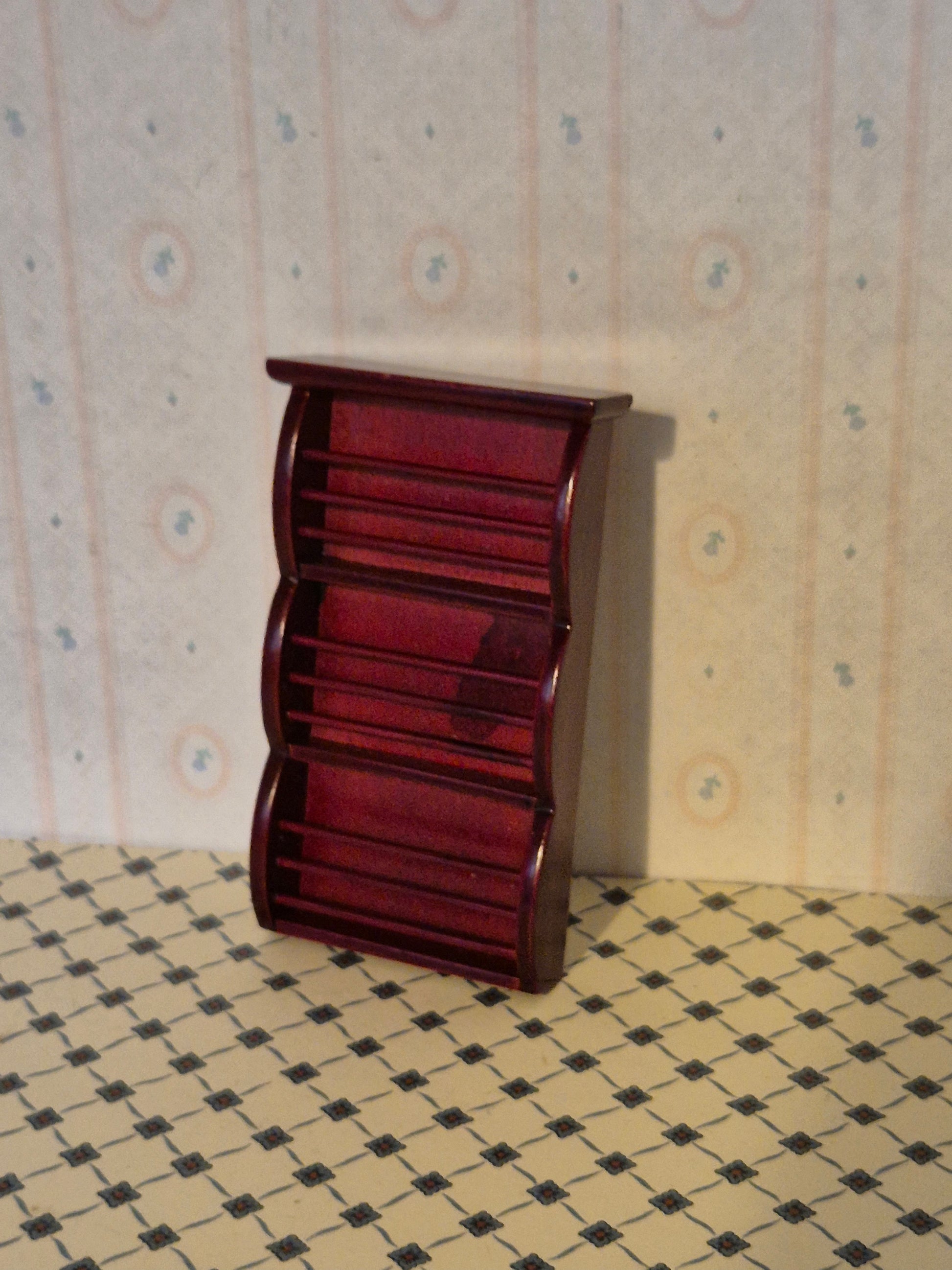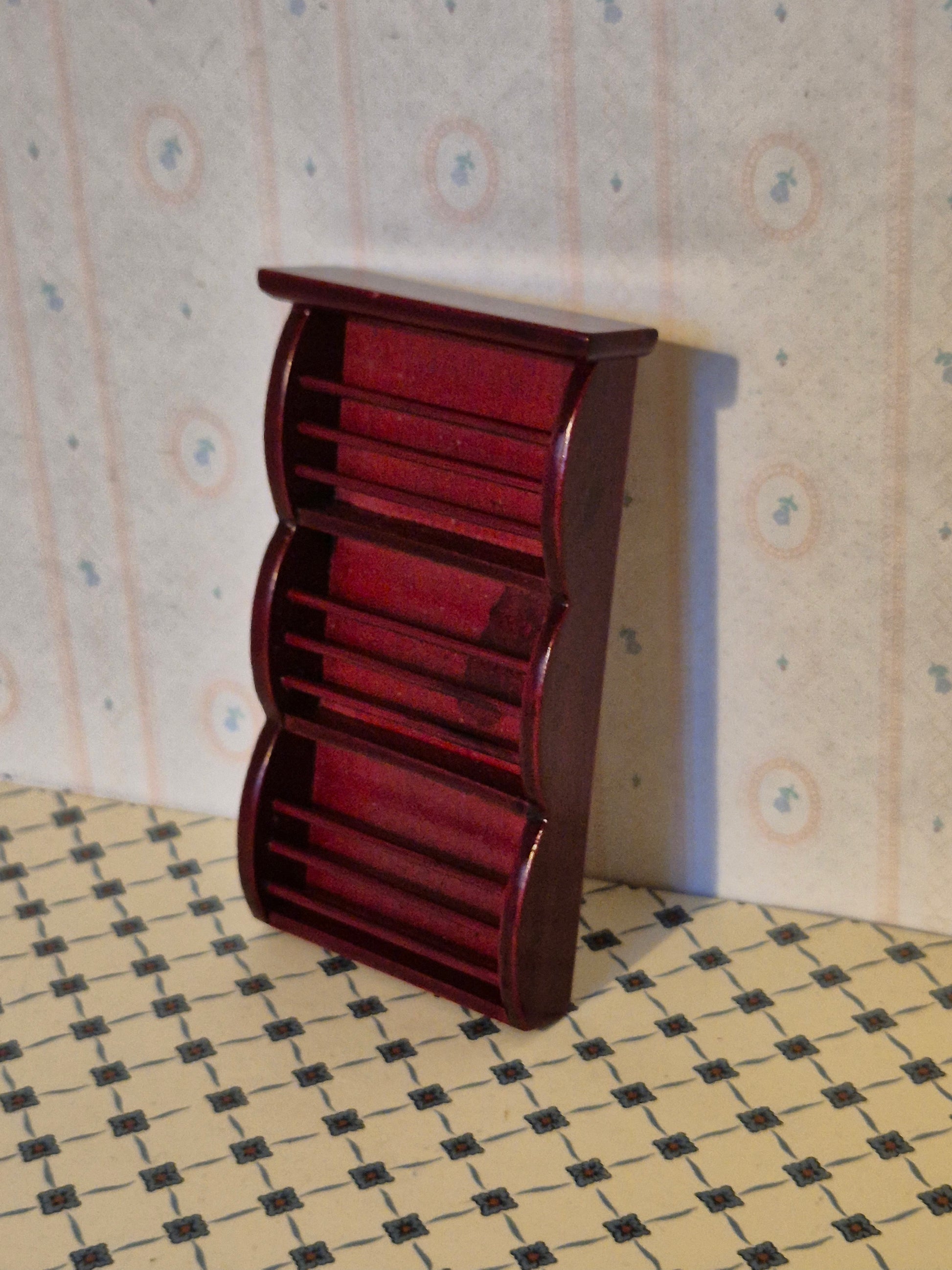 Pæn rødbrun maghoni-look tallerkenrække eller boghylde - det kan også være til tidsskrifter.