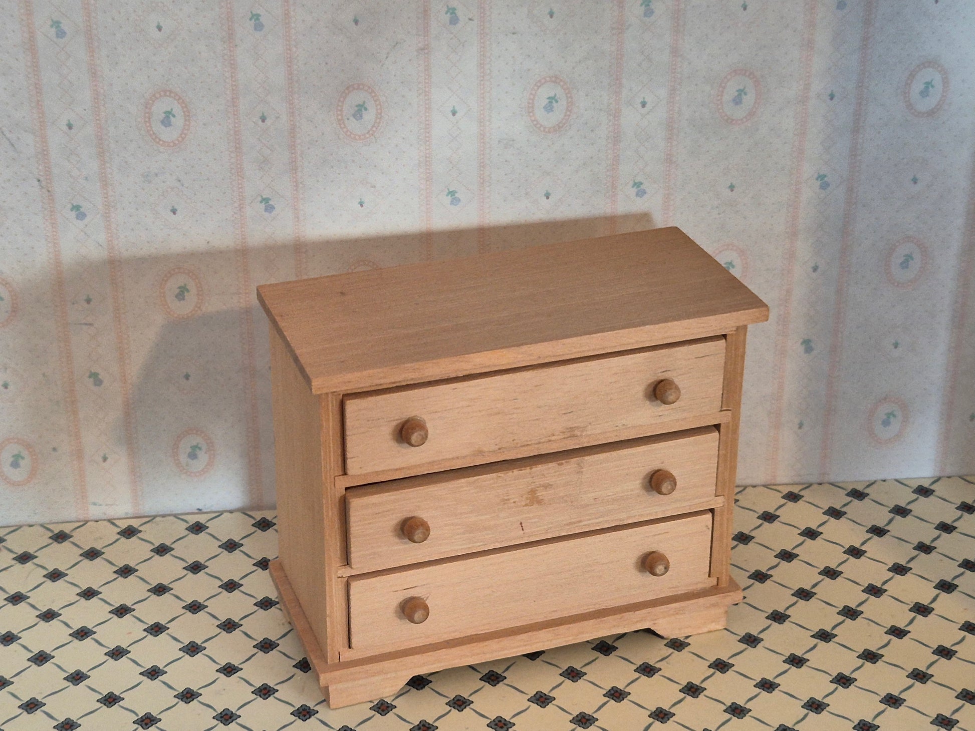 Pæn og fin 1:12 kommode med skuffer, der kan åbnes. Den er i ubehandlet træ. Den er robust og gedigen.