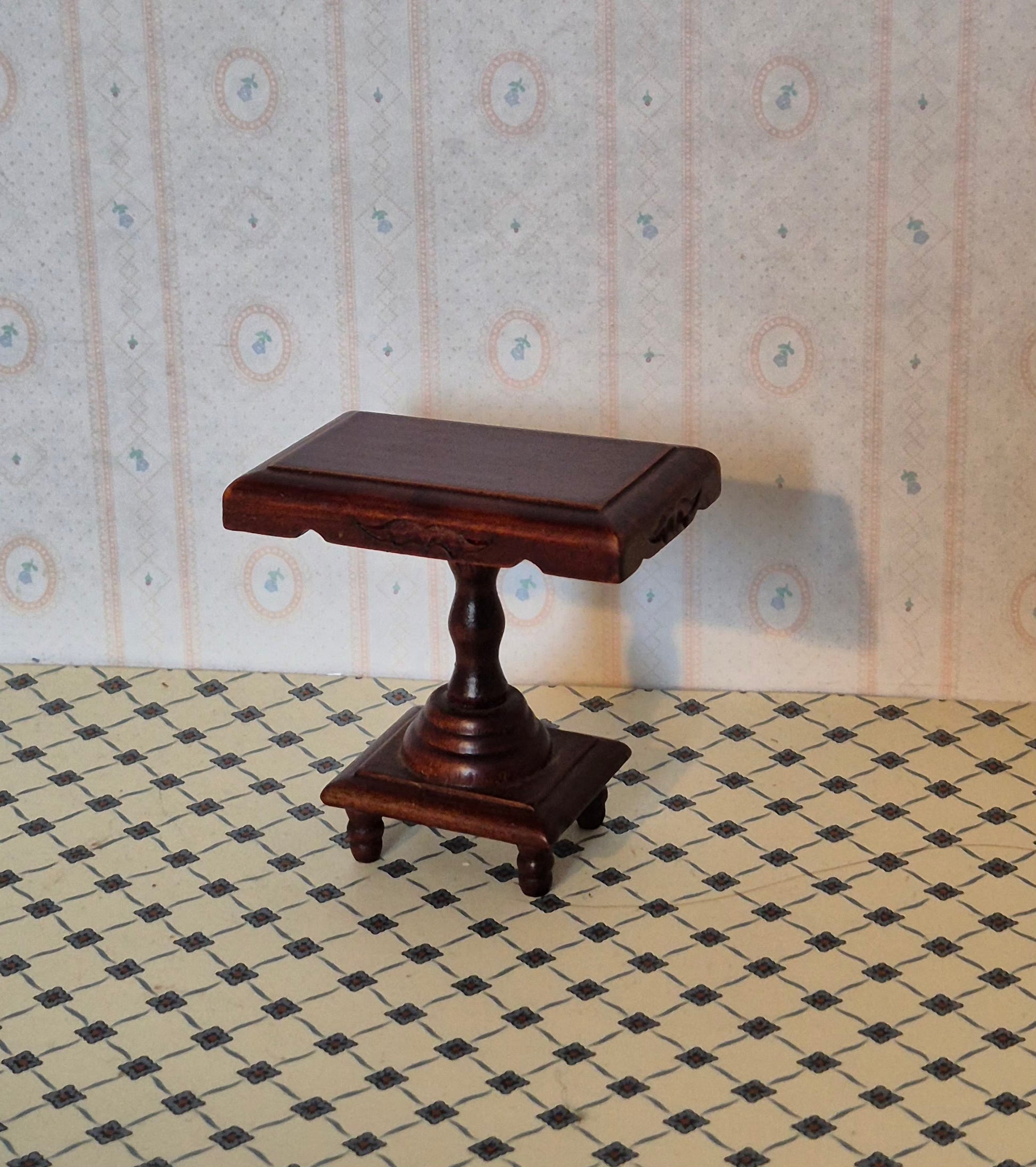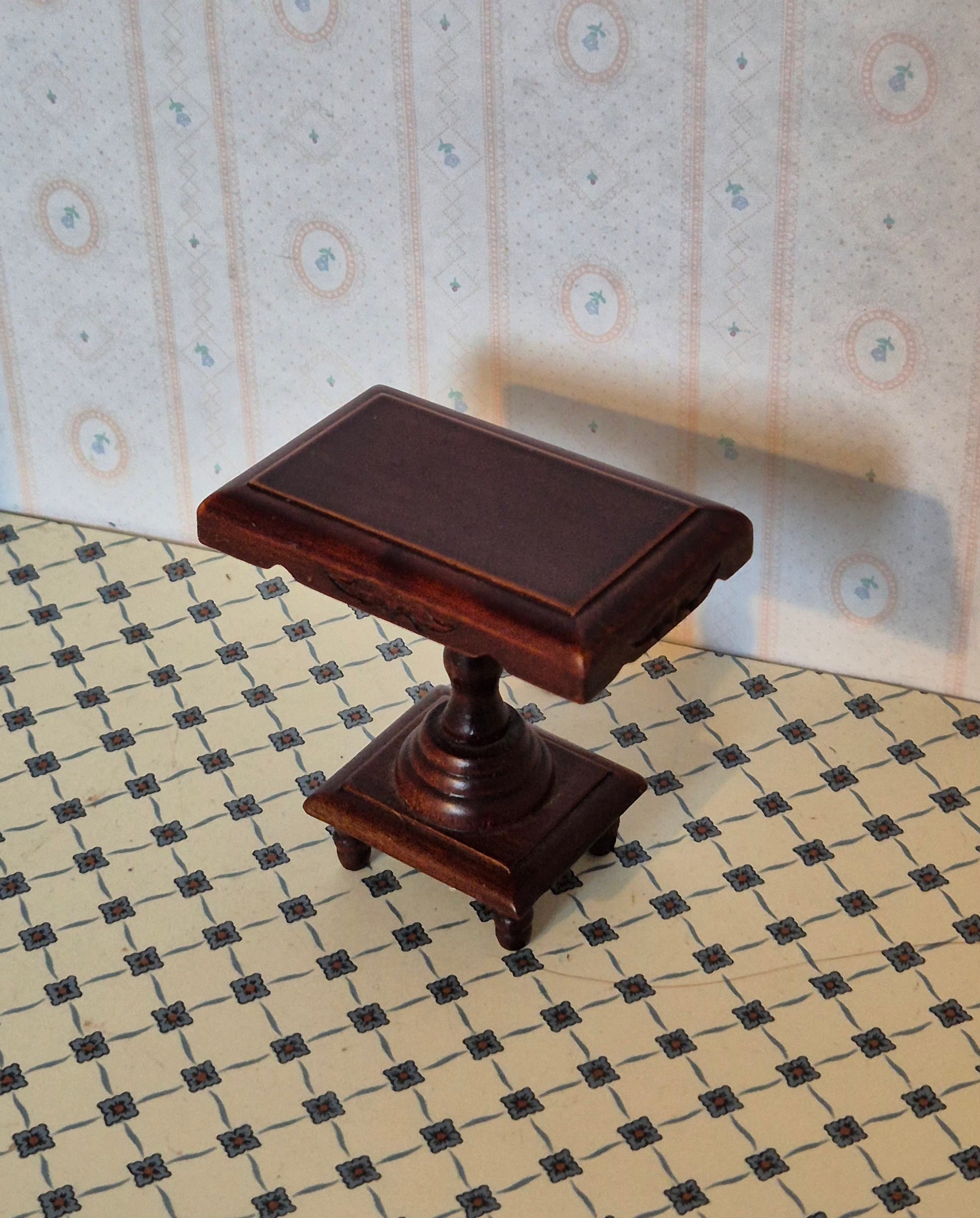Pænt mørkt rødbrunt 1:12 sidebord med fine detaljer og udskæringer. Det er i god stand.