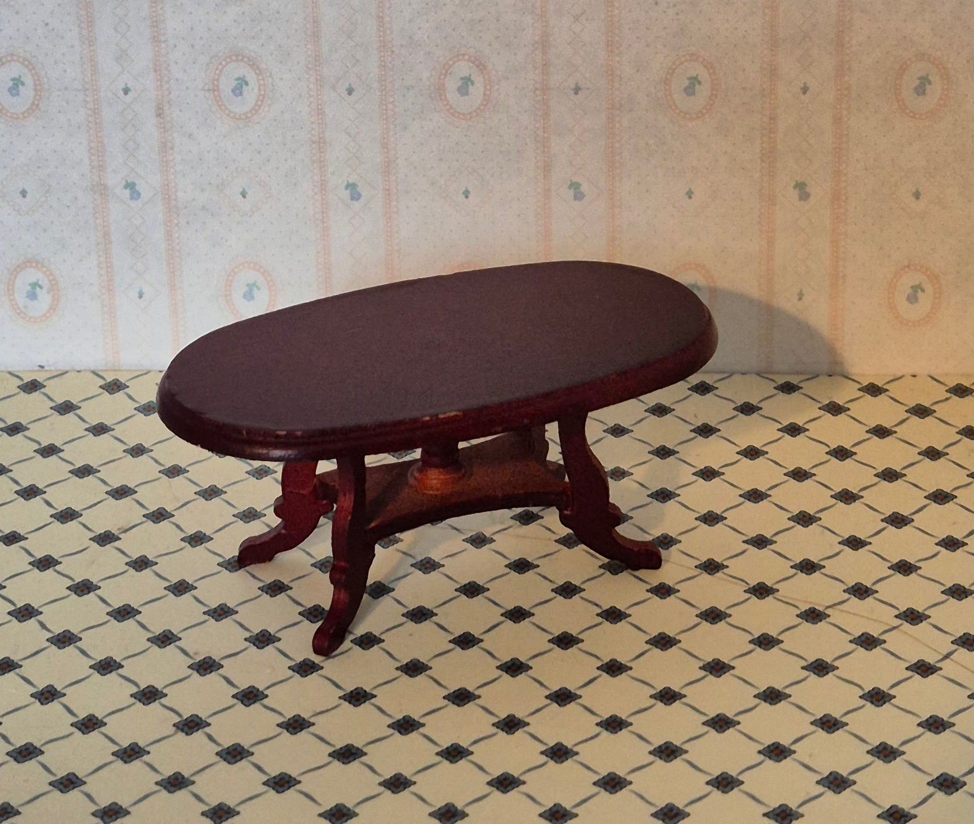 Pænt ovalt rødbrunt 1:12 sofabord af træ med et fint udskåret understel. God stand.