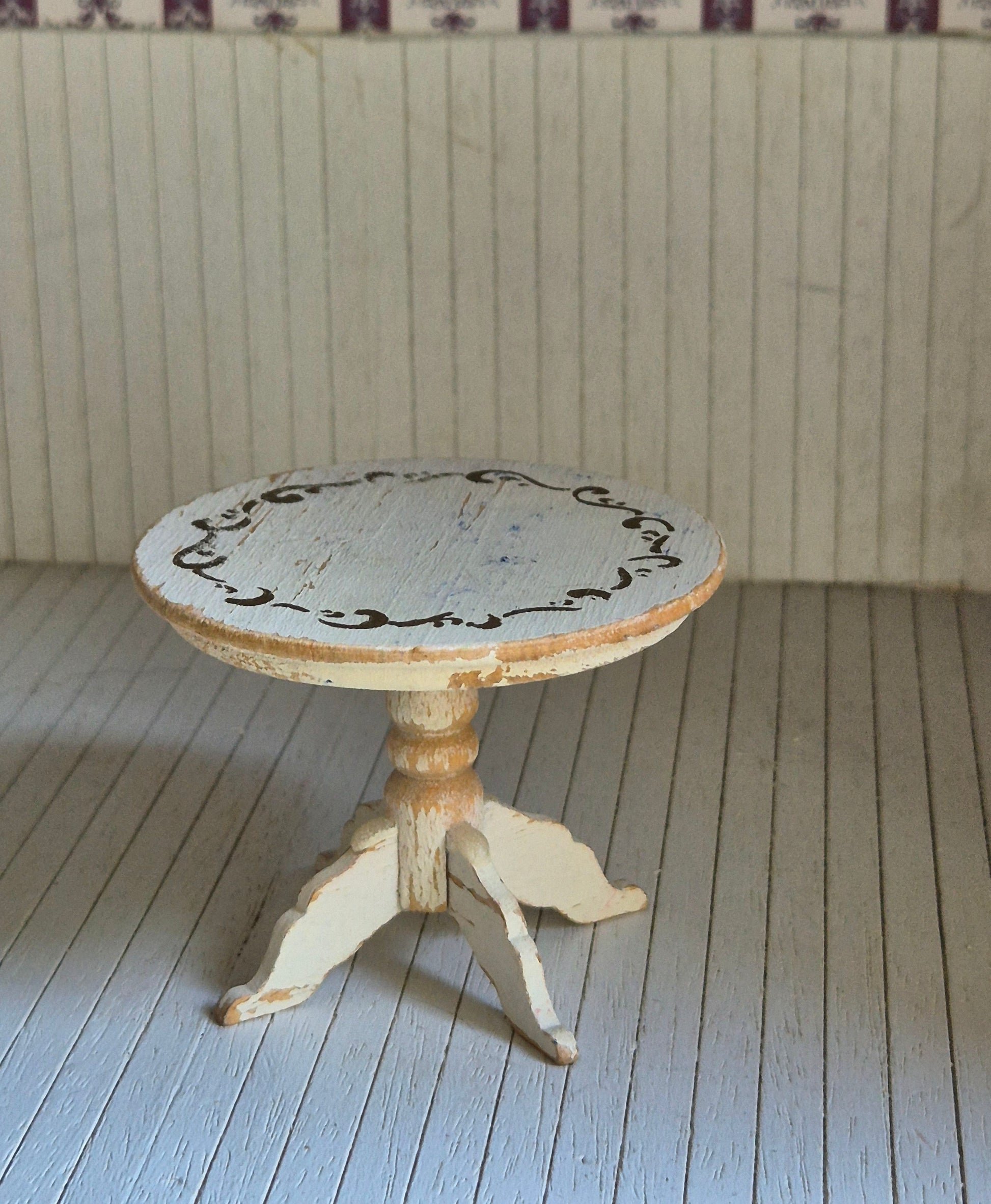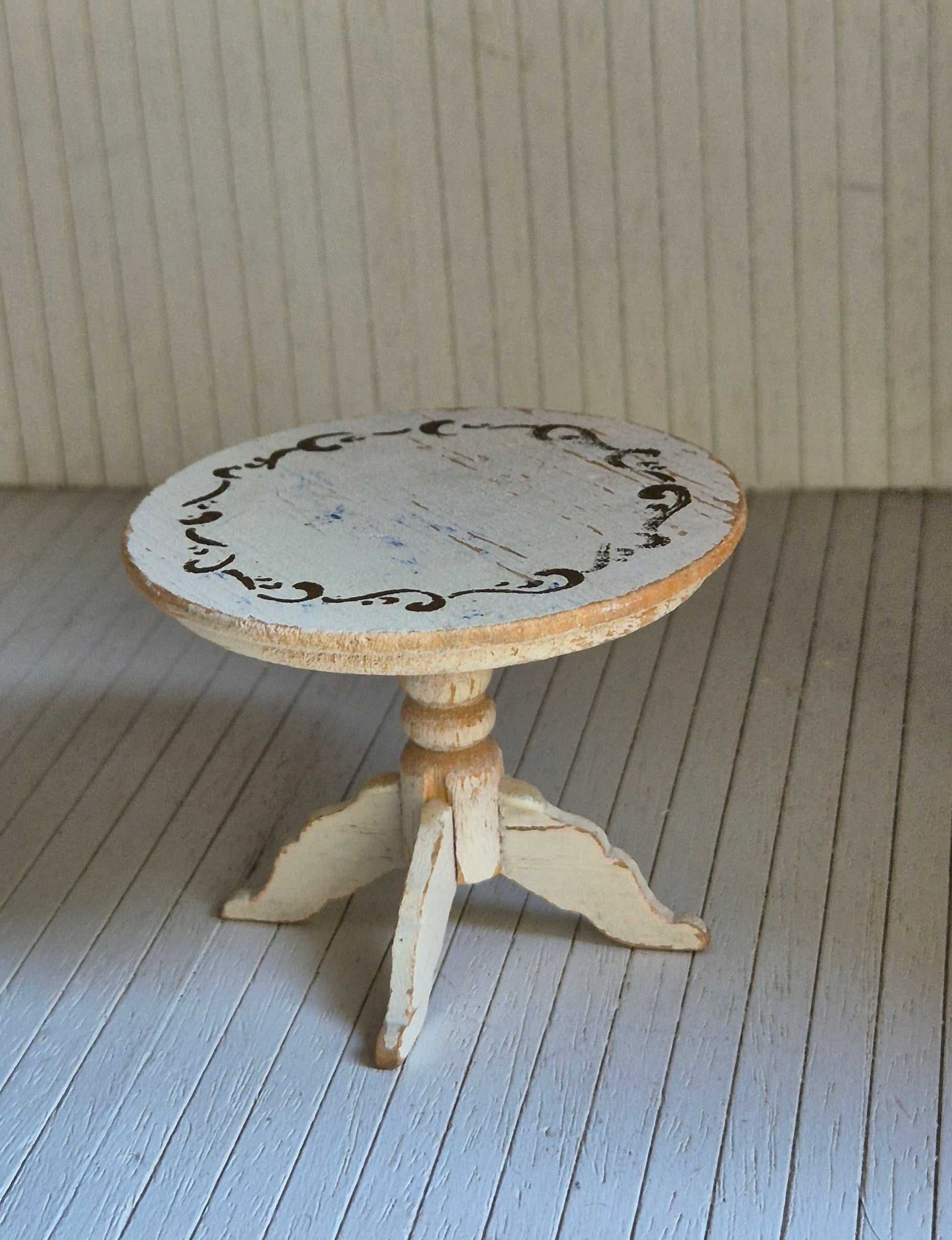 Hvidt rundt rokoko bord med masser af patina og spor efter brug. Det er af det danske mærke Hanse af Skandinavien.