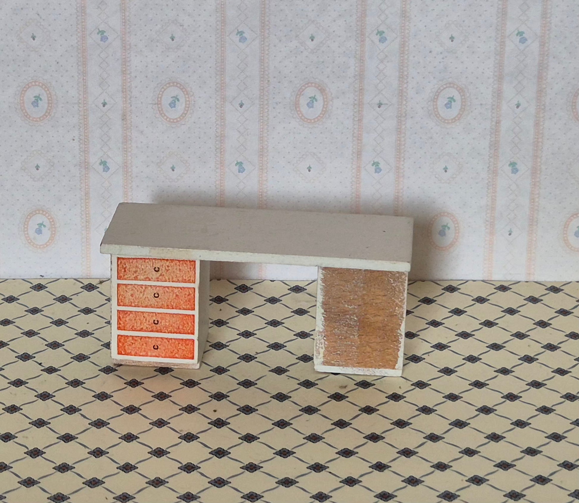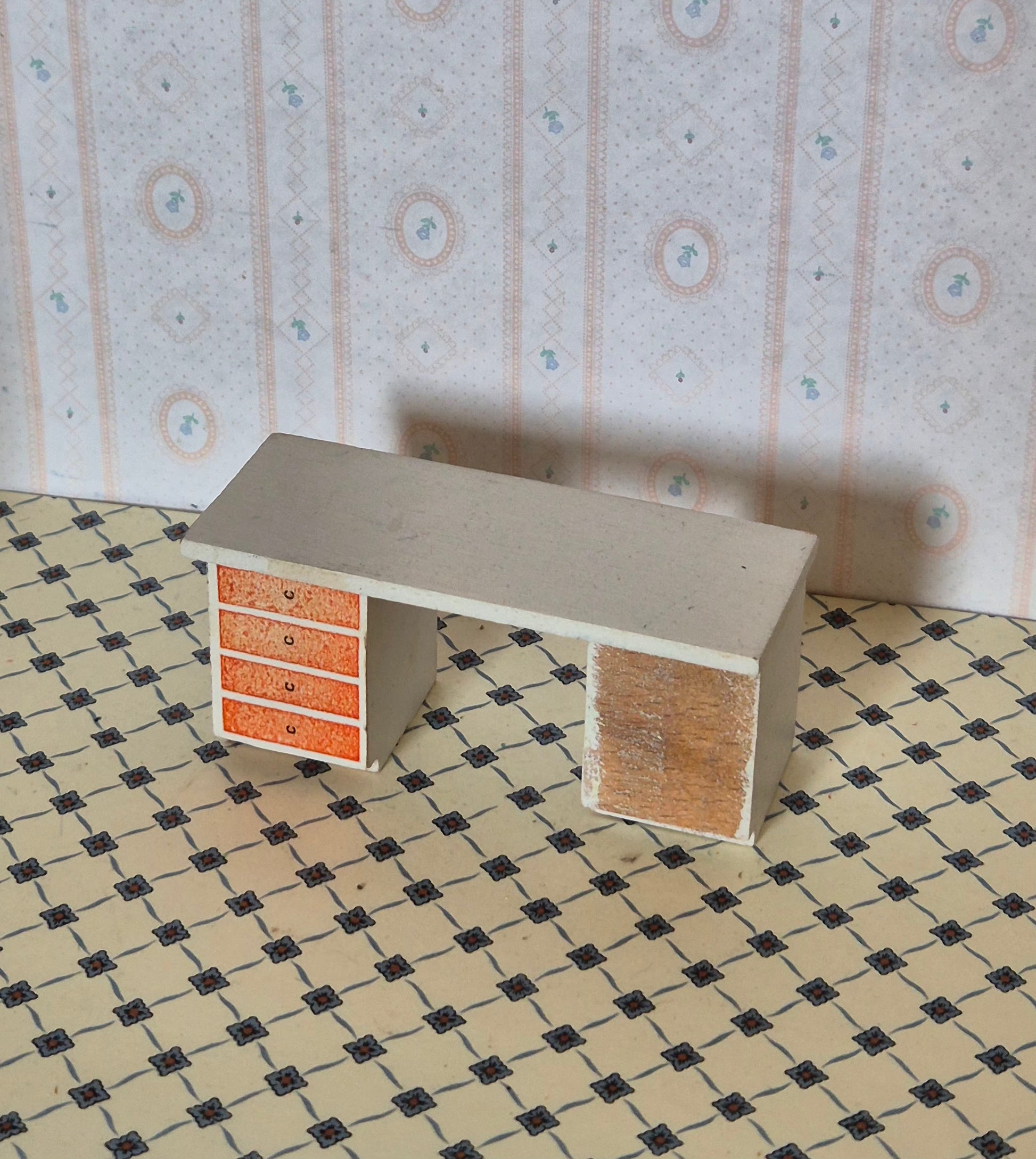Vintage skrivebord til dukkehus børneværelset. Det er af træ 1:16. Det er mærket Hanse af Skandinavien. Det er solbleget.