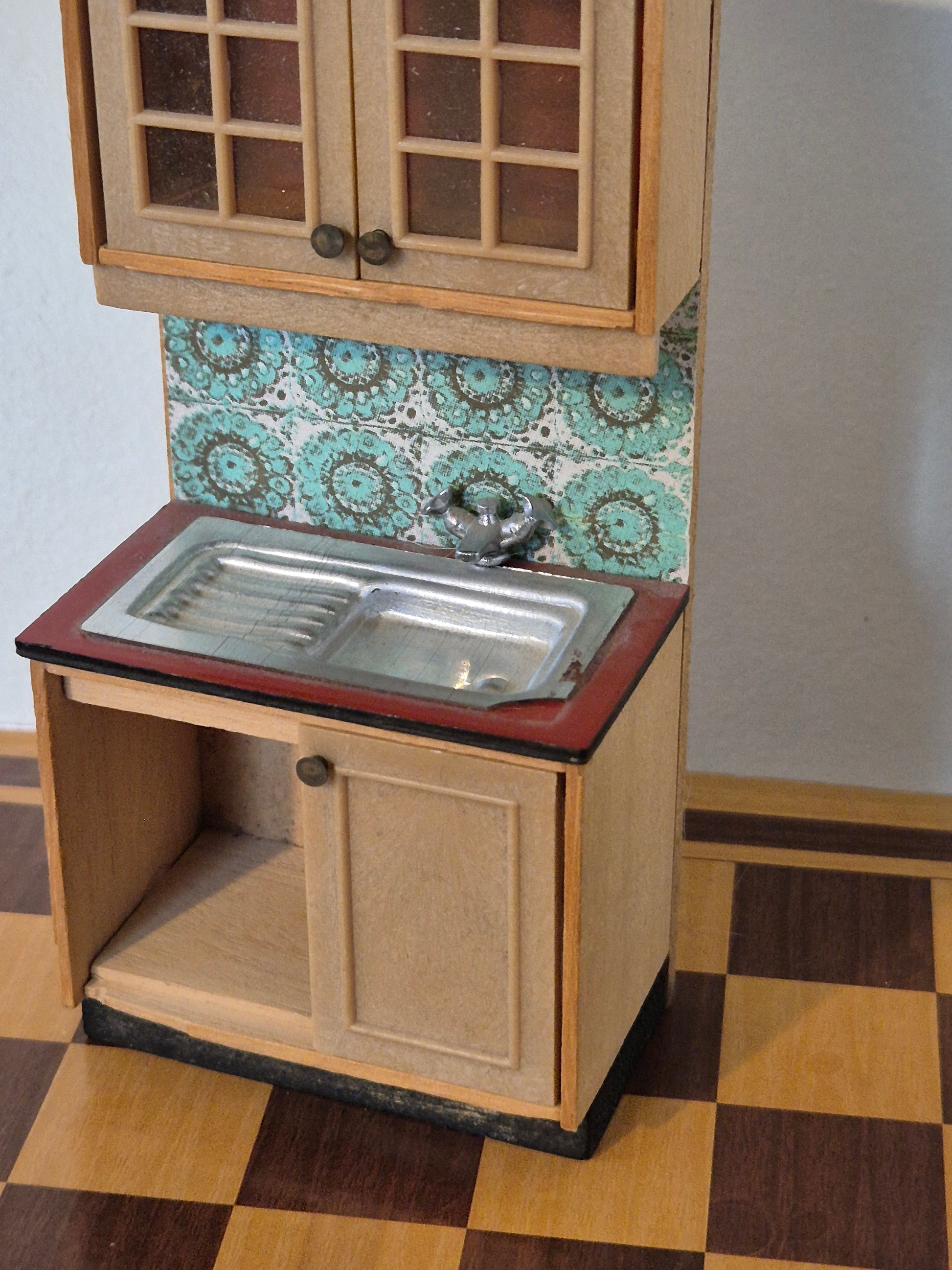 Vintage køkkenvask af mærket Lisa af Danmark hvor der mangler en låge. Der er spor af brug og patina.