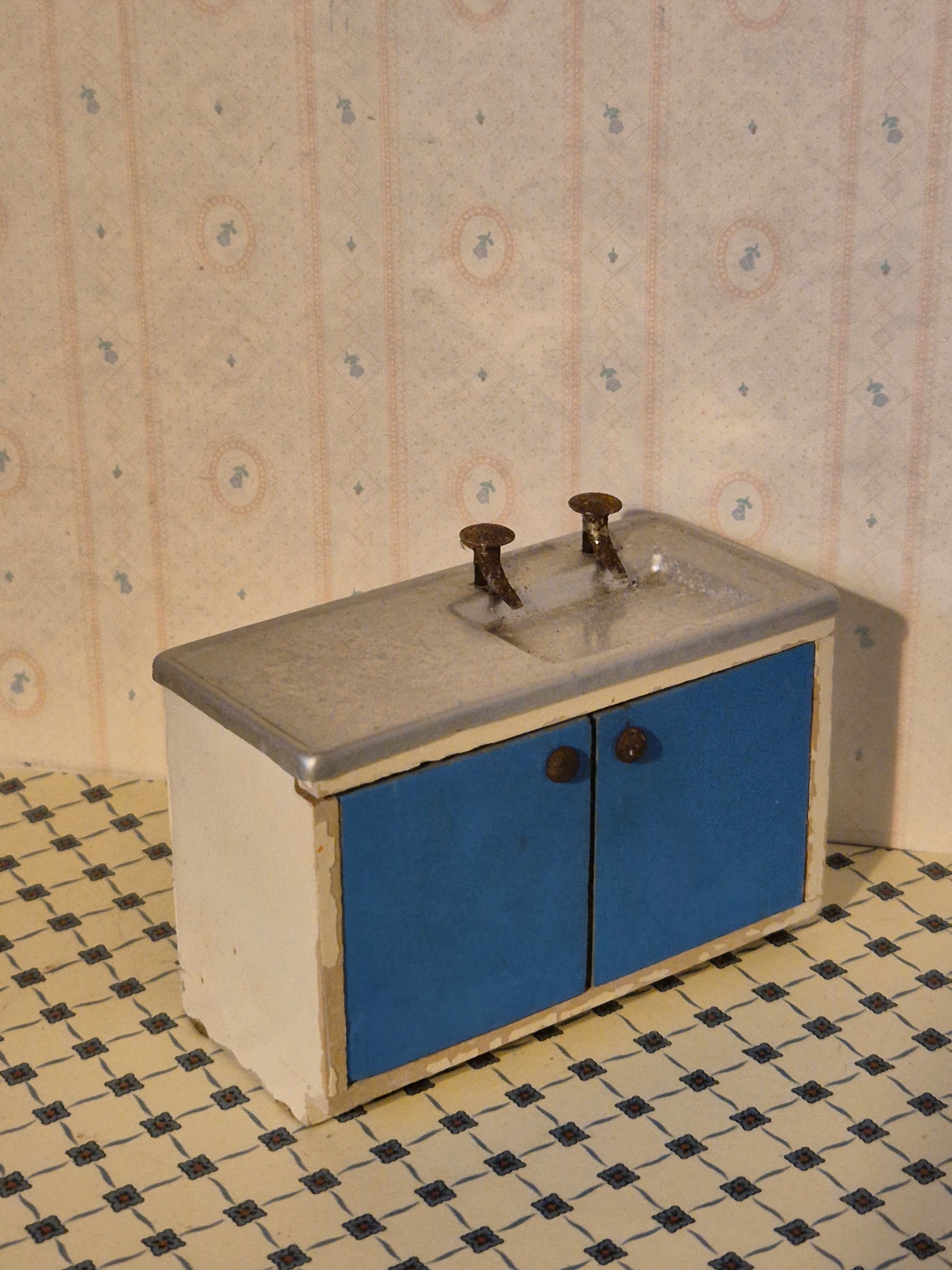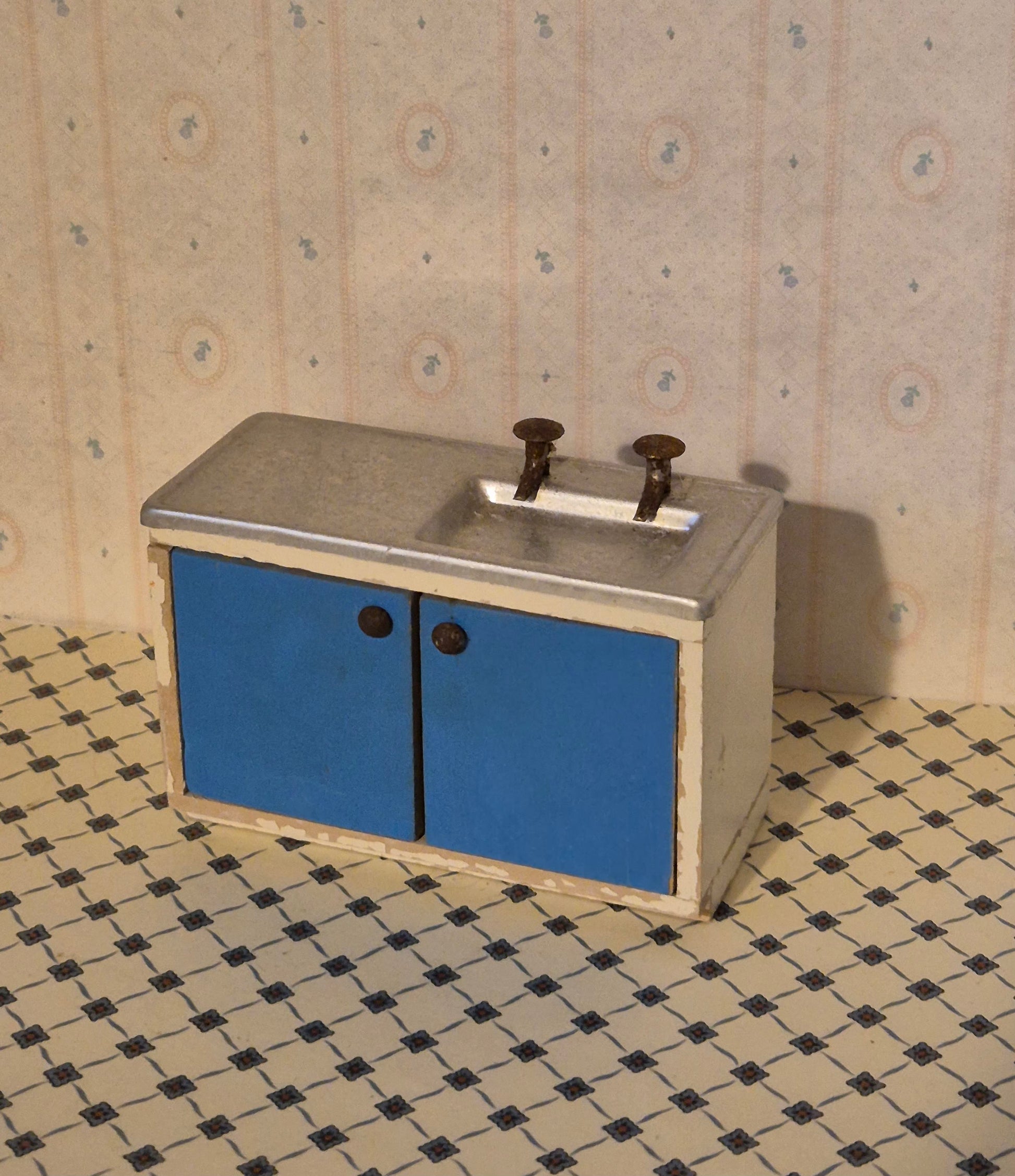 Pæn Lisa af Danmark køkkenvask af træ i blå, metal og hvid. Der er patina og brugsspor, men ellers intakt og i udmærket stand