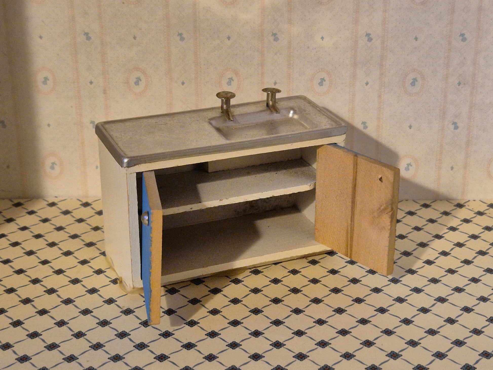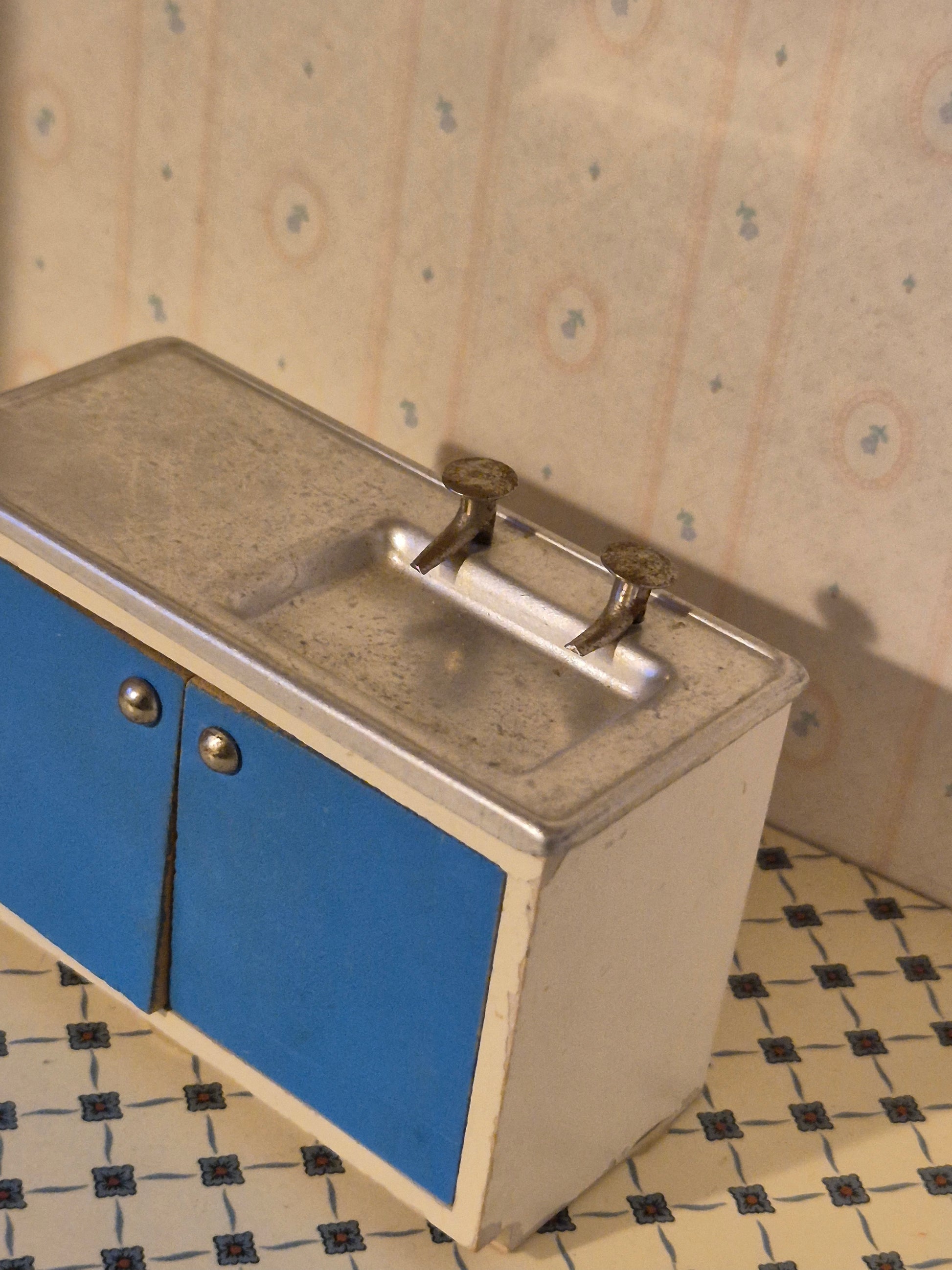 Ældre køkkenvask element af træ og metal af mærket Lisa af Danmark. Der er patina og brugsspor.
