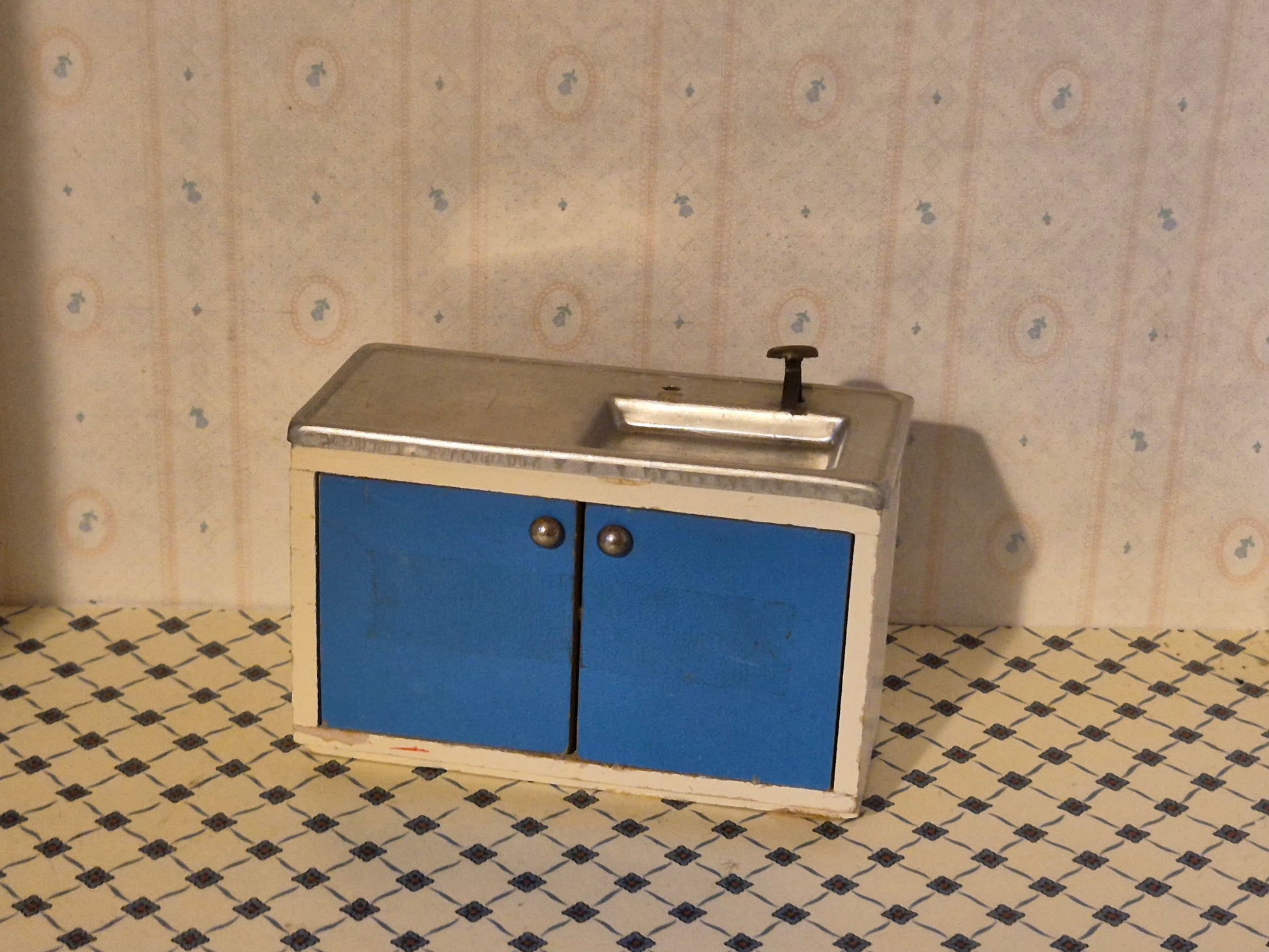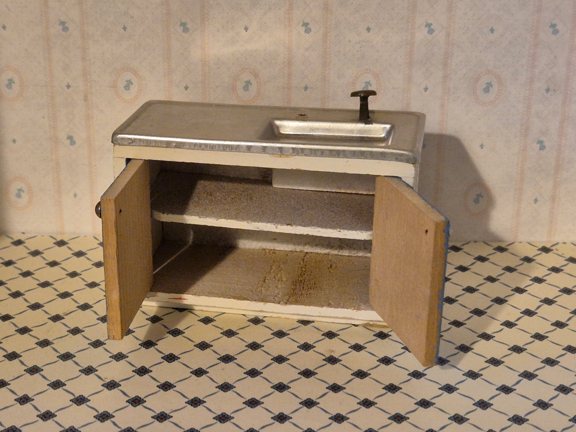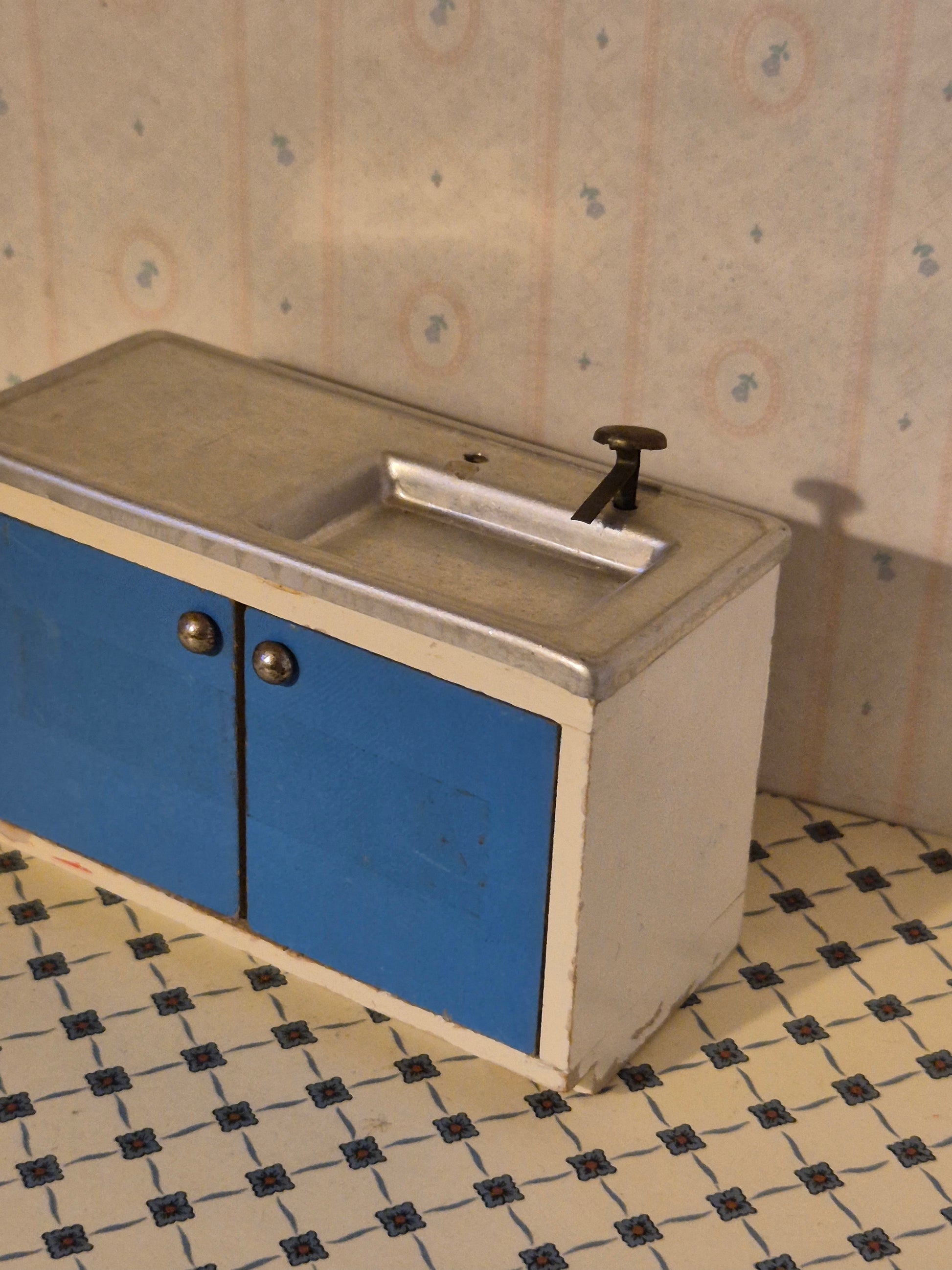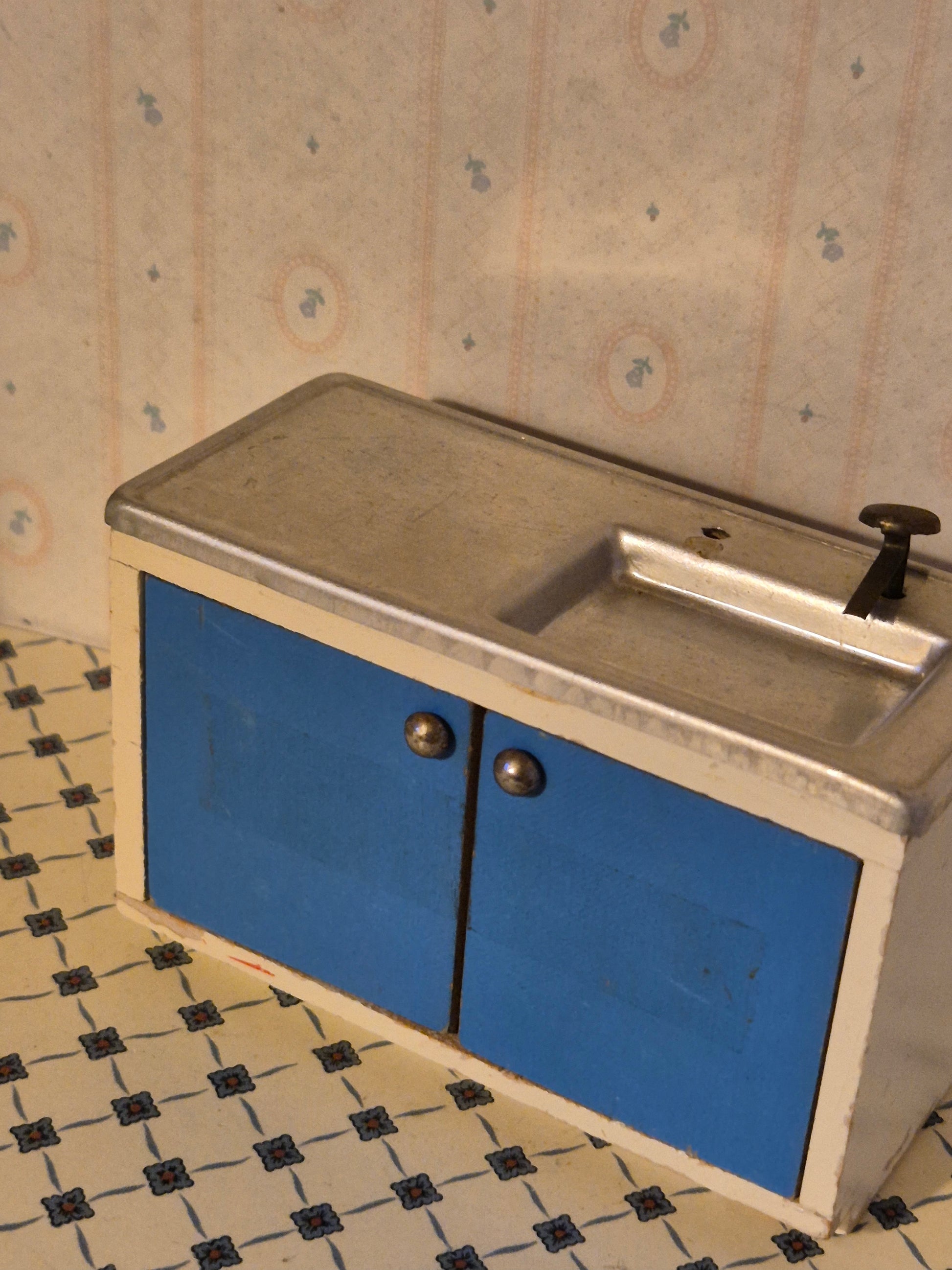 Lisa af Danmark køkkenvask element til dukkehus 1:16. Det er af træ og metal.
