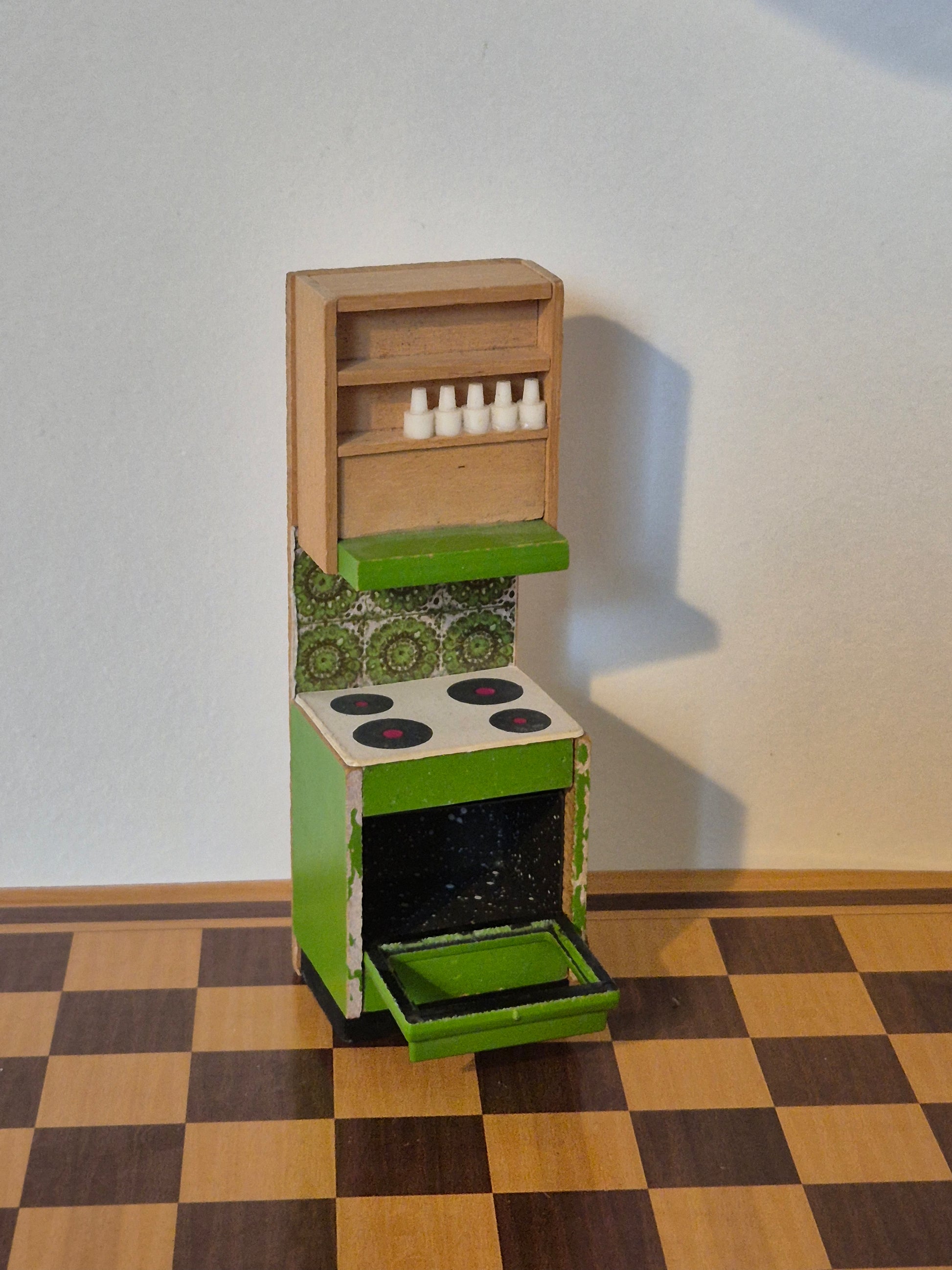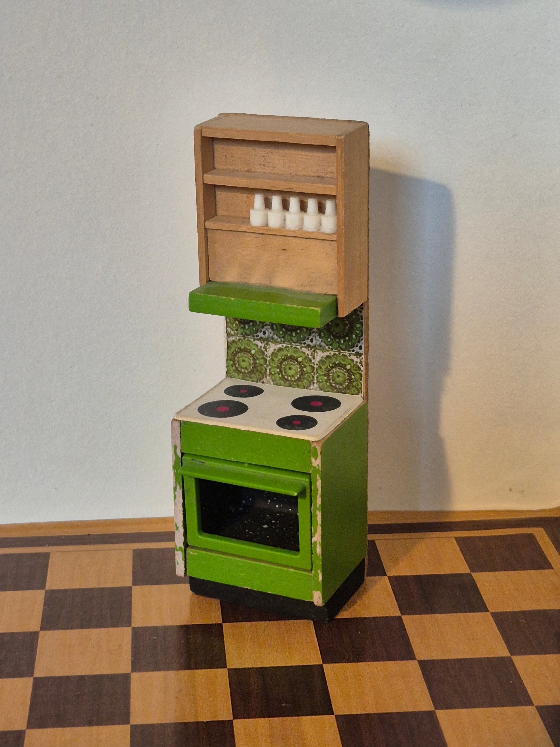 Vintage komfur af Lisa af Danmark i den grønne køkken-serie fra slutningen af 1970erne. Der er mangler fx klistermærker. Derudover er flere skrammer og slidmærker.