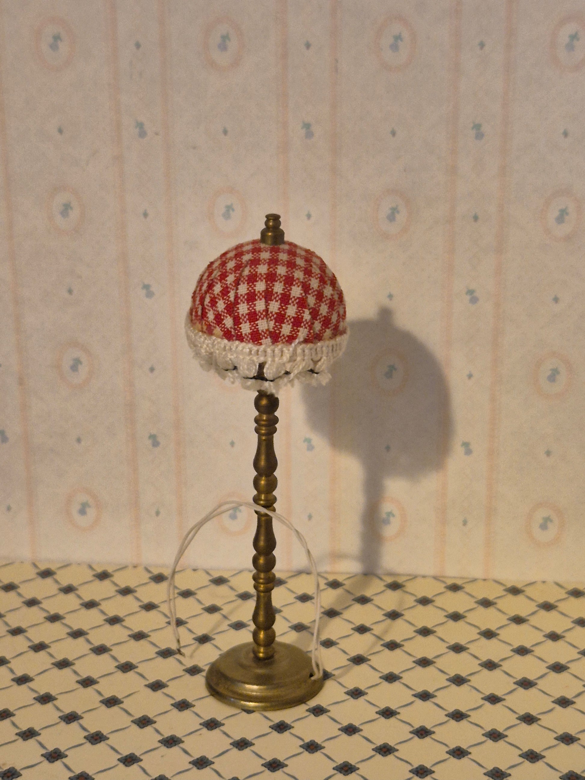 Pæn vintage lampe, standerlampe, med metal stang og ternet rød og hvid skærm.