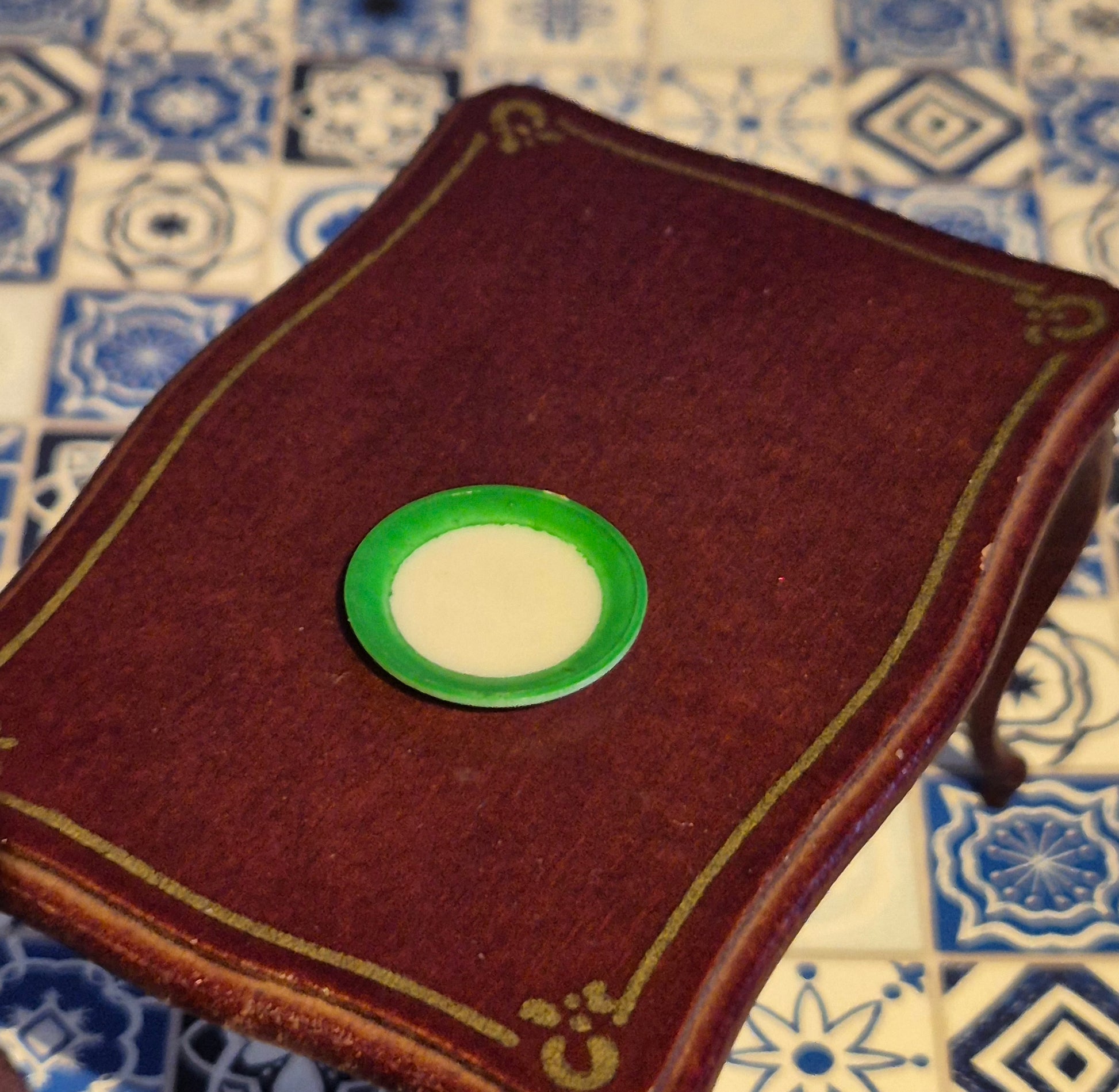 Fin hvid flad tallerken med grøn kant. God stand, rigtig pæn. Dukkehus tilbehør.