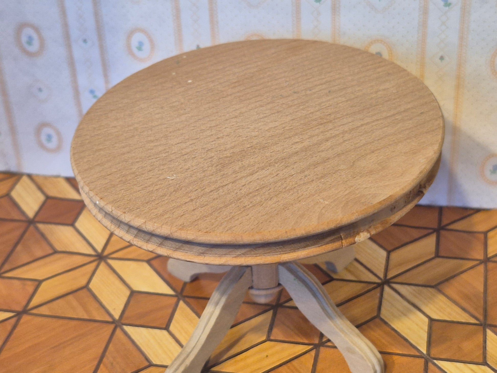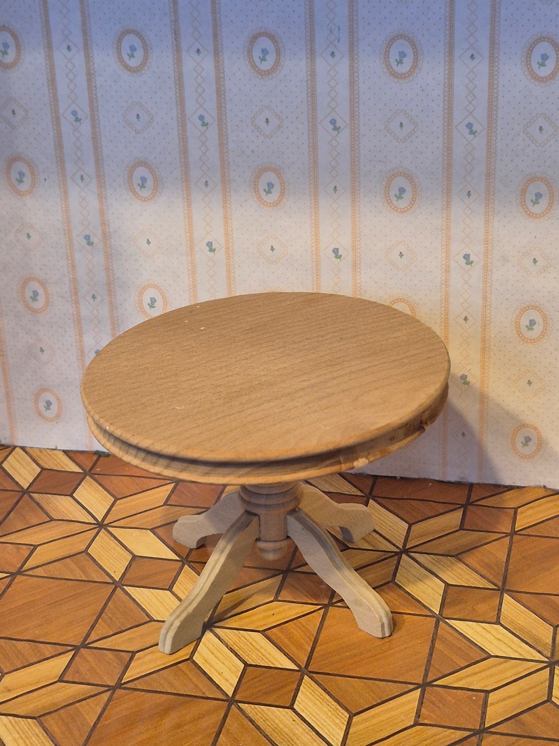1:12 bord af træ. Pænt rundt bord i ubehandlet lyst træ.