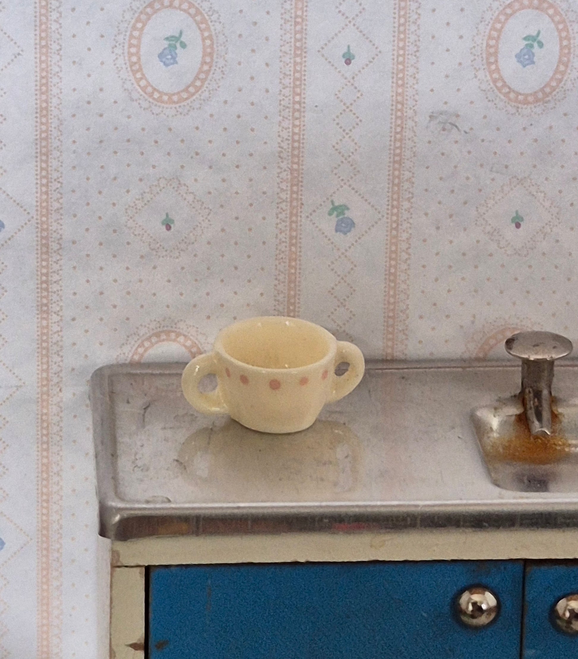 Pæn og fin 1:12 børnekop af plastik med pink prikker
