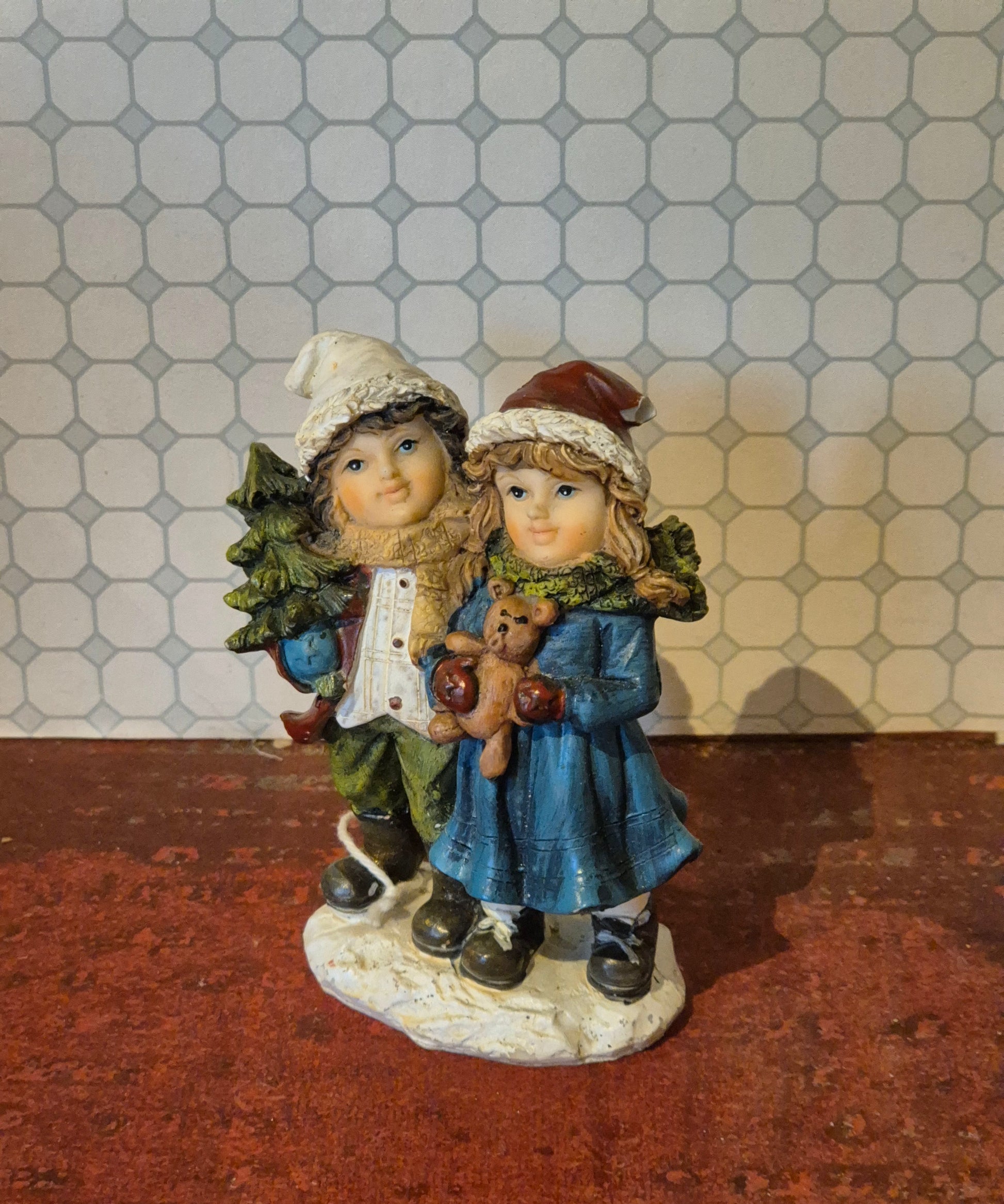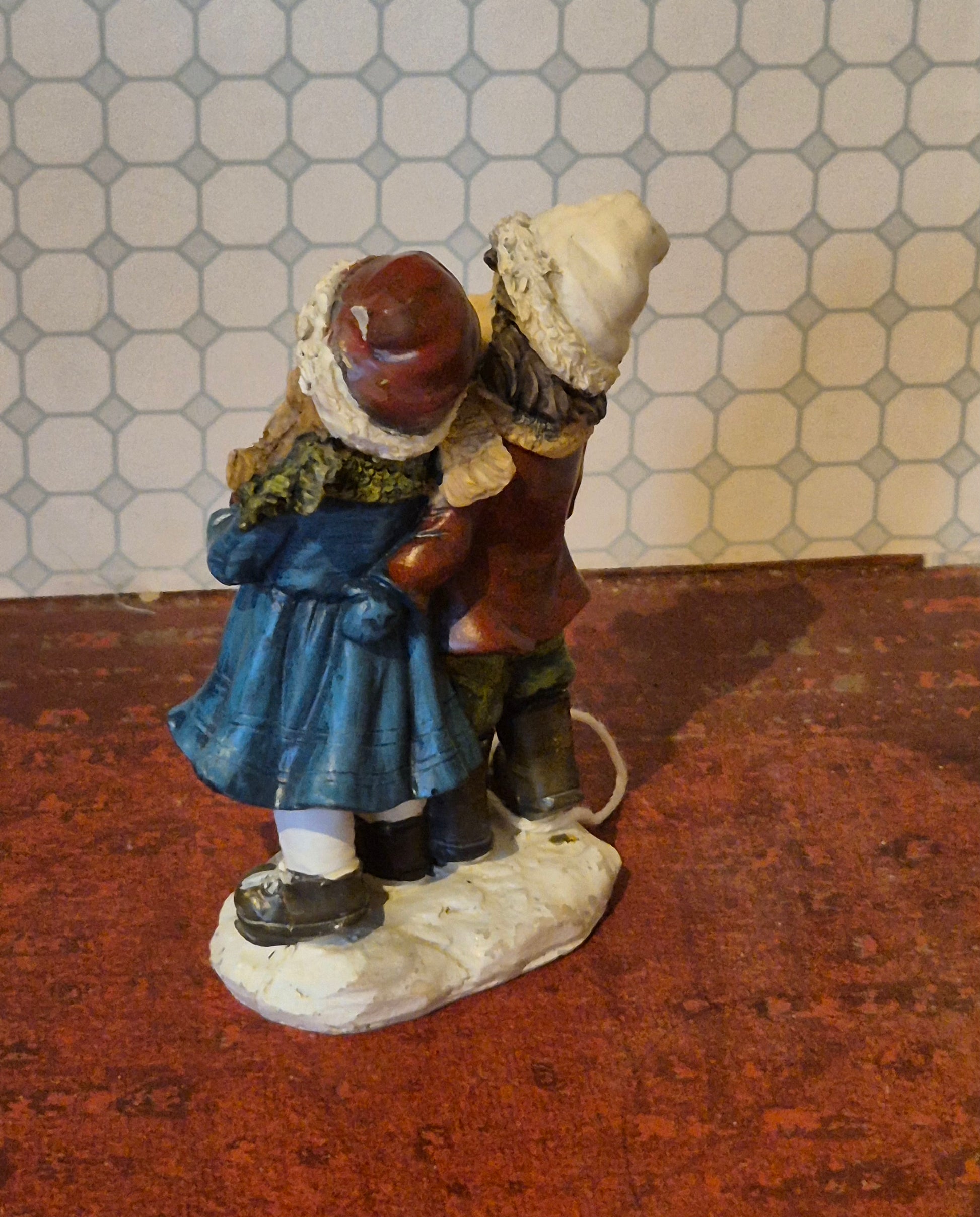 Pæn og fin figur af resin. Det er julemotiv / vintermotiv af 2 børn der går i sneen.