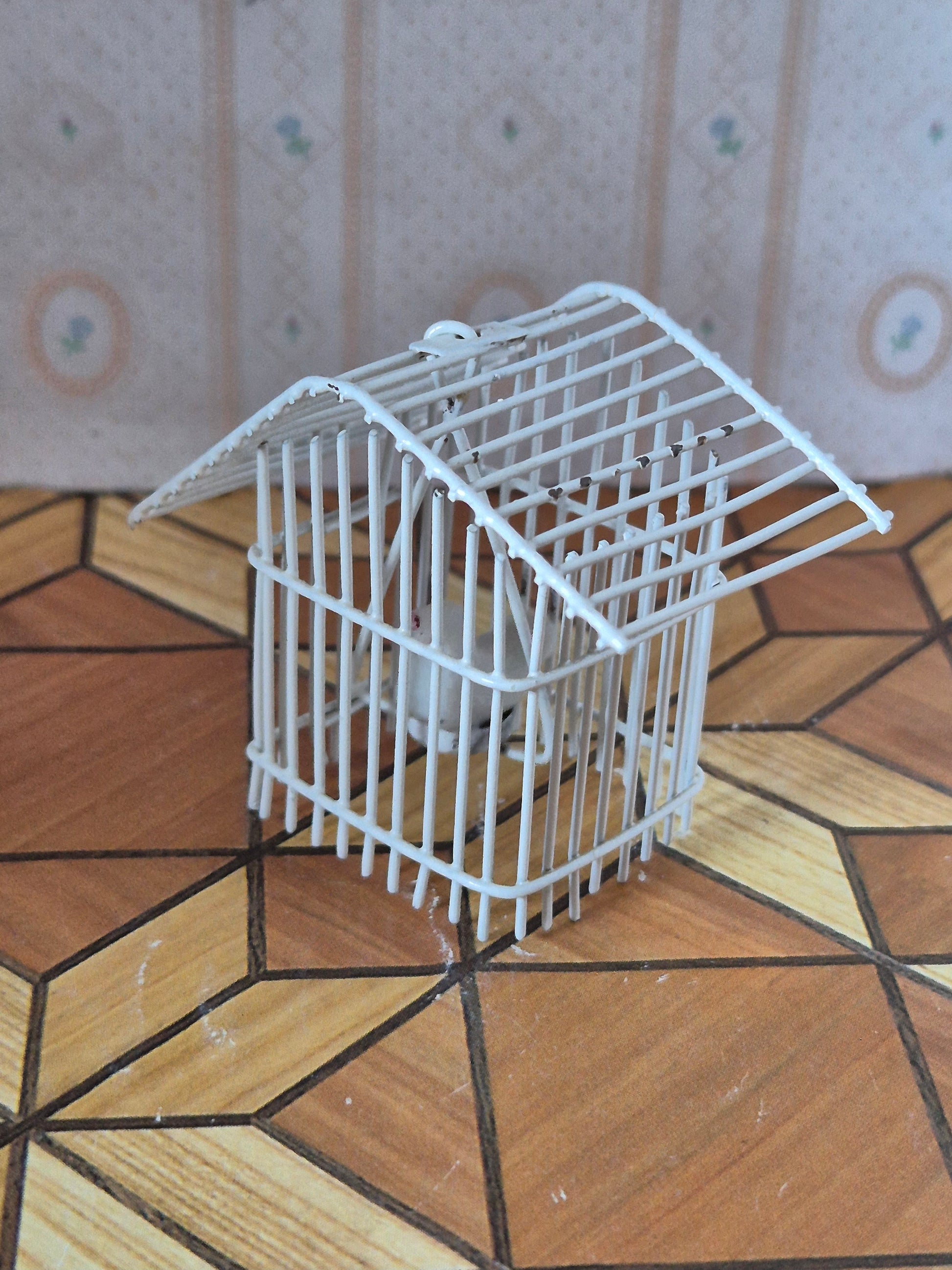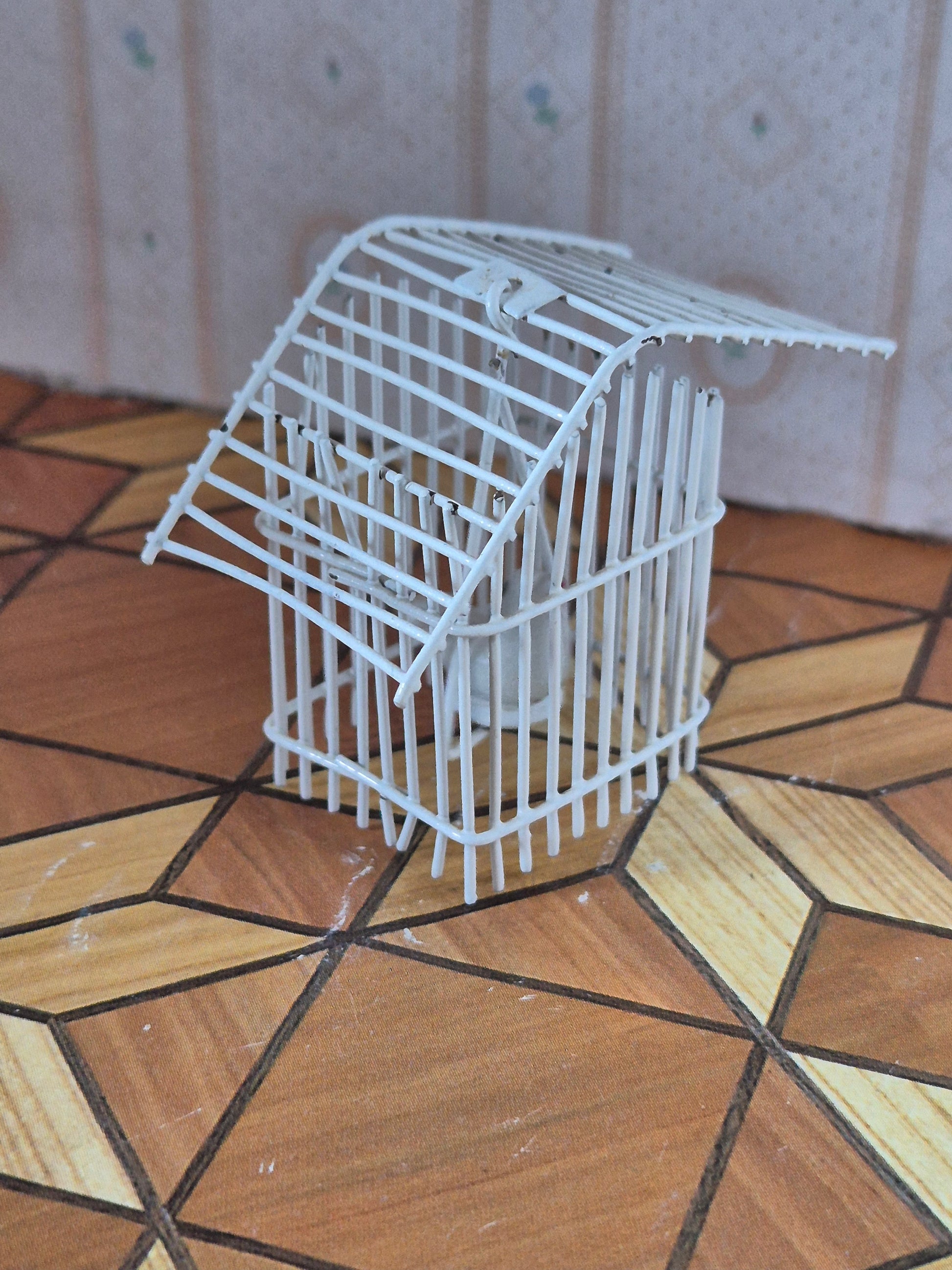Fint hvidt metal fuglebur i 1:12 uden bund. Der er patina og brugsspor.