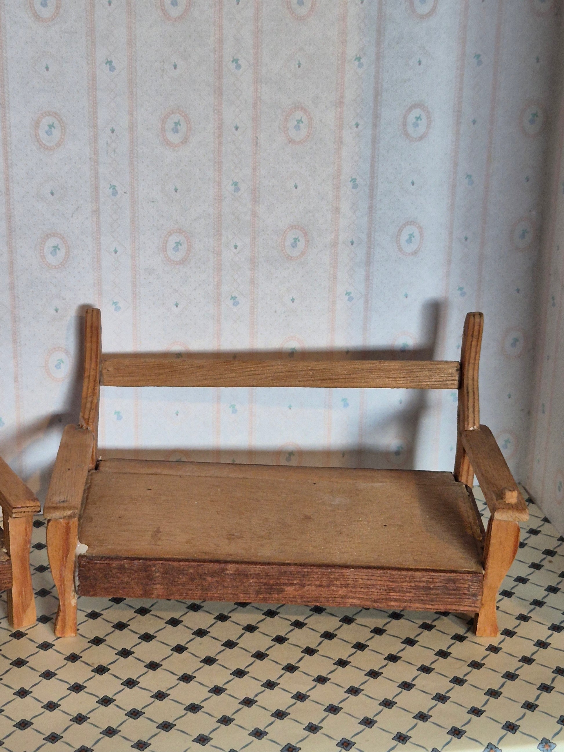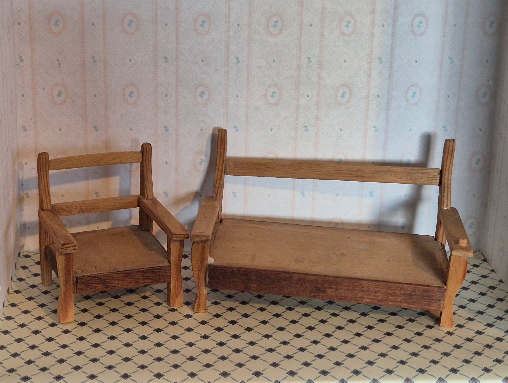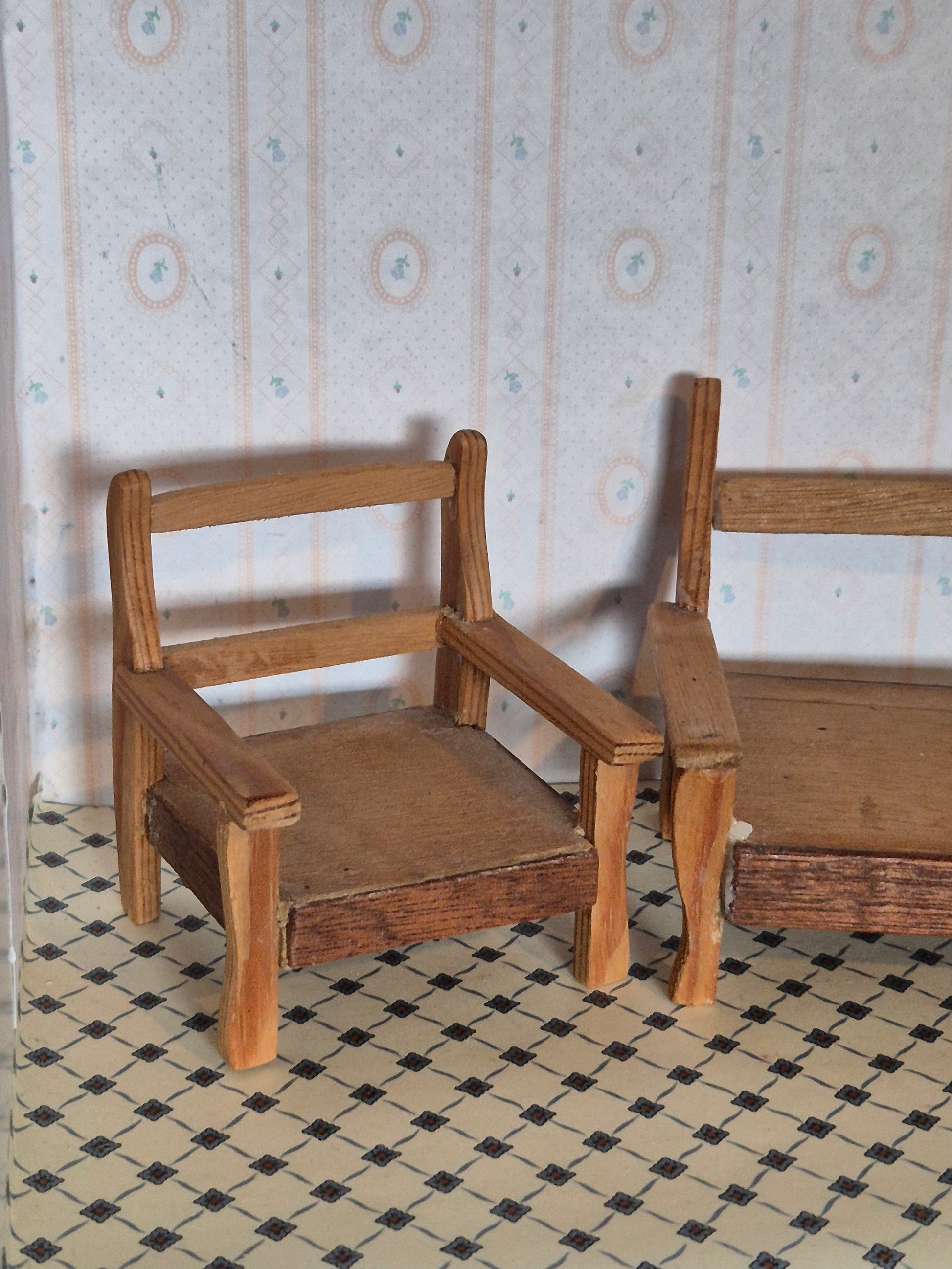Sæt med to havemøbler, bænk og lænestol af træ. De er hjemmelavet og fremstår med fejl og mangler. De er skæve og har brugsspor. Det er 1:12.