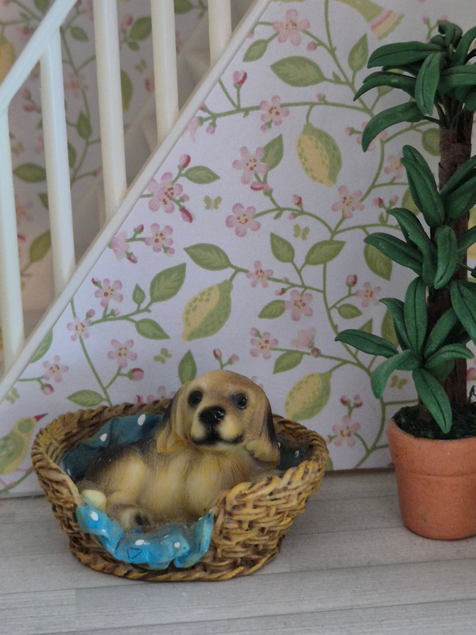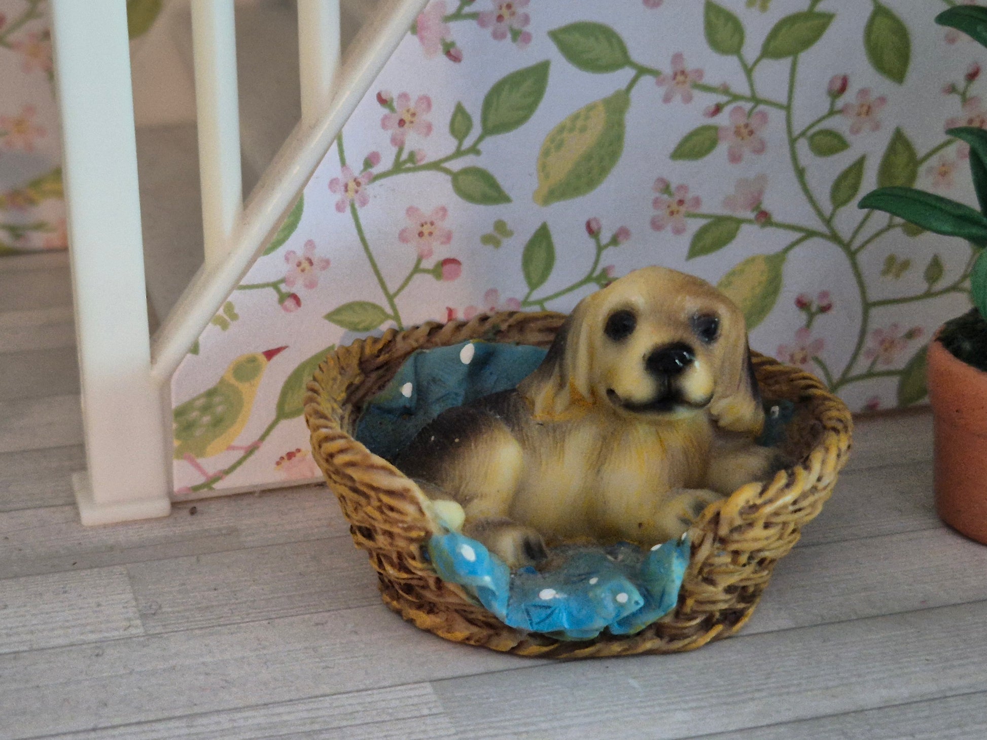 Pæn fin Hund i kurv til str 1:12. Den er af resin. God stand.