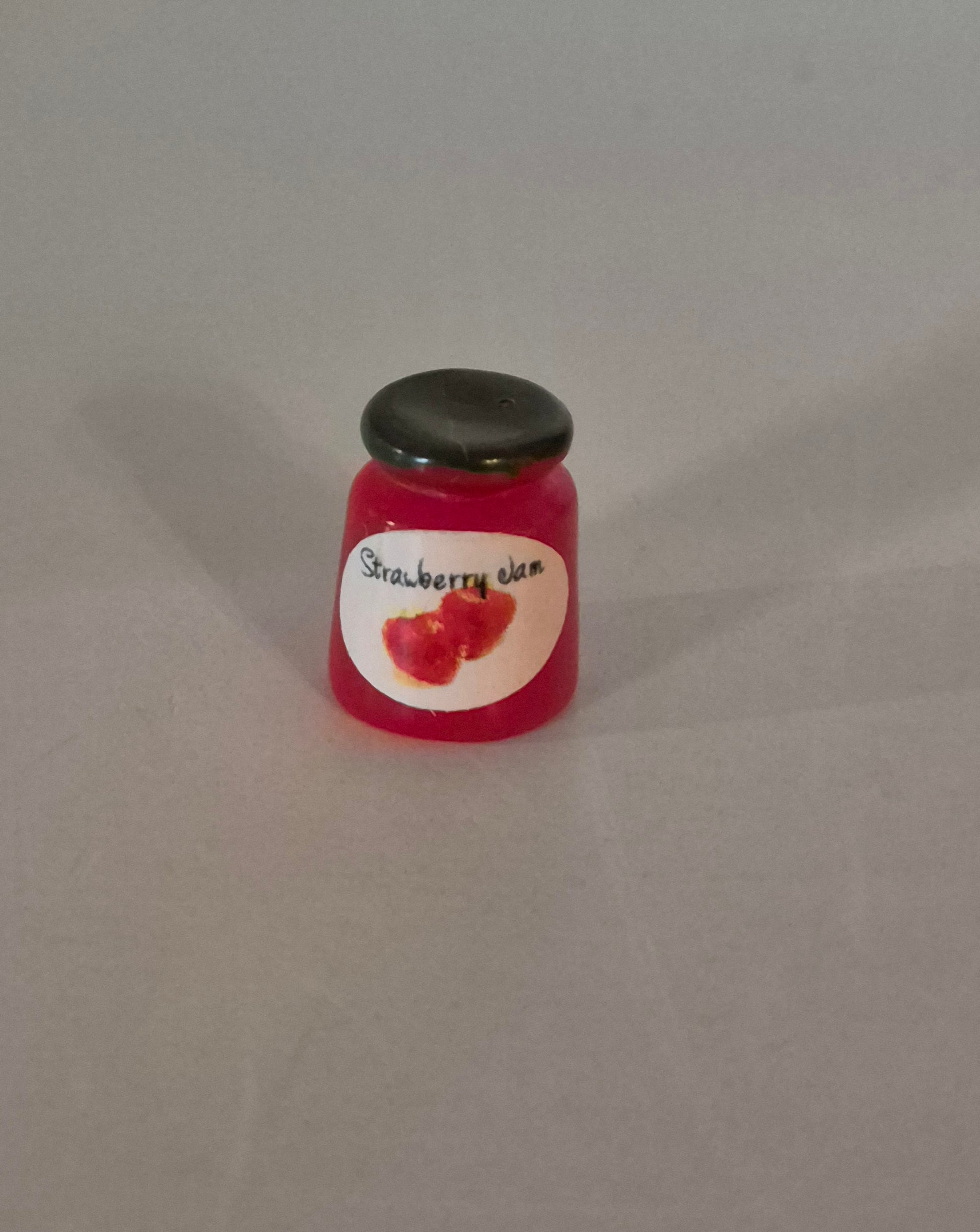 Fint Marmeladeglas med jordbær. Madvarer til dukkehuset. Mad til køkkenet.