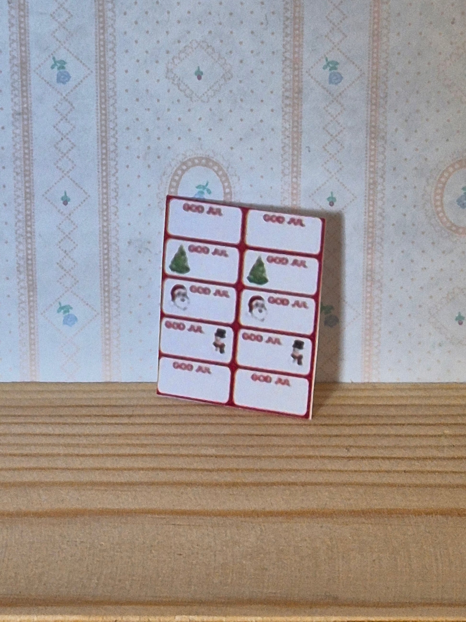 Lille fint ark med jule-gavemærker / til og fra kort til julegaver i str 1:12.