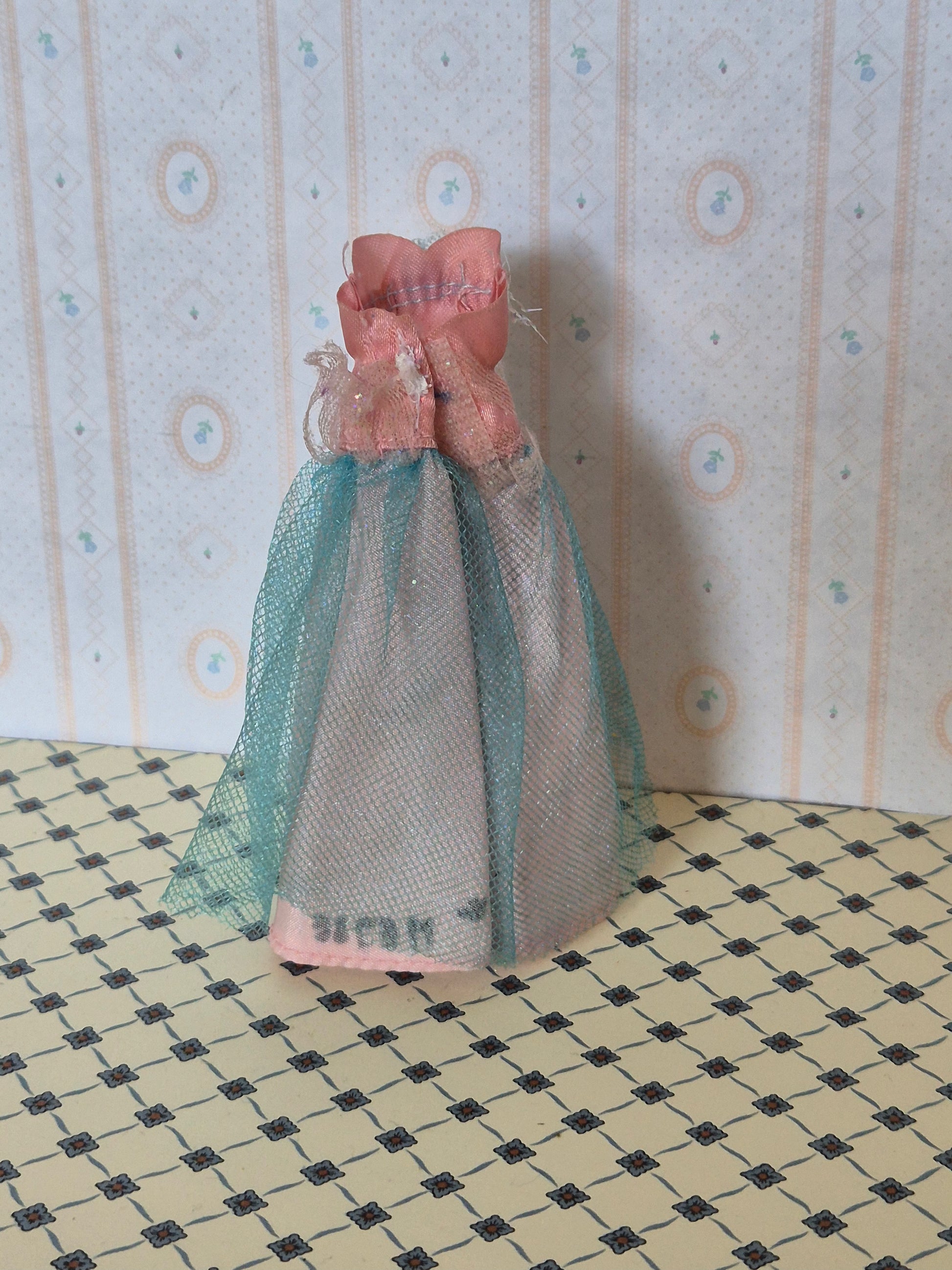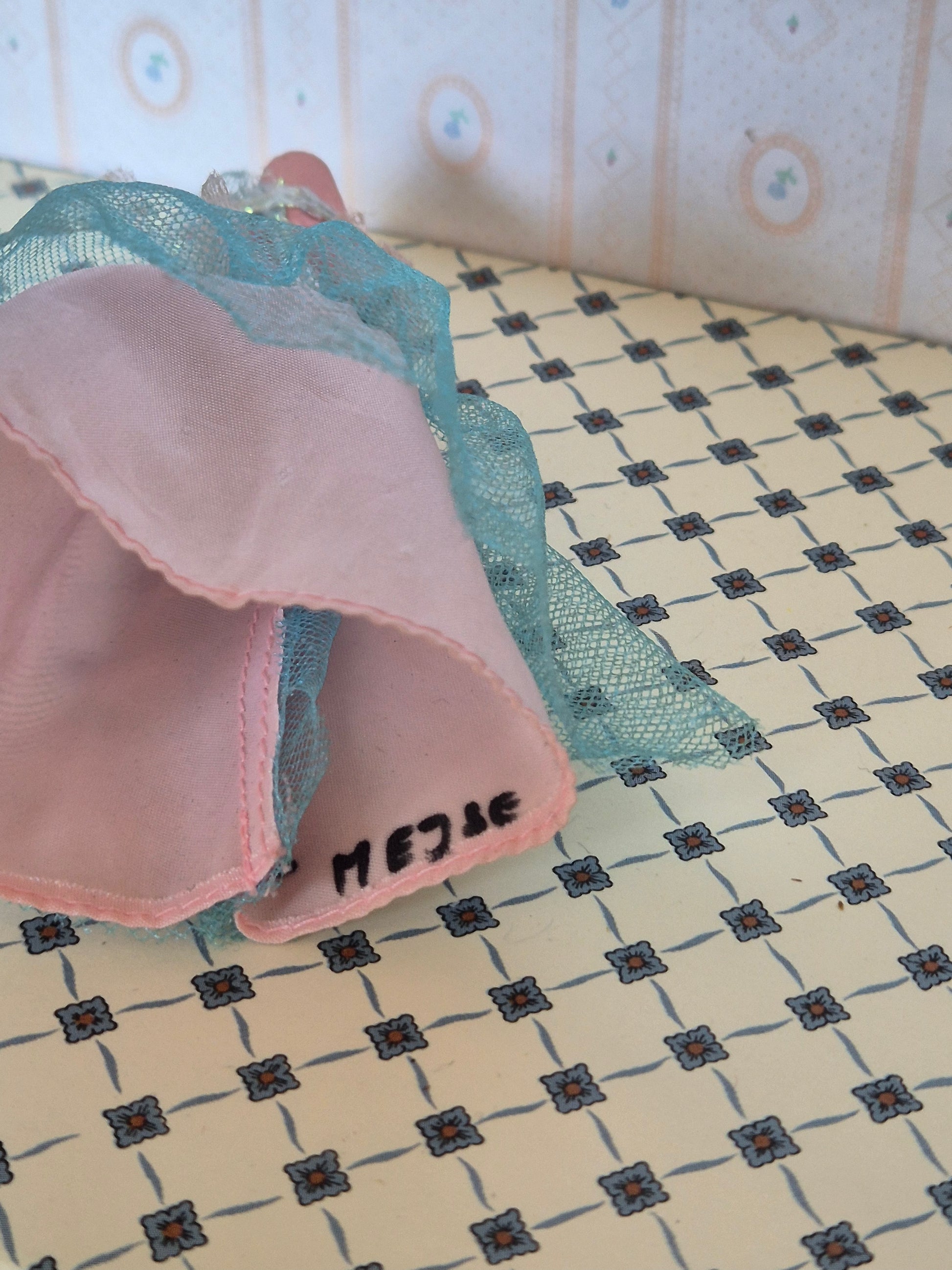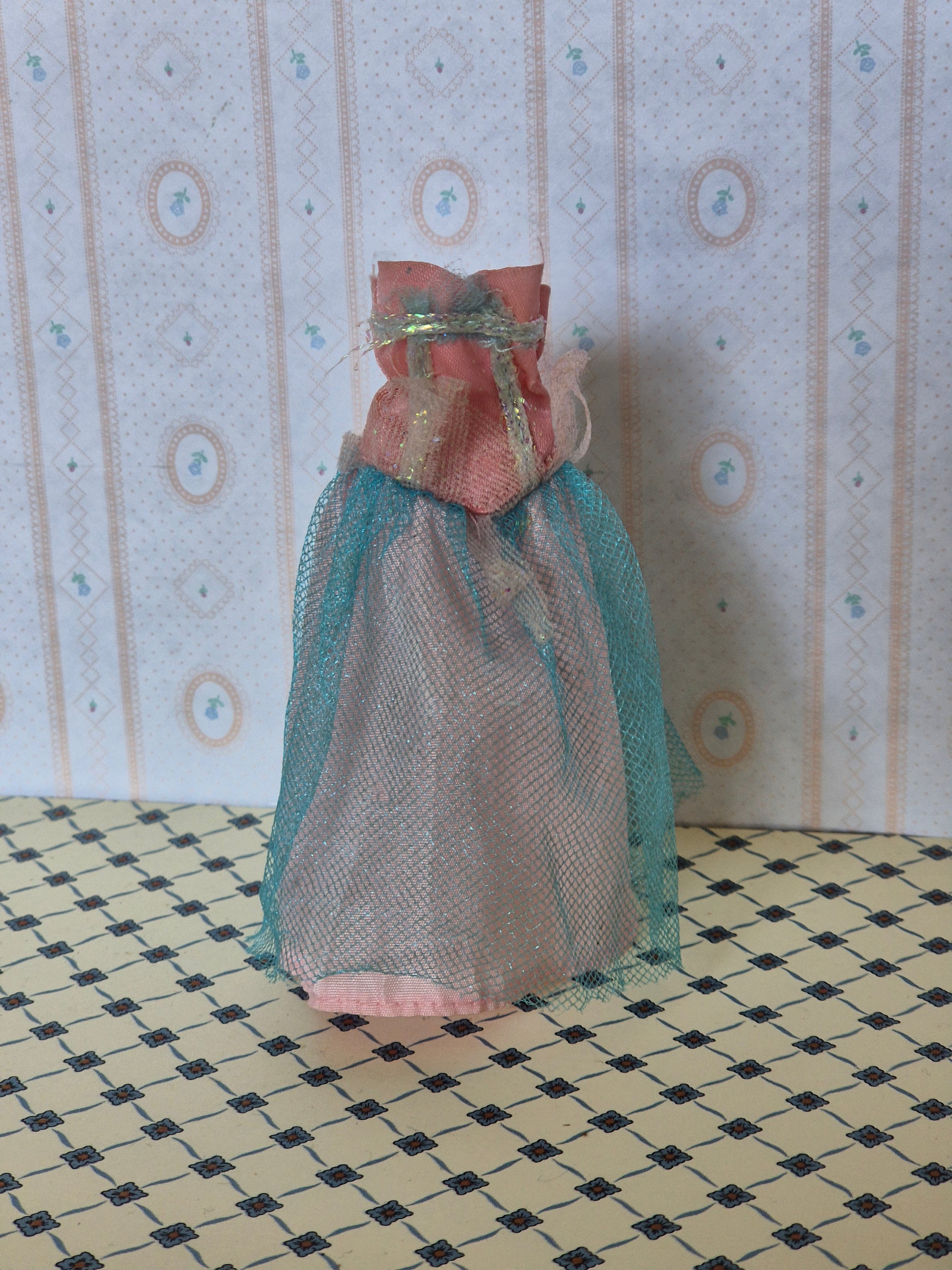 Kjole til 1:12 dukke. Tidligere ejer har skrevet navn i