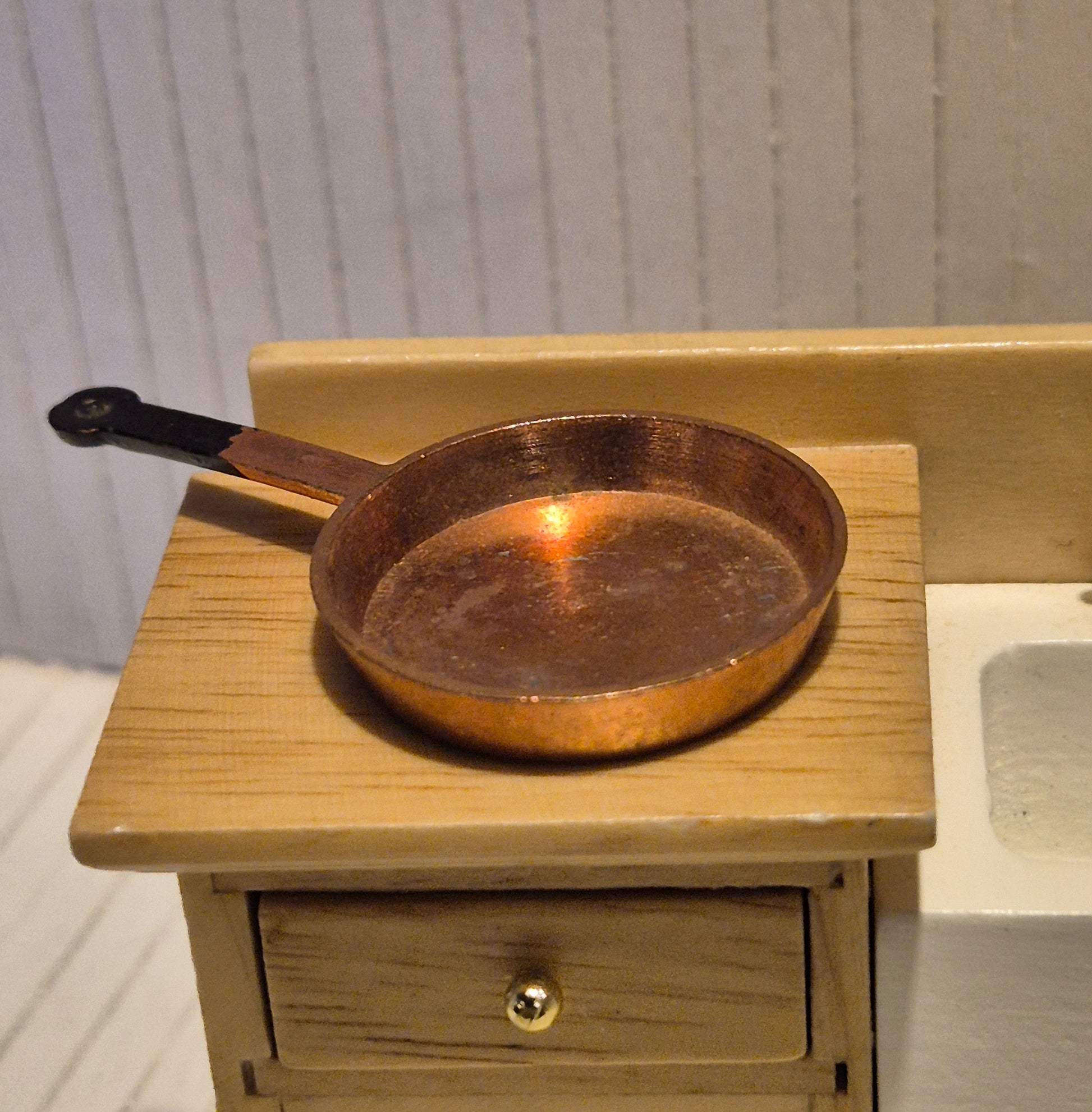 Pæn kobber pande af metal til dukkehuset. Den er str 1:12, men kan fint bruges til 1:10 og egner sig fint til jul fx nissehus.