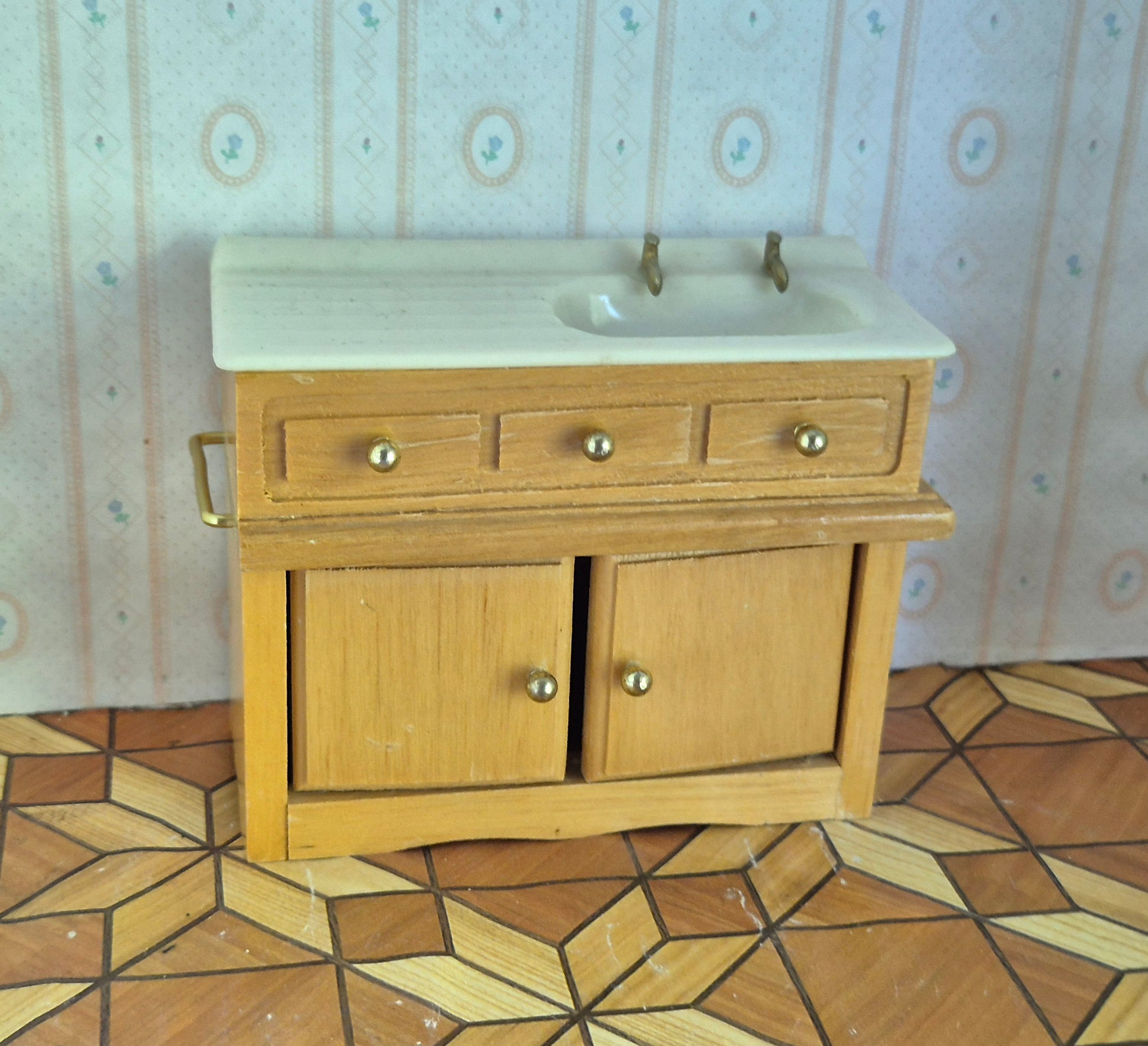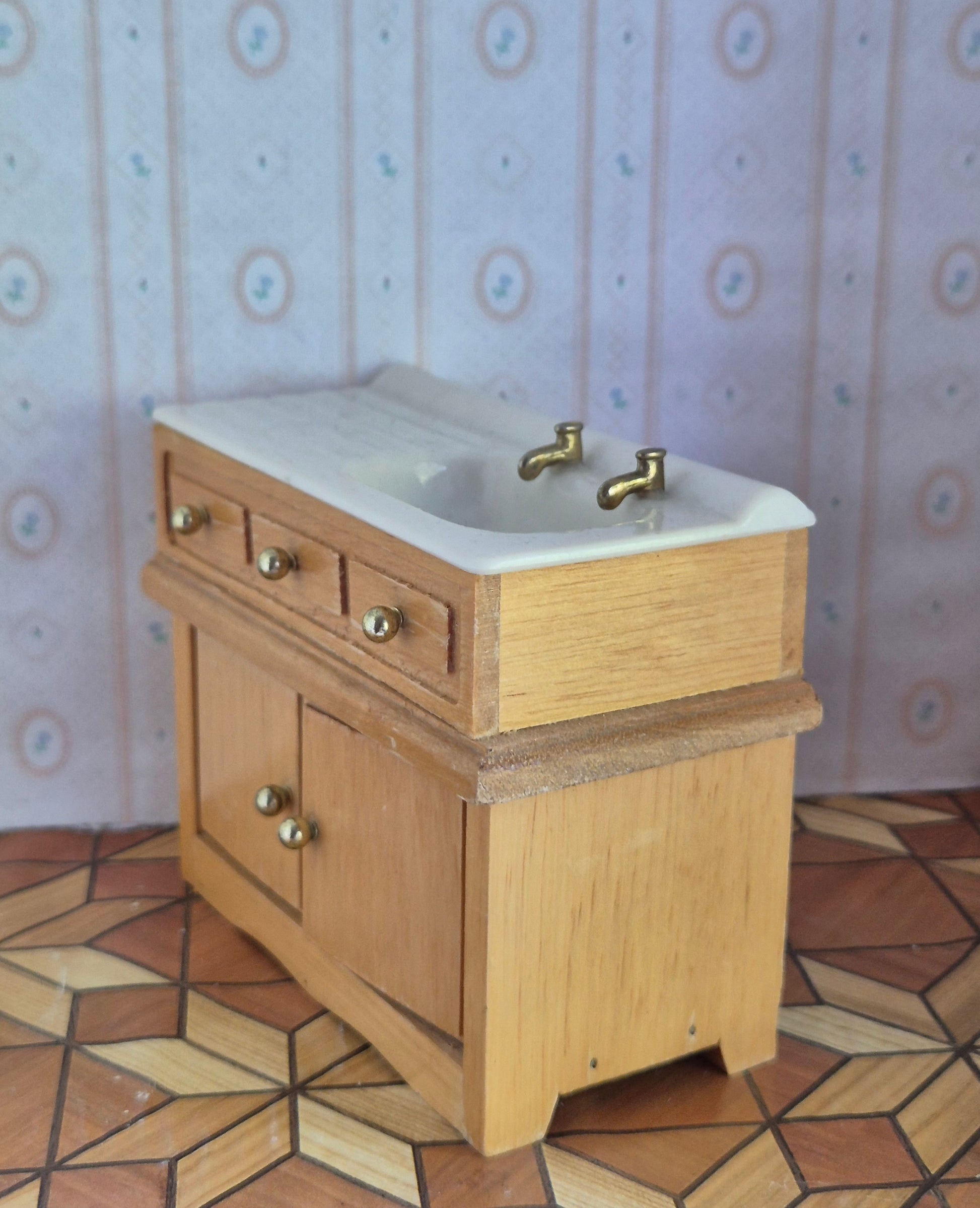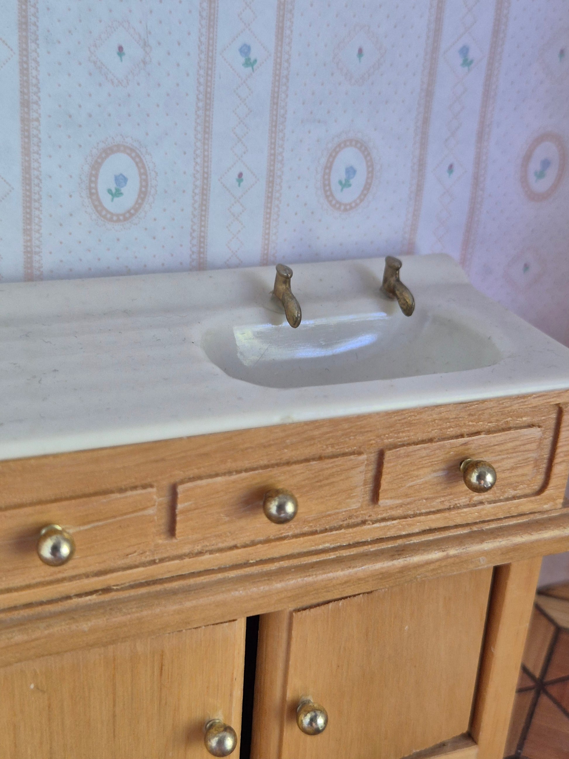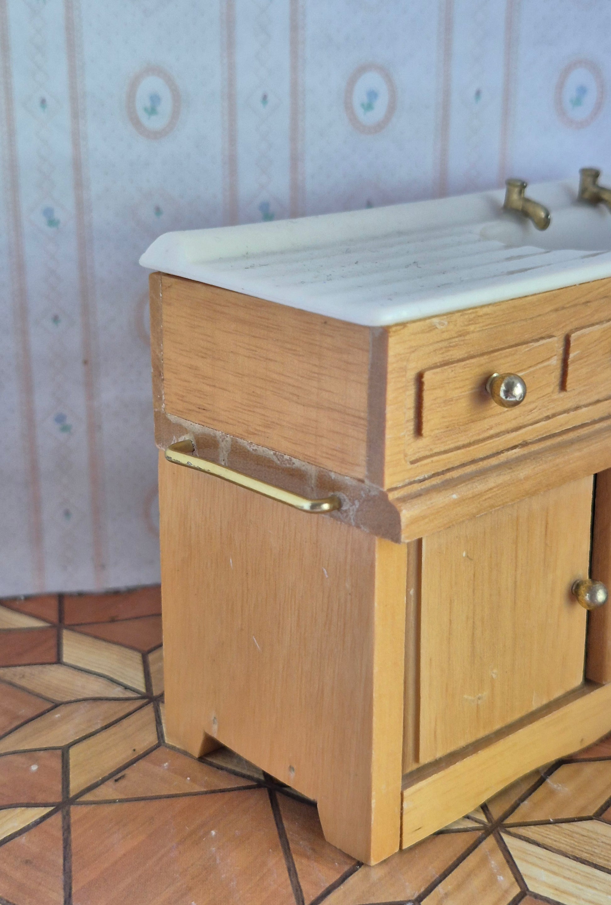 Pænt 1:12 køkkenvask element af træ. Udmærket stand, dog limrester i den ene side.