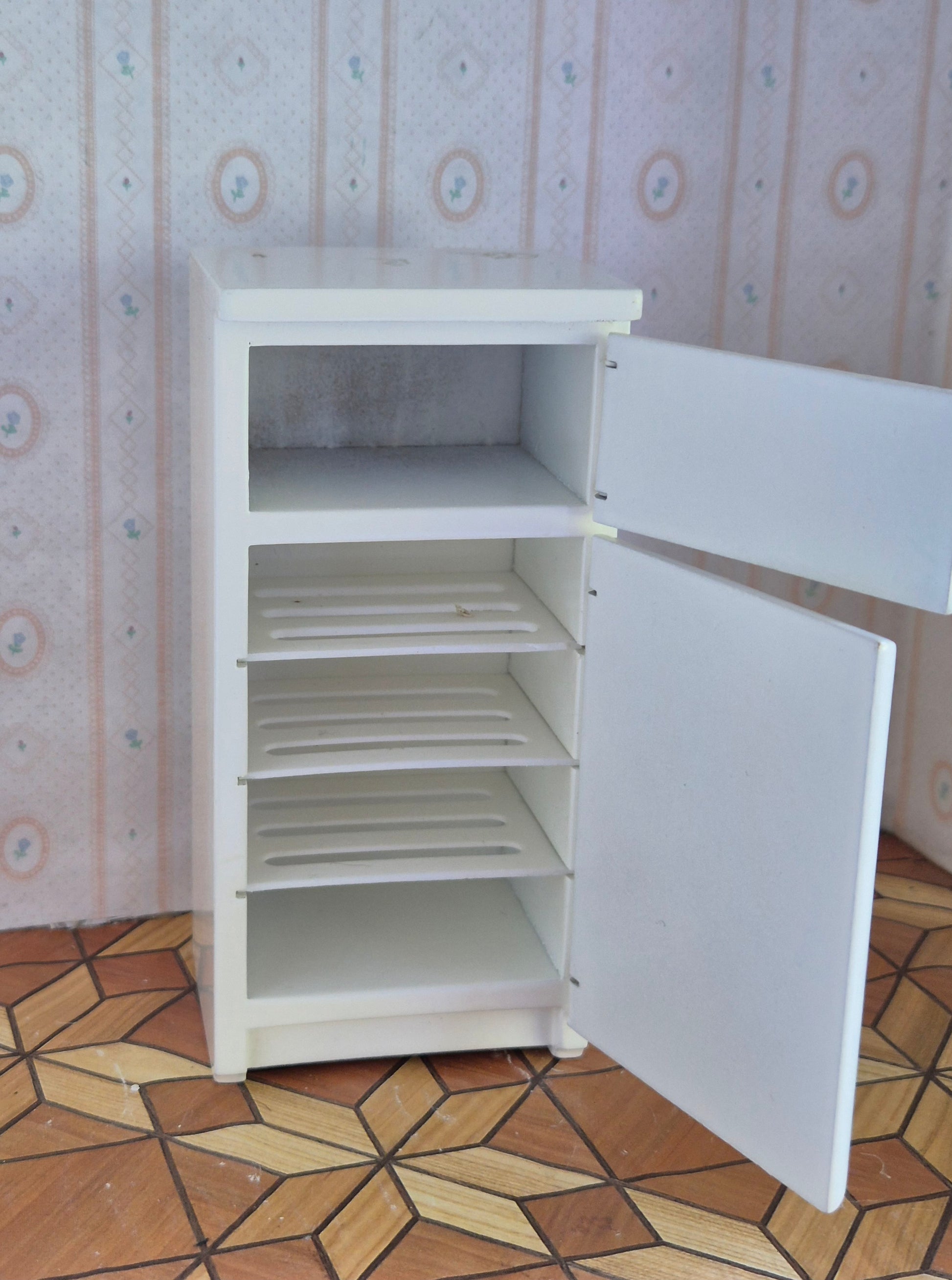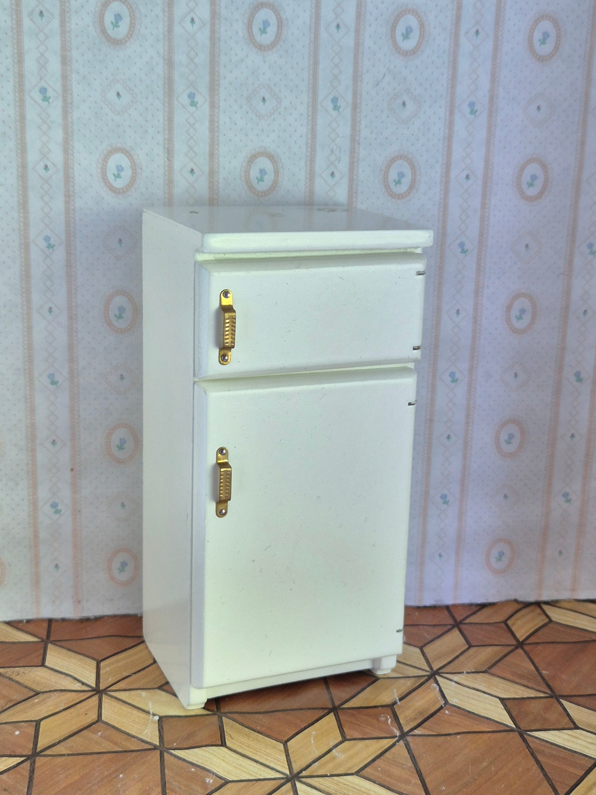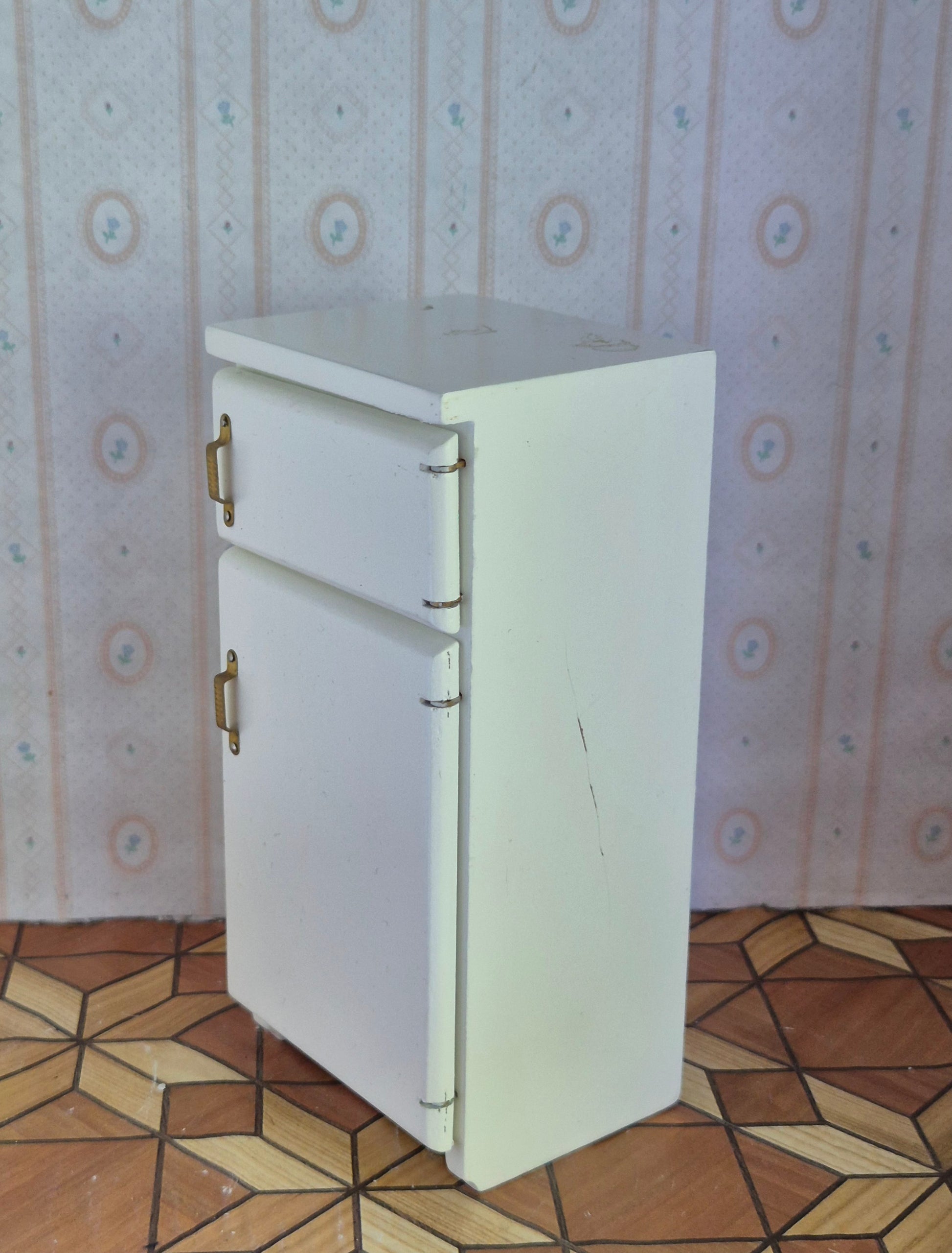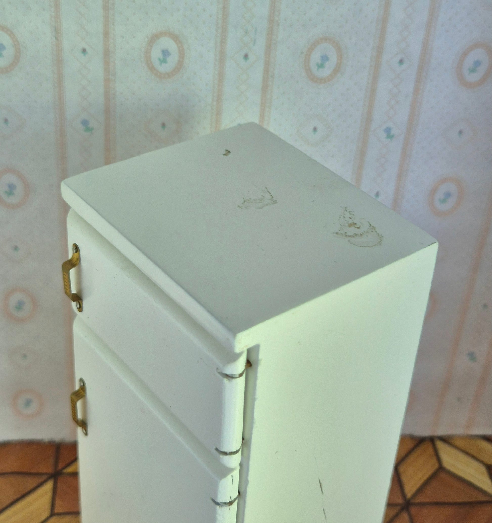Hvidt Køleskab af træ i 1:12 til dukkehus køkkenet. Det har brugsspor og lidt pletter. Ellers udmærket stand.