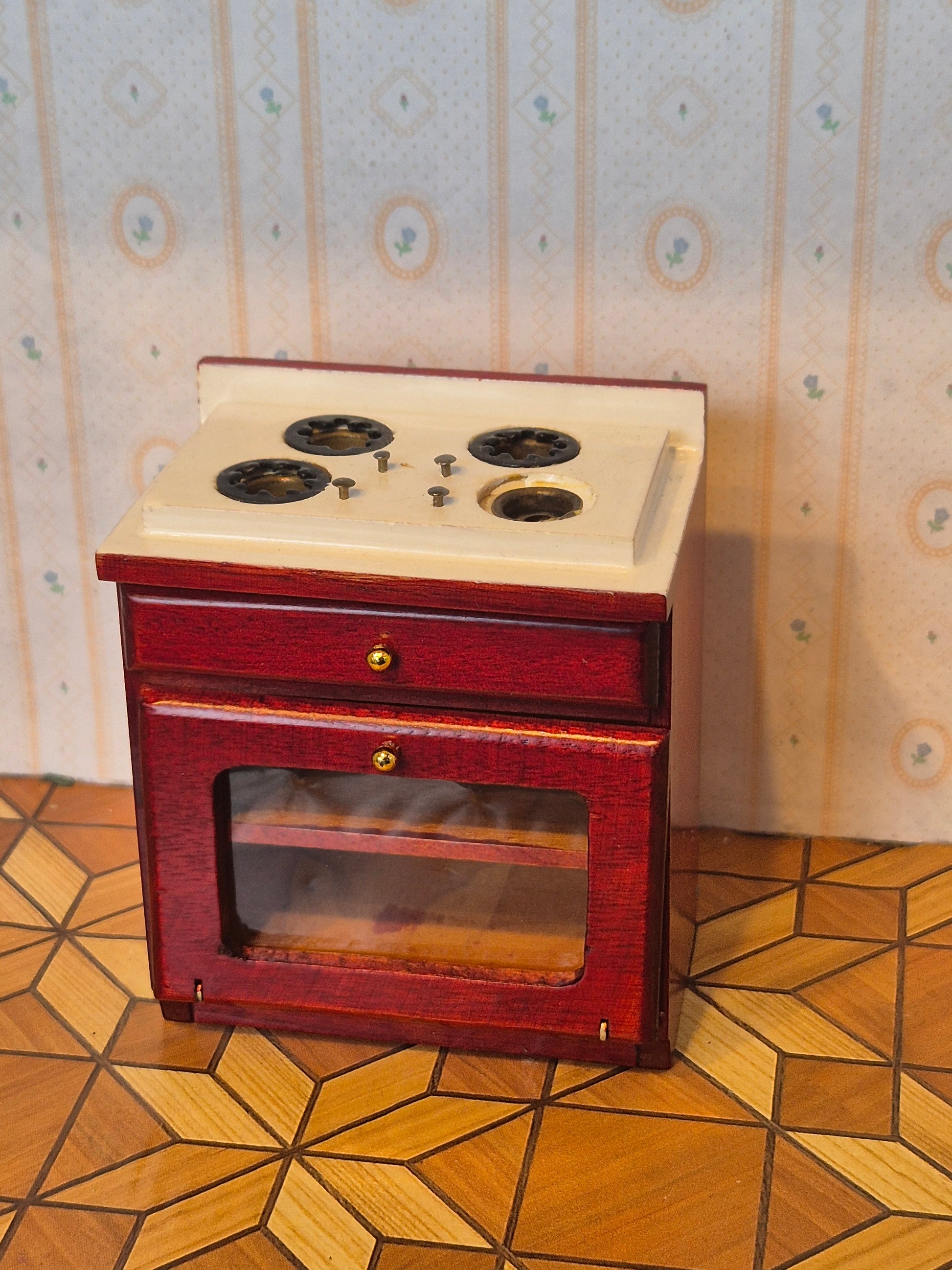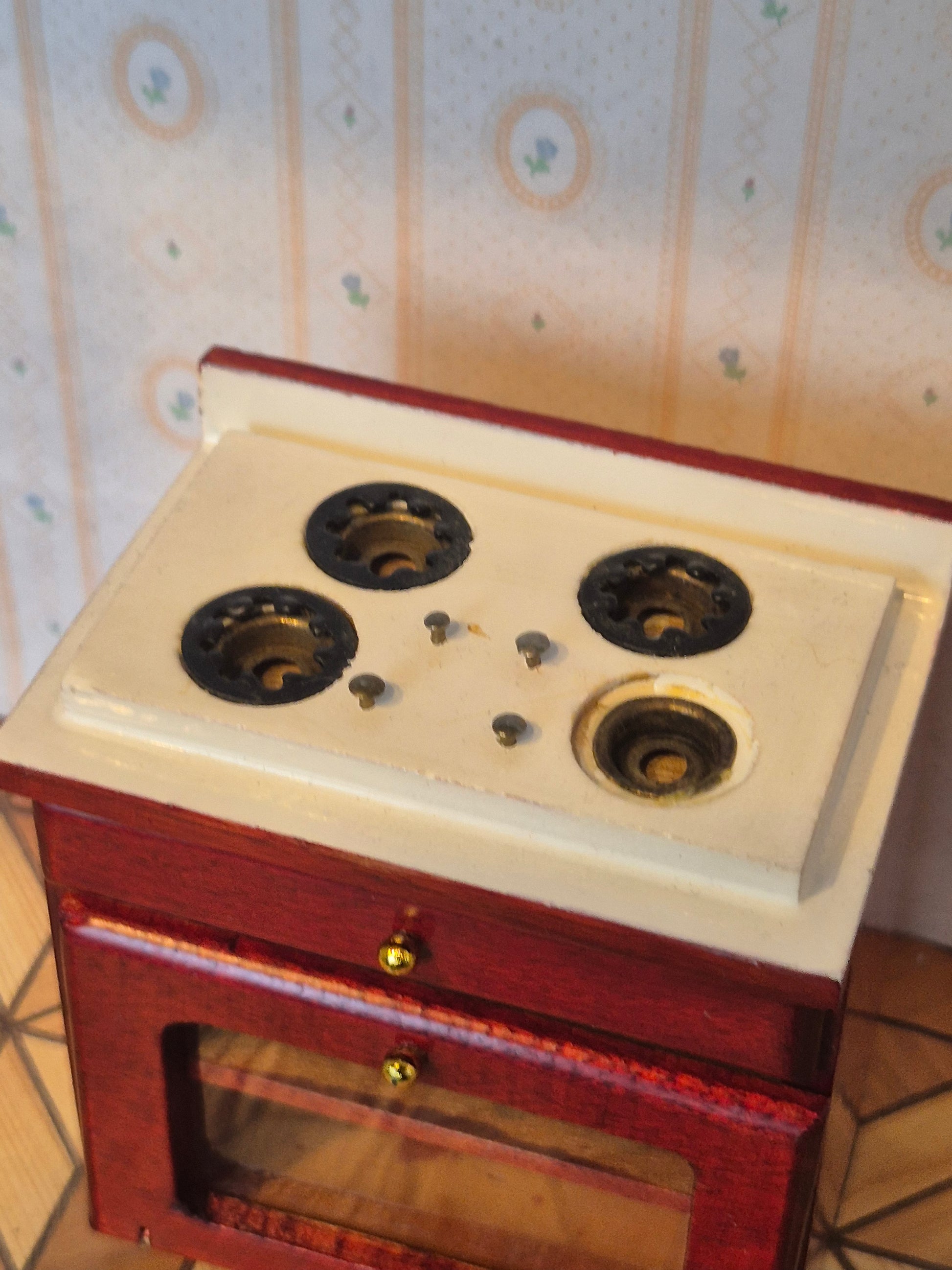 Komfur i rødbrun nuance af træ. Det mangler en kogeplade-ring.