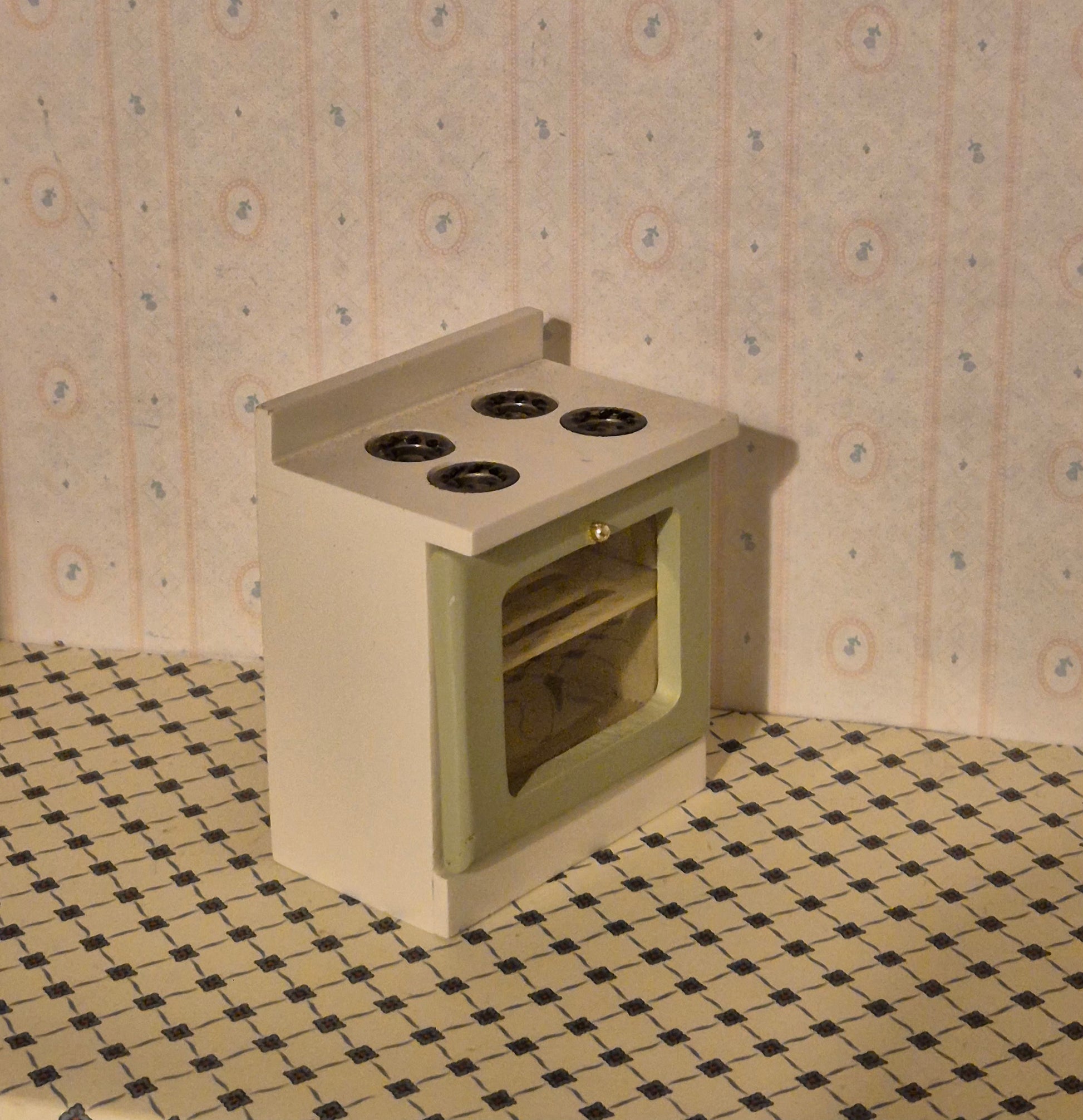 Pænt 1:12 komfur til dukkehus køkkenet. Udmærket stand. Grønt og hvidt. Det er træ.