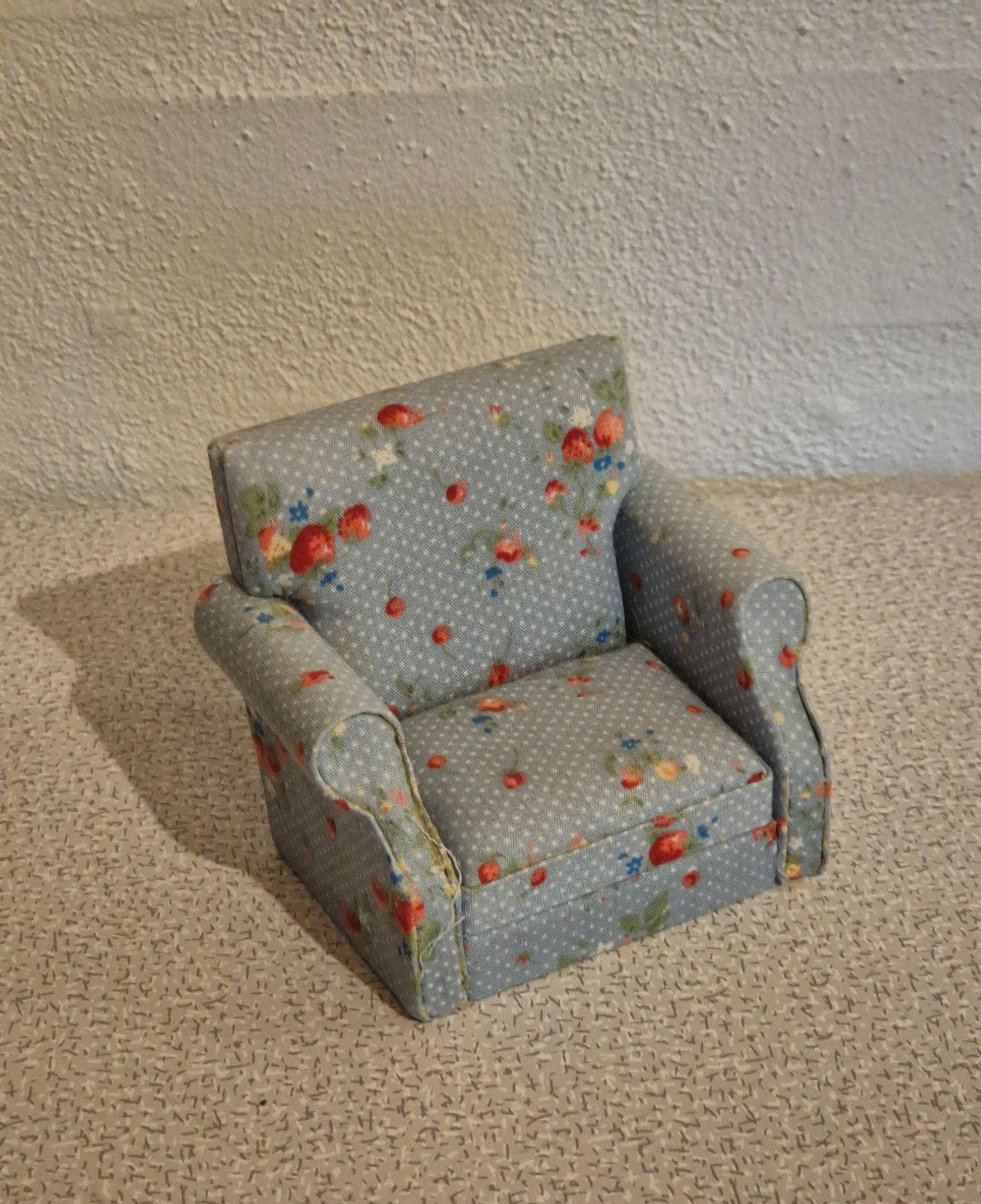 Dukkehus lænestol I lyseblåt blomsterprintet stof. Den er brugt med lidt patina og brugsspor.