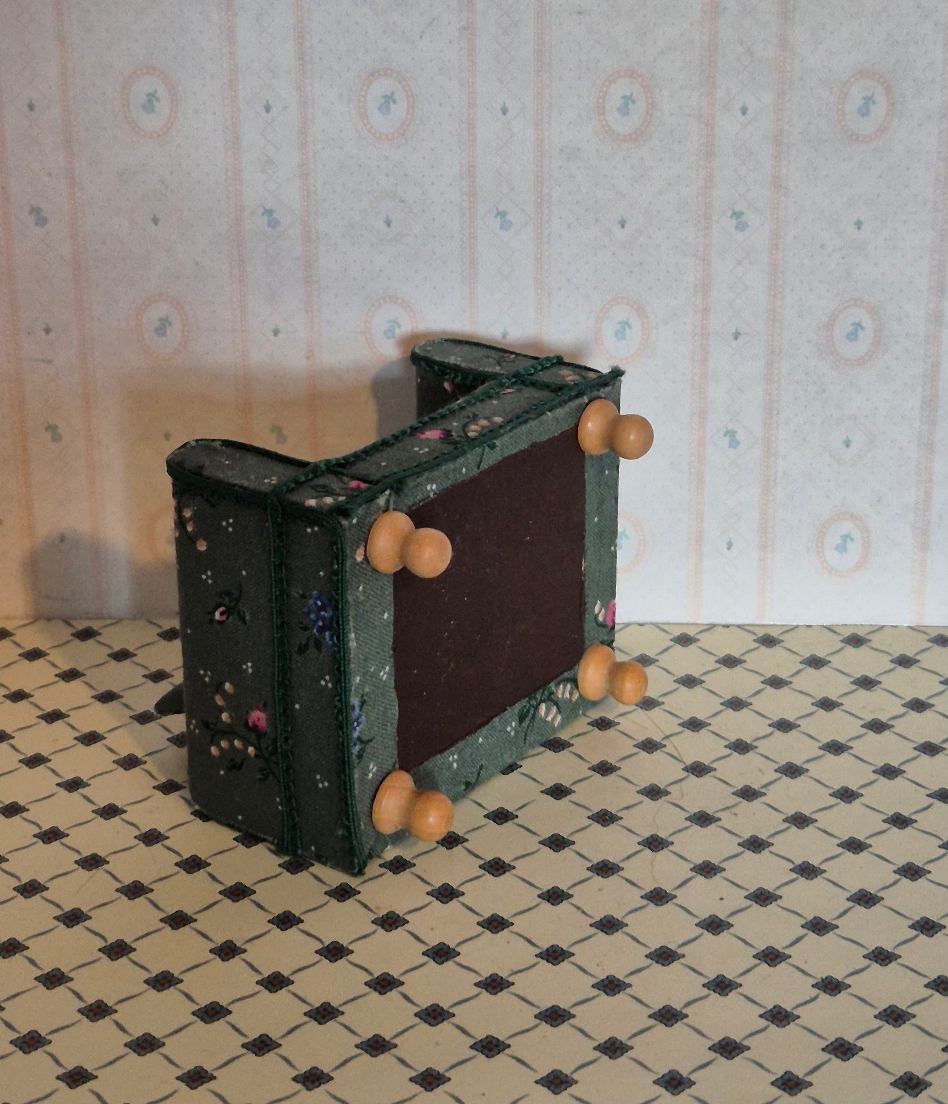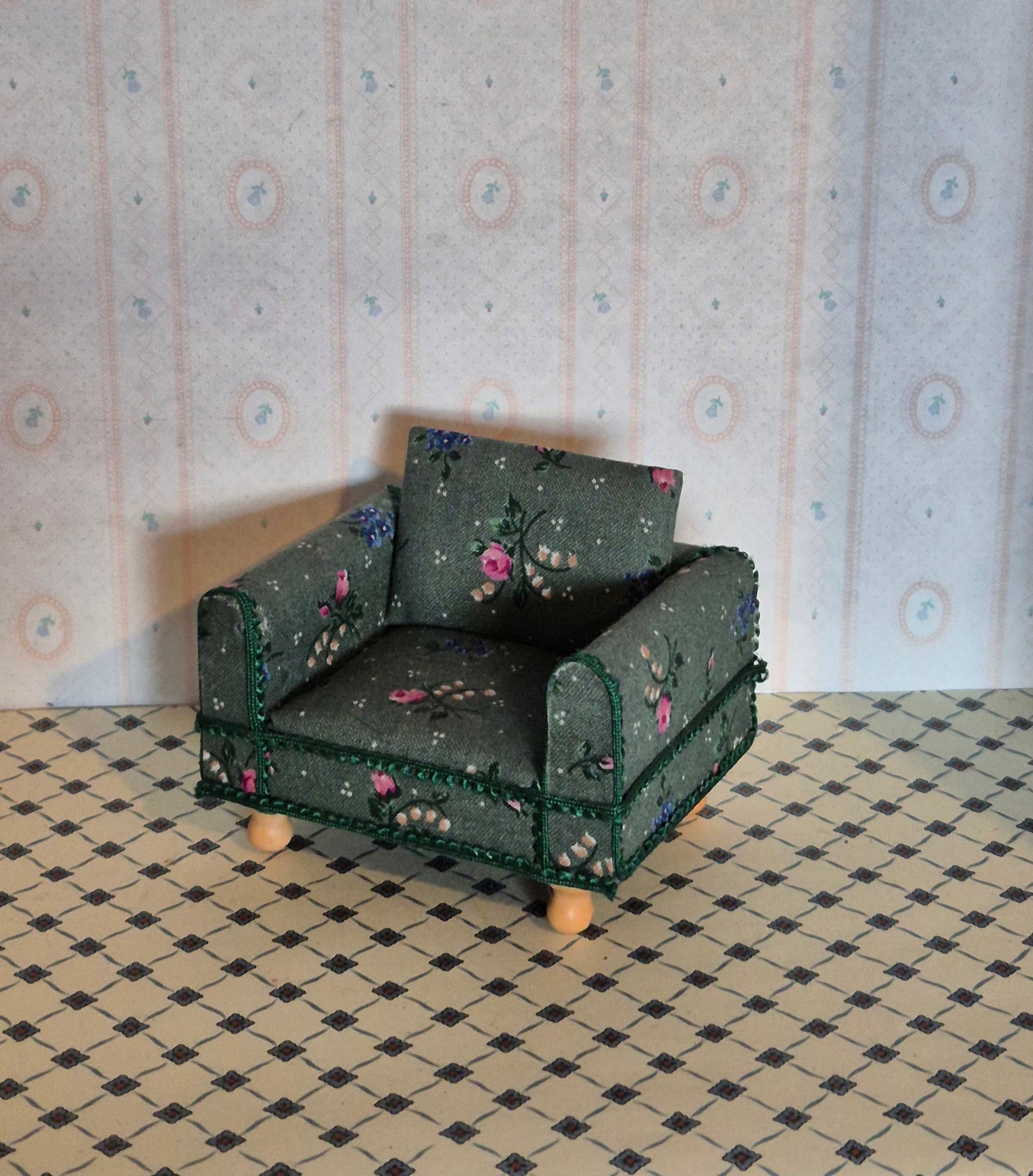 Pæn grøn blomstret lænestol i 1:12, dog lille i skalaen og passer fint til 1:14. Udmærket stand. Muligvis hjemmelavet.