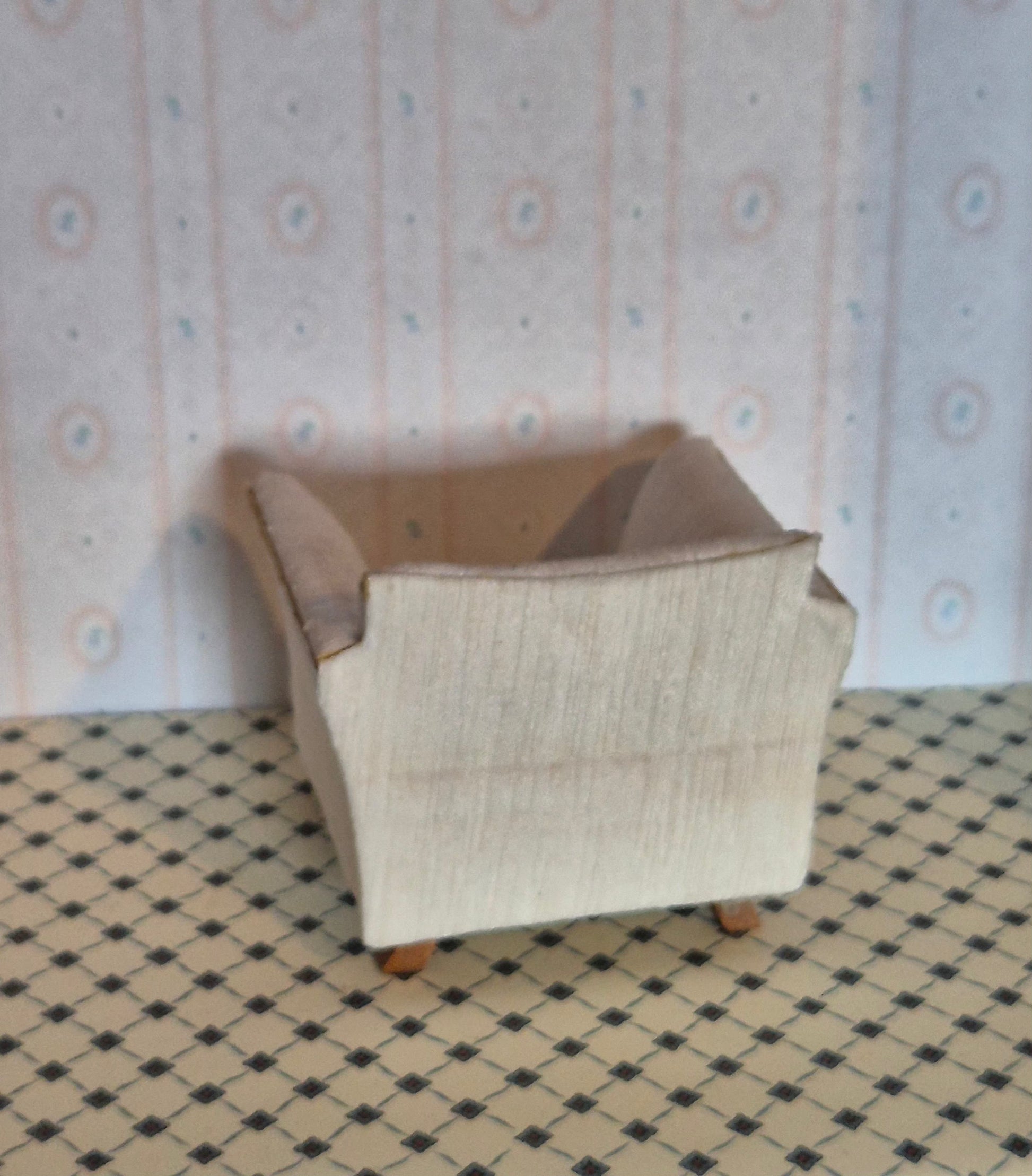 1:12 lænestol i hvidligt glinsende betræk med ru / rillet overflade. Den er robust, bred og gedigen. Udmærket stand med patina og brugsspor, muligvis lidt limrester