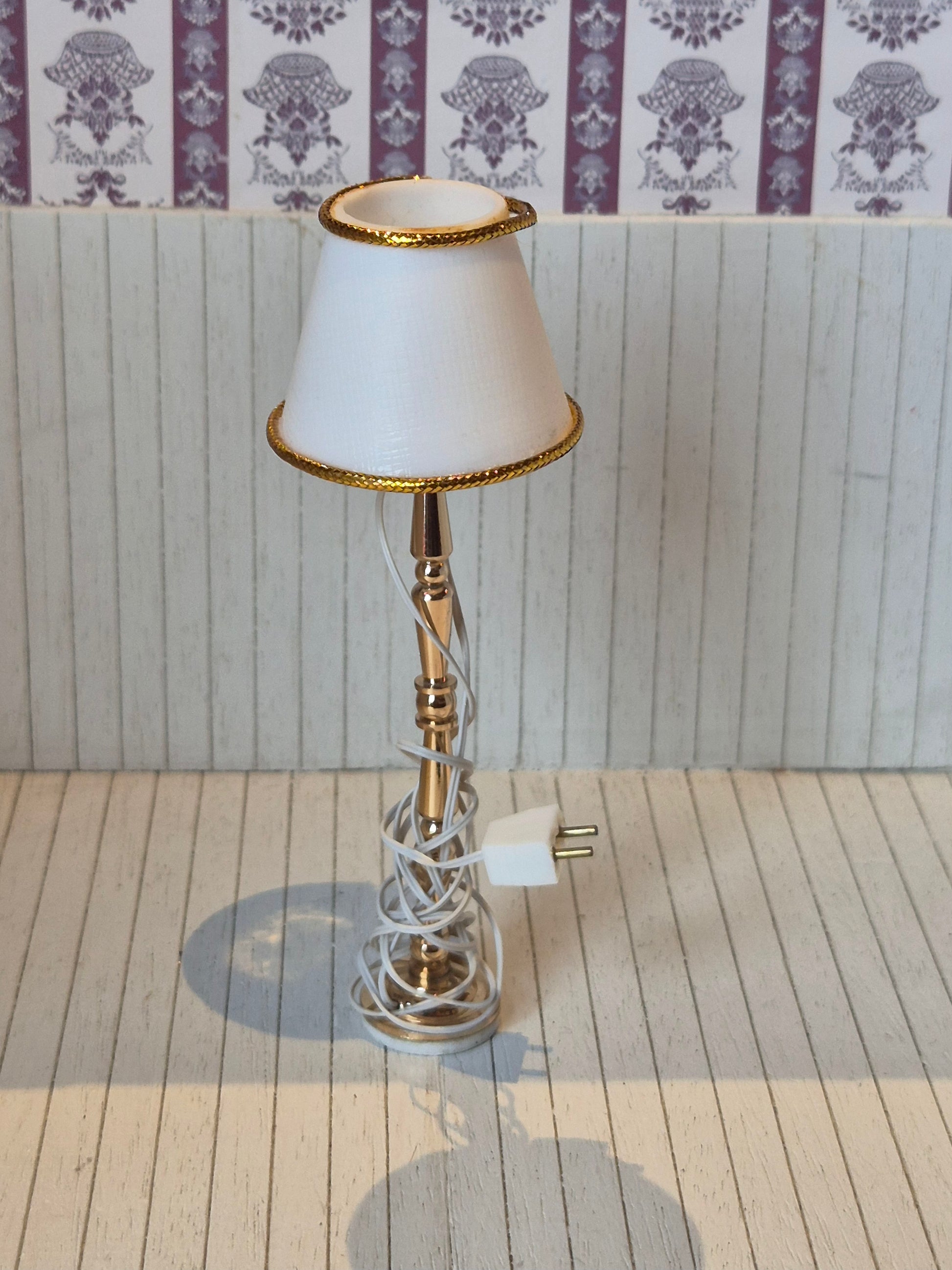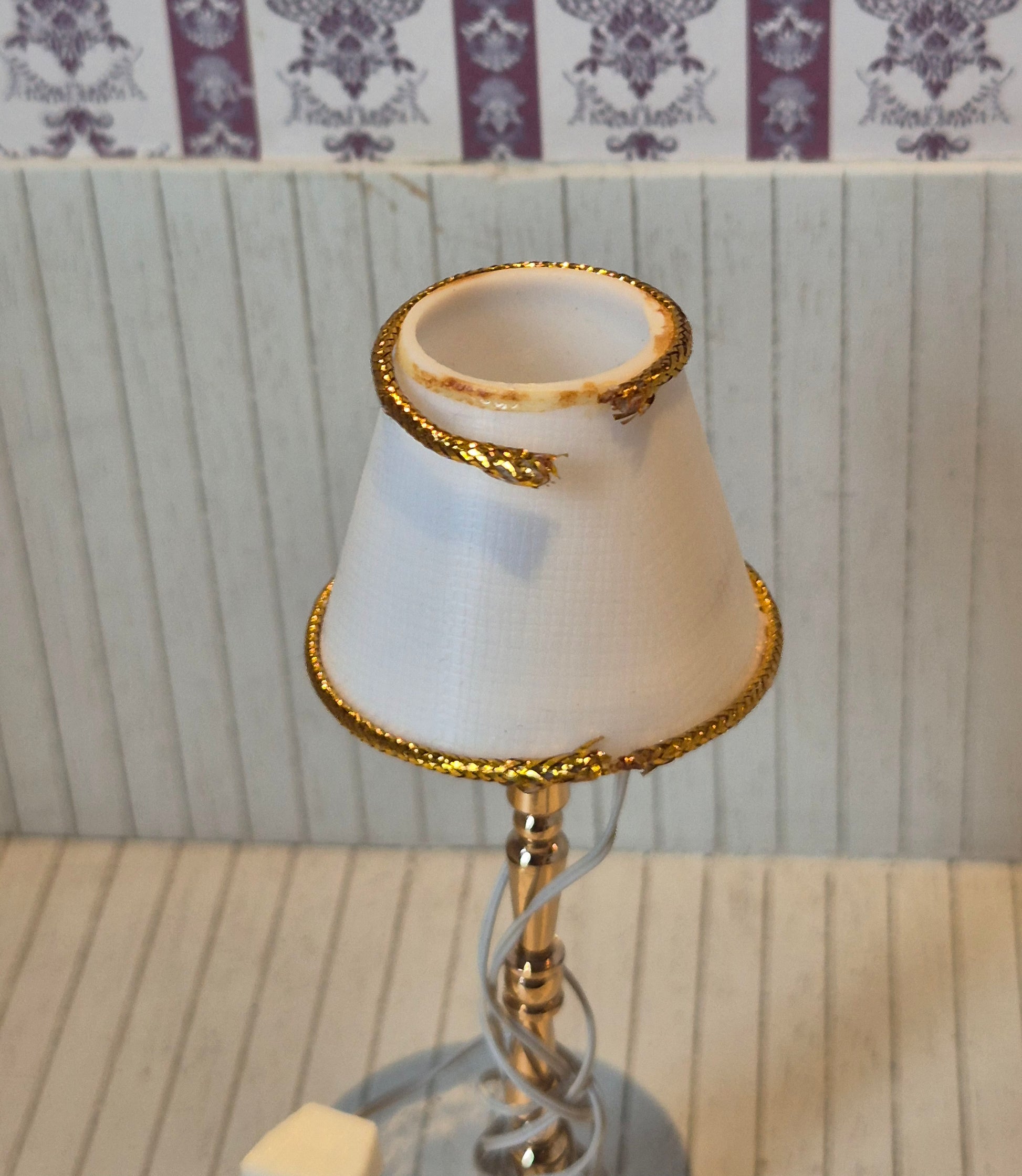 Den har metal stang og hvid plast skærm med gyldent bånd i top og bund. Dette bånd er dog lidt løst.